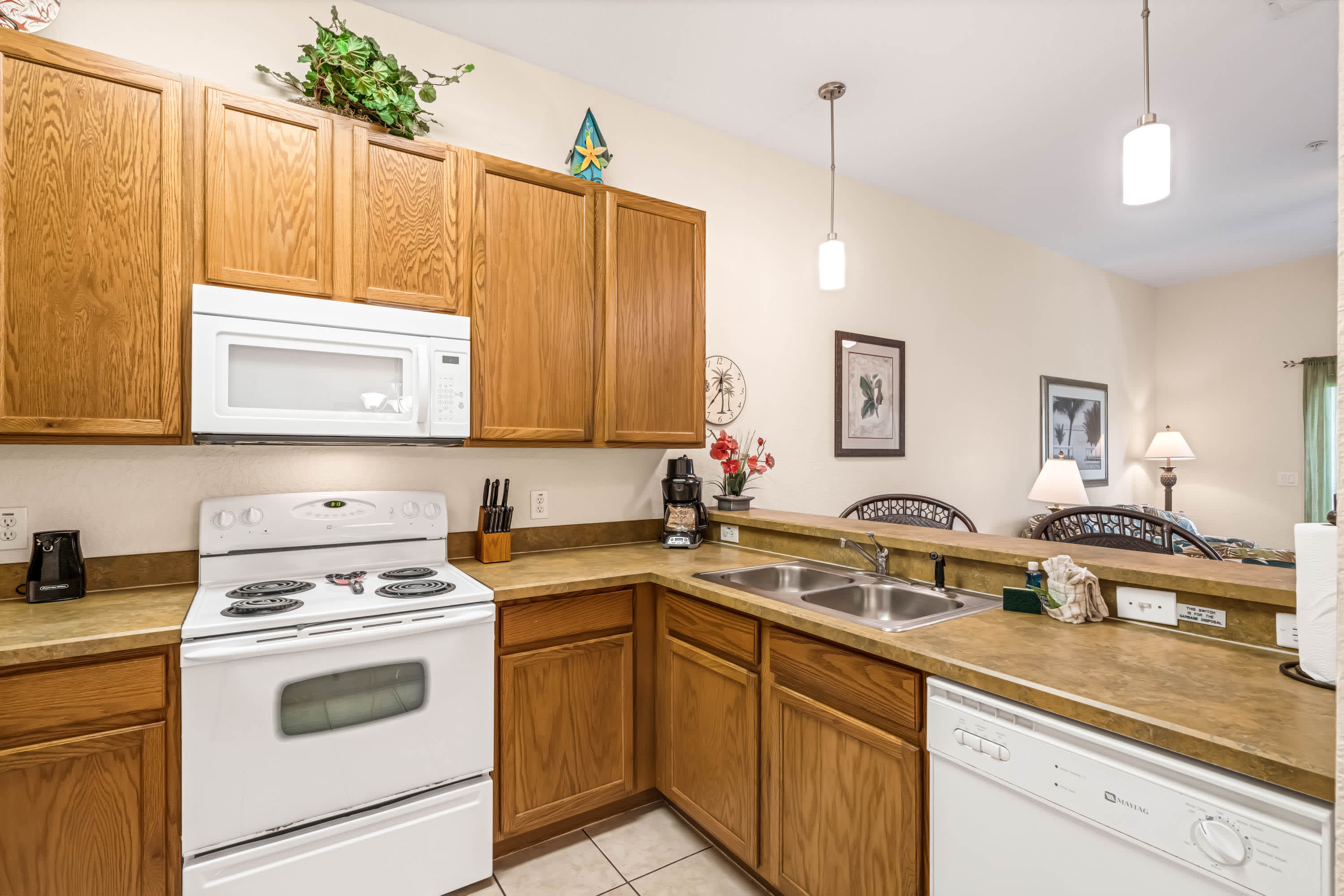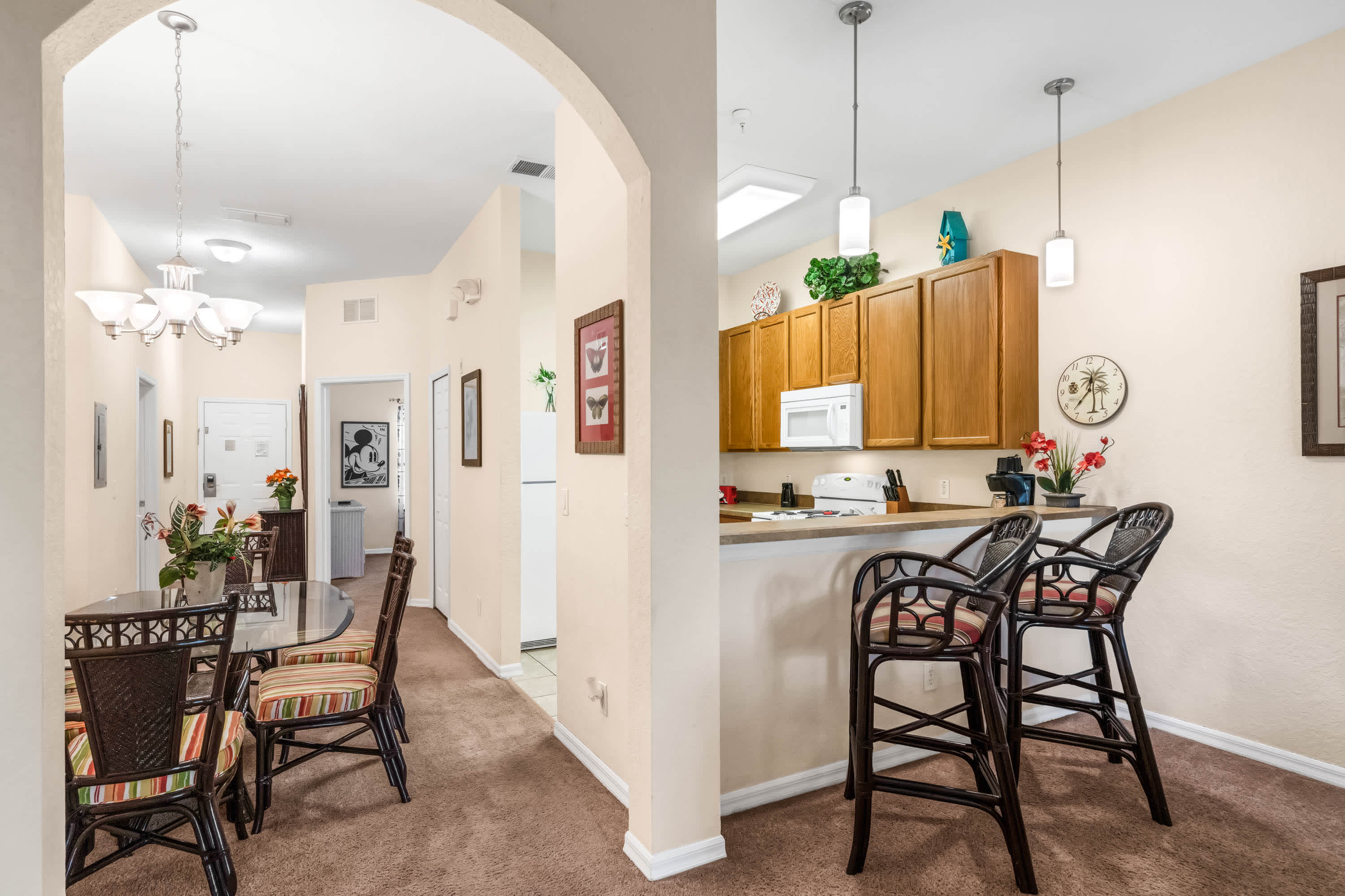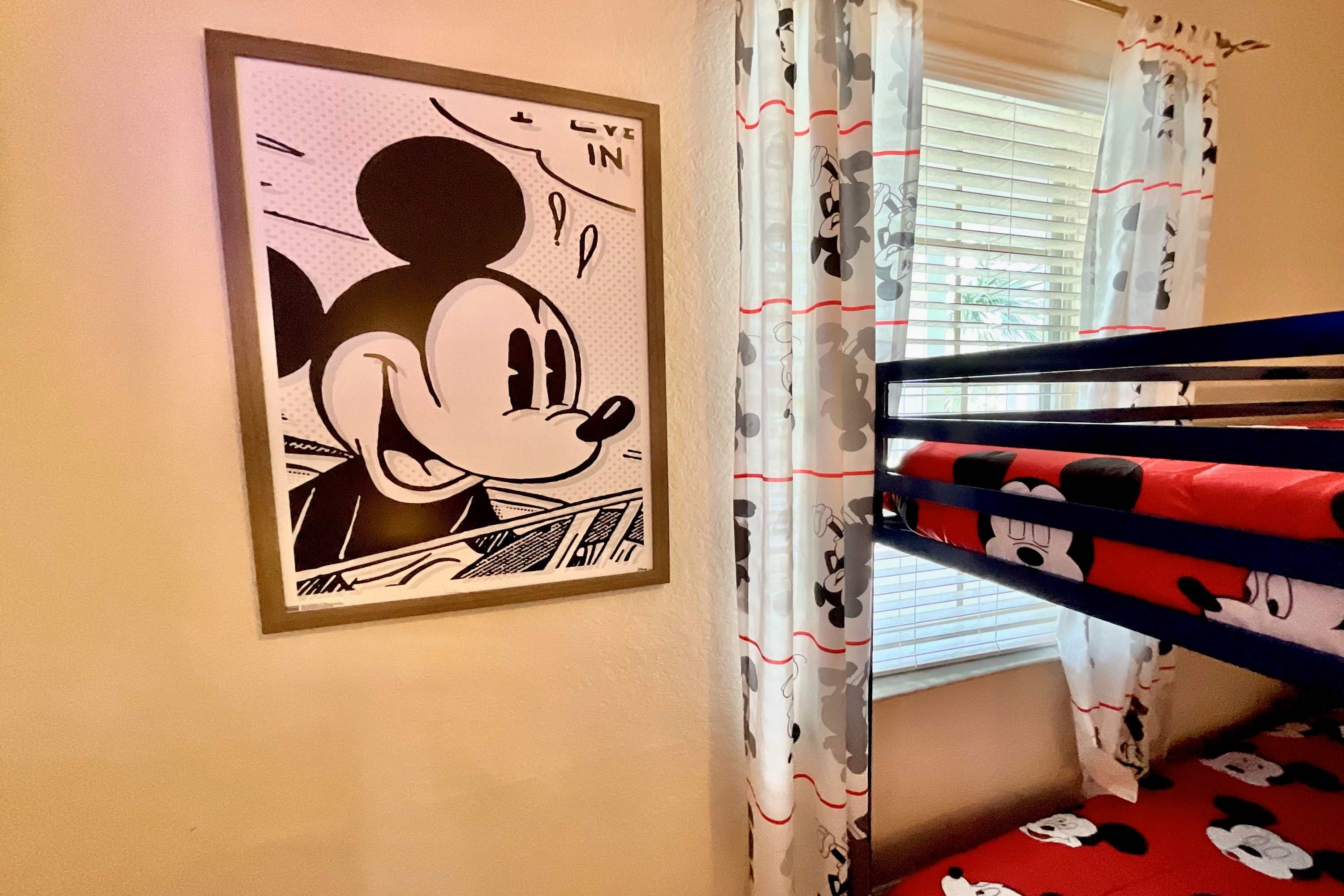 Inside, keep that theme park vibe alive amongst the fun Mickey-themed décor. The bright, spacious living area is a great spot for spending quality time together, furnished with a cable TV and two comfortable sofas. The fully equipped kitchen has all the appliances and utensils you need to whip up a delicious meal or enjoy local takeout, with at-counter dining for 2 or a formal dining area with table and chairs for 6.