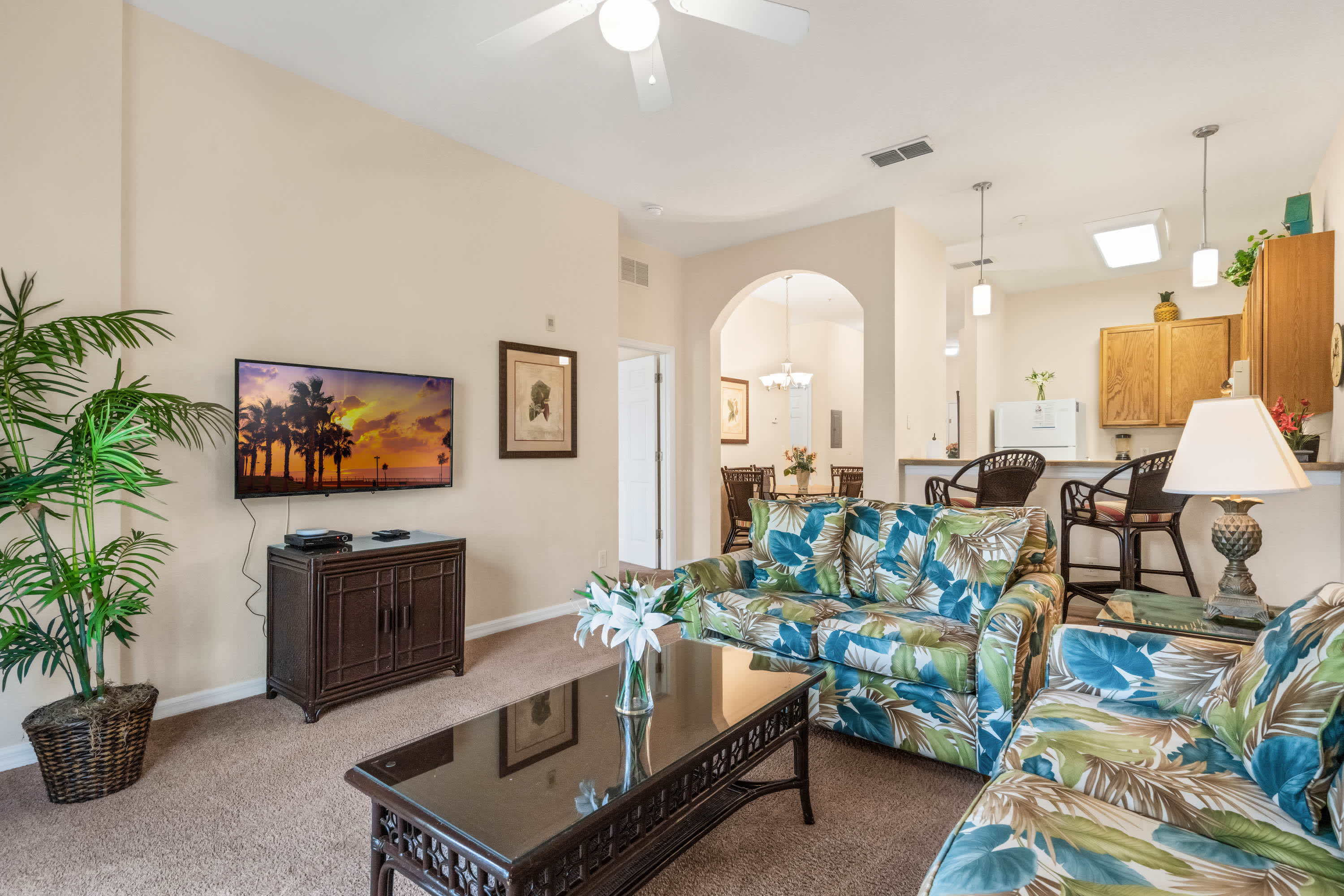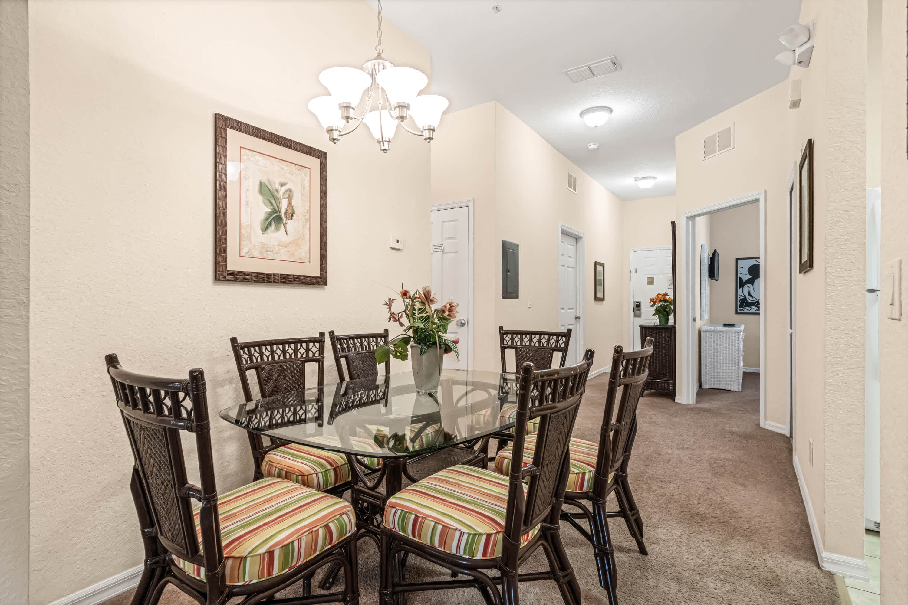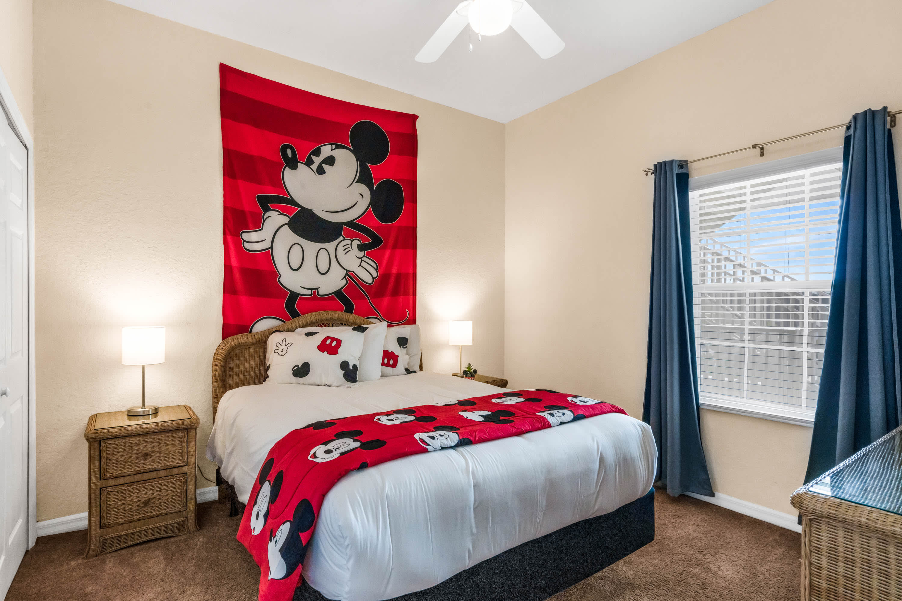 Inside, keep that theme park vibe alive amongst the fun Mickey-themed décor. The bright, spacious living area is a great spot for spending quality time together, furnished with a cable TV and two comfortable sofas. The fully equipped kitchen has all the appliances and utensils you need to whip up a delicious meal or enjoy local takeout, with at-counter dining for 2 or a formal dining area with table and chairs for 6.