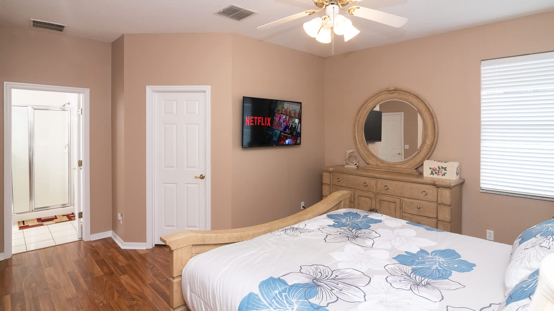 Bedroom #4 has a king size bed, smart tv, and ensuite bathroom with dual sinks, soaking tub, and walk-in shower.