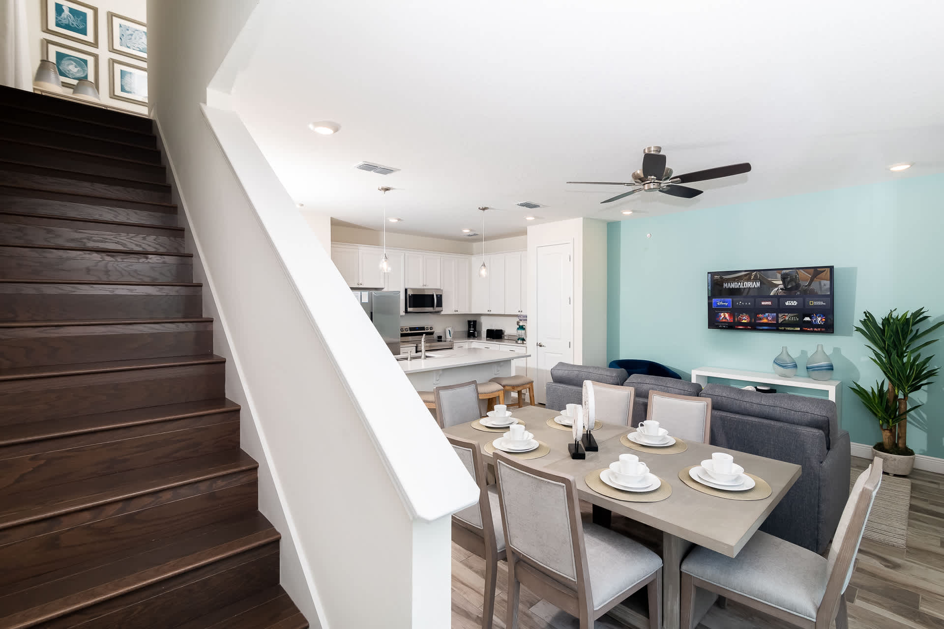 The home features an open concept design with seamless flow between kitchen, dining, and living areas, allowing your group to enjoy quality time together even if everyone is doing their own thing! With fun and adventure filling your days, you’ll love the cozy couch where you can unwind with a movie on the smart tv. Adjacent, the bright and modern kitchen is equipped with stainless steel appliances and all the tools you’ll need to make delicious meals from home. Additional small appliances for your convenience include a toaster, coffee maker, and margarita maker (because it’s 5 o'clock somewhere after all). Enjoy drinks and casual bites at the kitchen counter with barstool seating, or gather together for a family-style meal at the dining table set for 6.