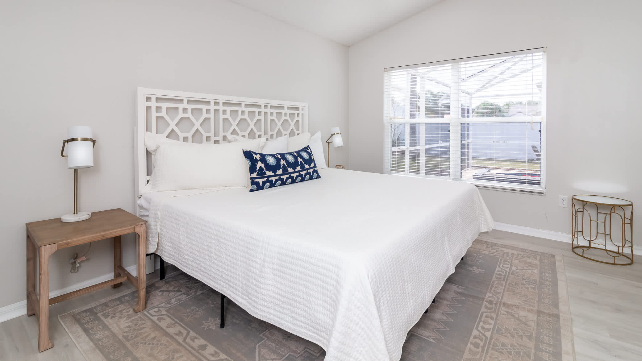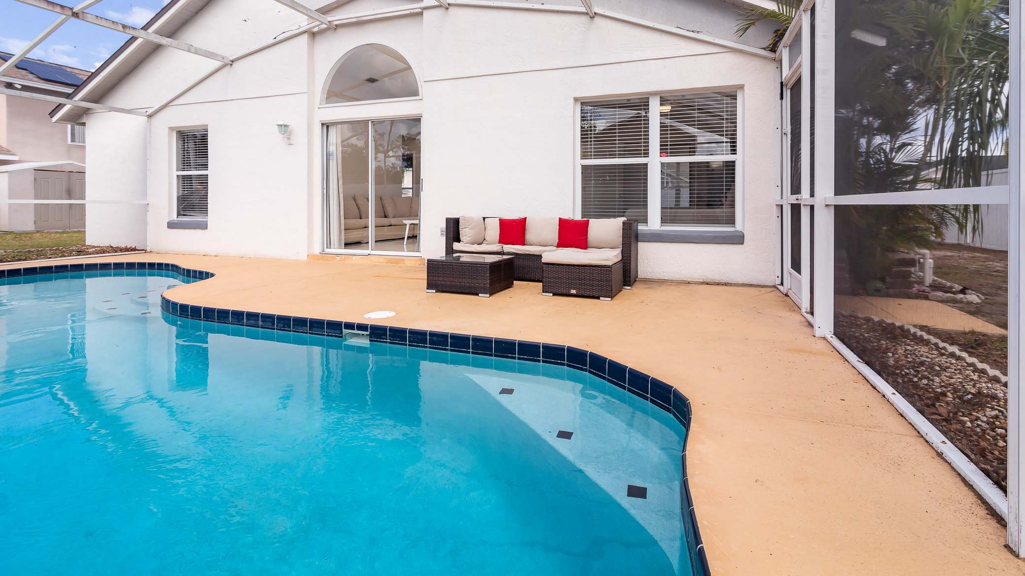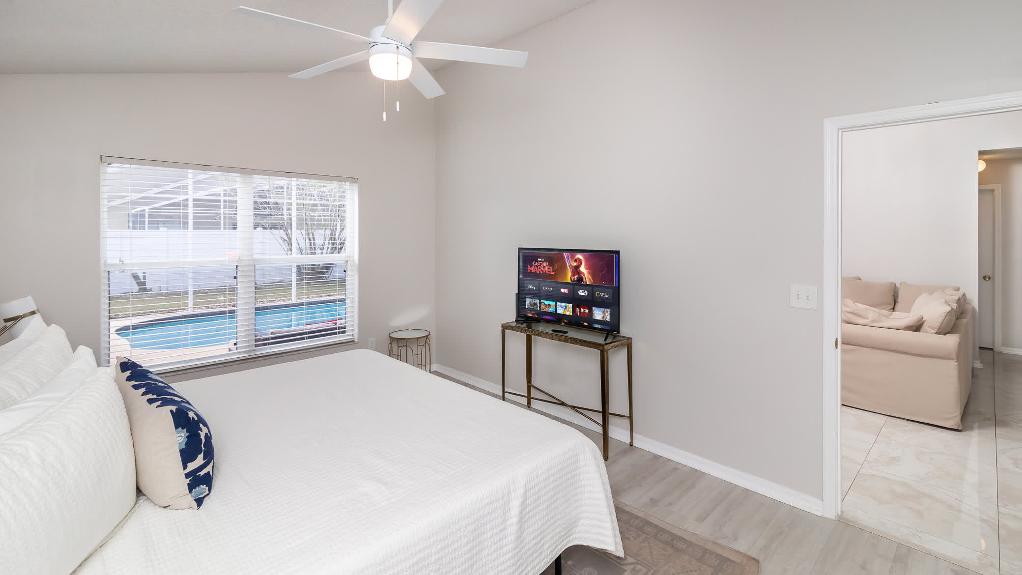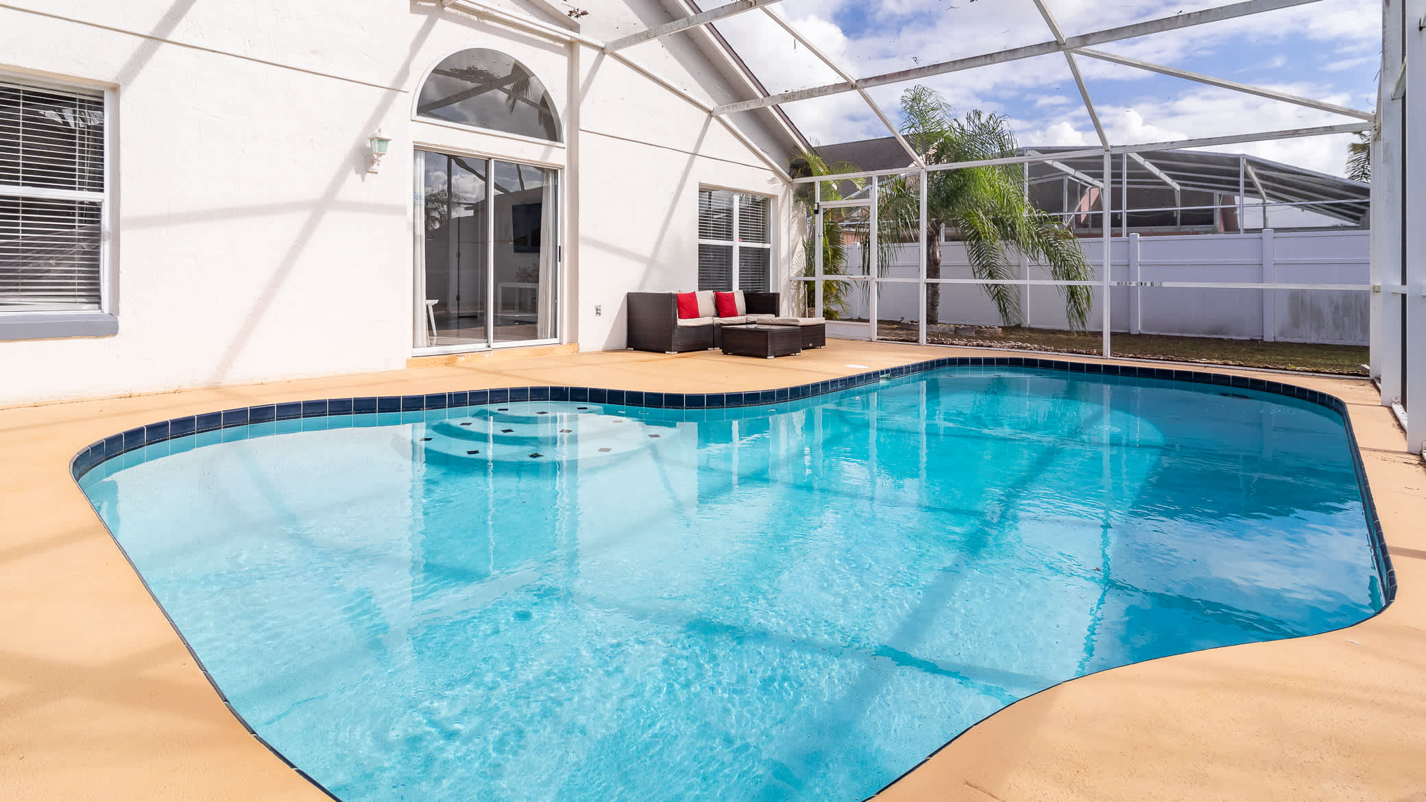 Each guest has space to relax in the shared living spaces, while the open concept layout allows the whole group to remain together. While some choose to lounge on the spacious sectional couch with a movie on the smart tv, others can be enjoying a snack at the kitchen counter. The cook of the group can visit while also making use of the stainless steel appliances, coffee maker, and toaster. Meals at home can be shared at the dining table for 5 or perhaps poolside in your screened-in pool and patio area.