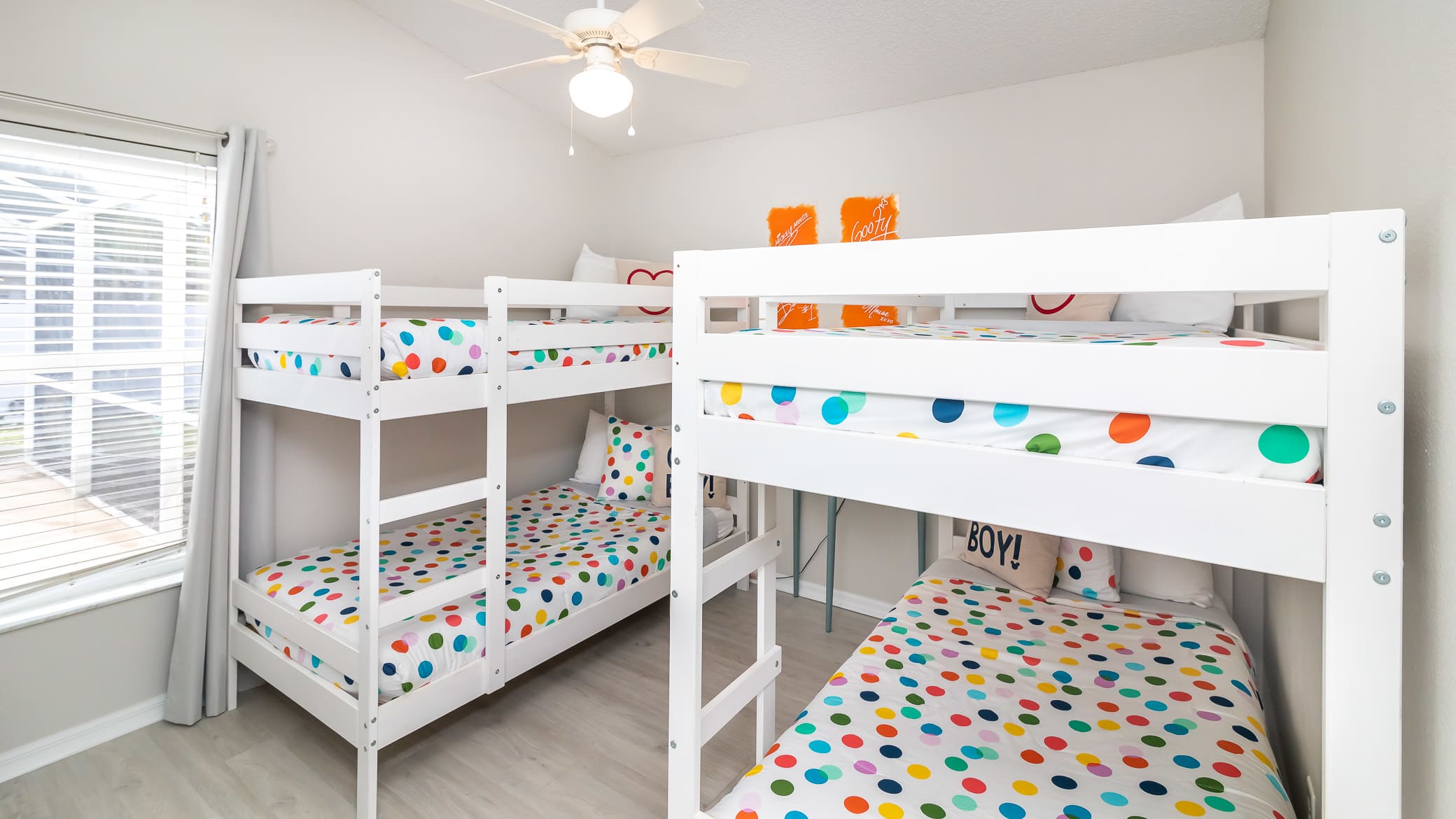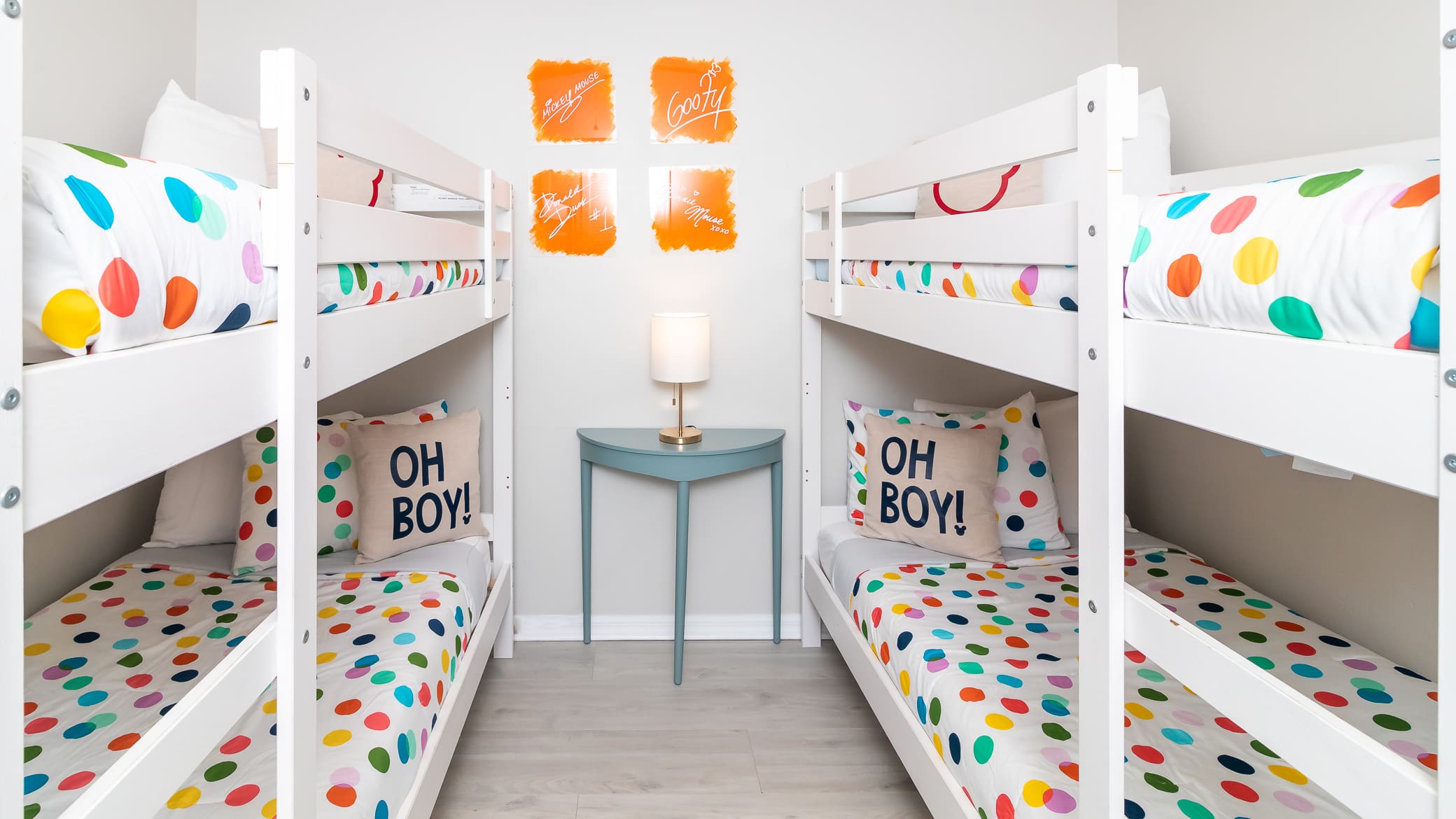 Bedroom #3 has 2 sets of twin size bunk beds, colorful linens, and subtle design touches featuring favorite characters like Mickey Mouse and Goofy.