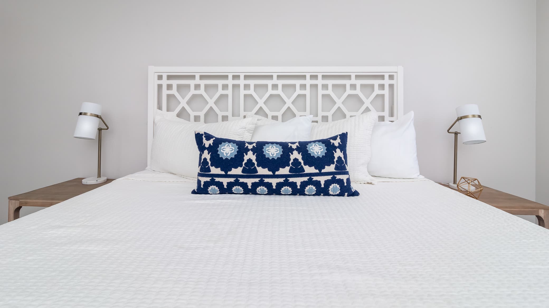 Bedroom #1 is the primary suite with a king size bed, smart tv, and ensuite bathroom with dual sinks and walk-in shower.