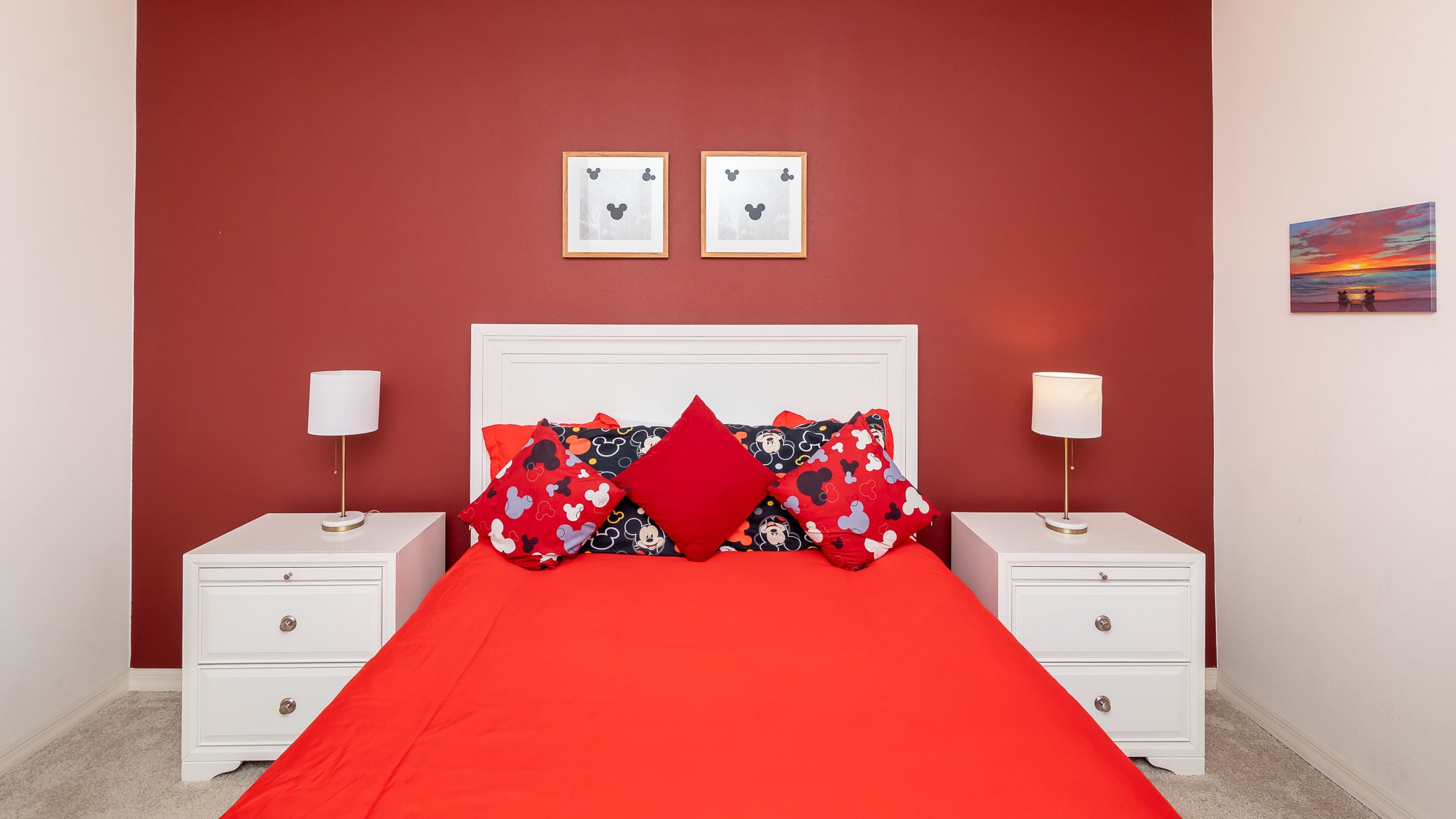 Bedroom #2 has a queen size bed, smart tv, and classic Mickey Mouse decor.