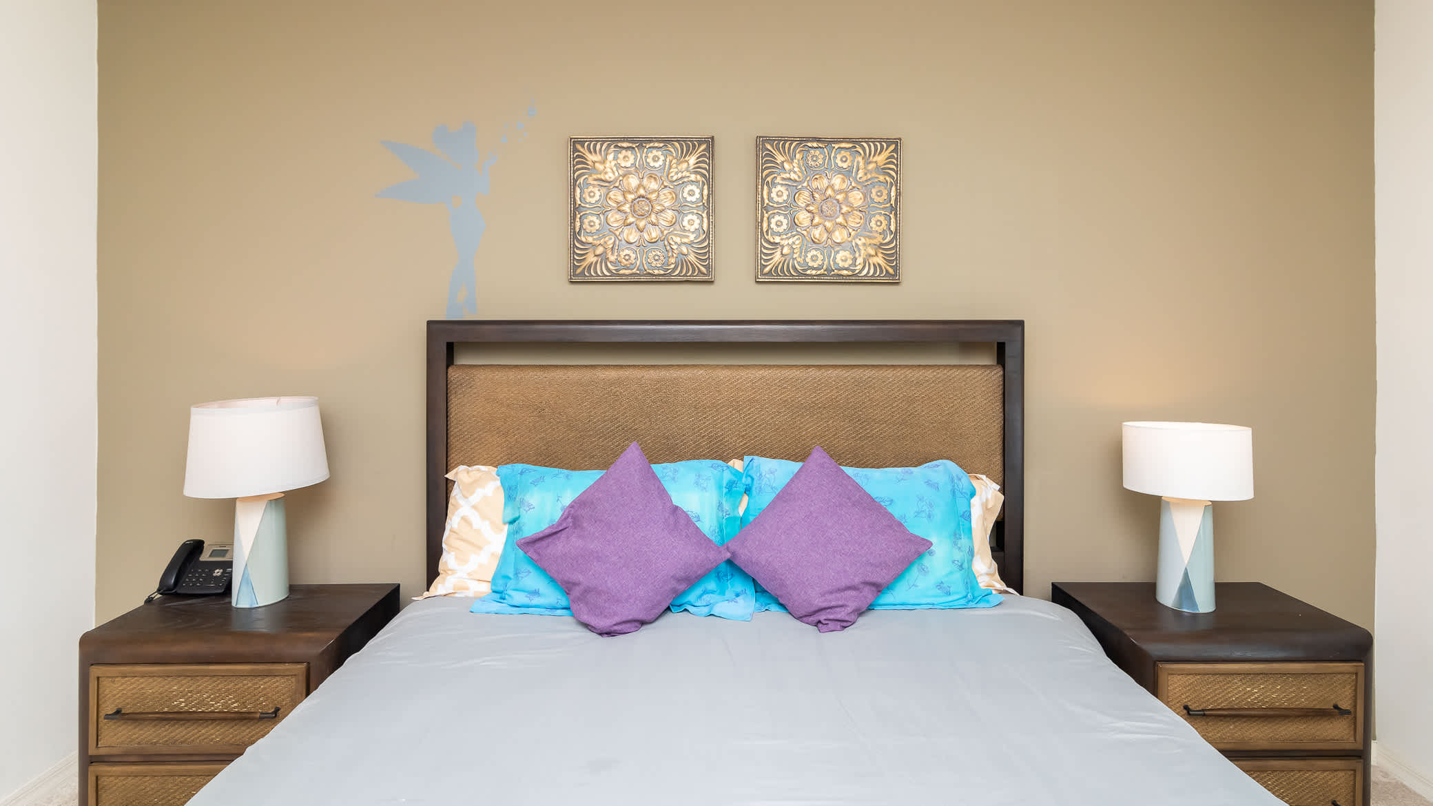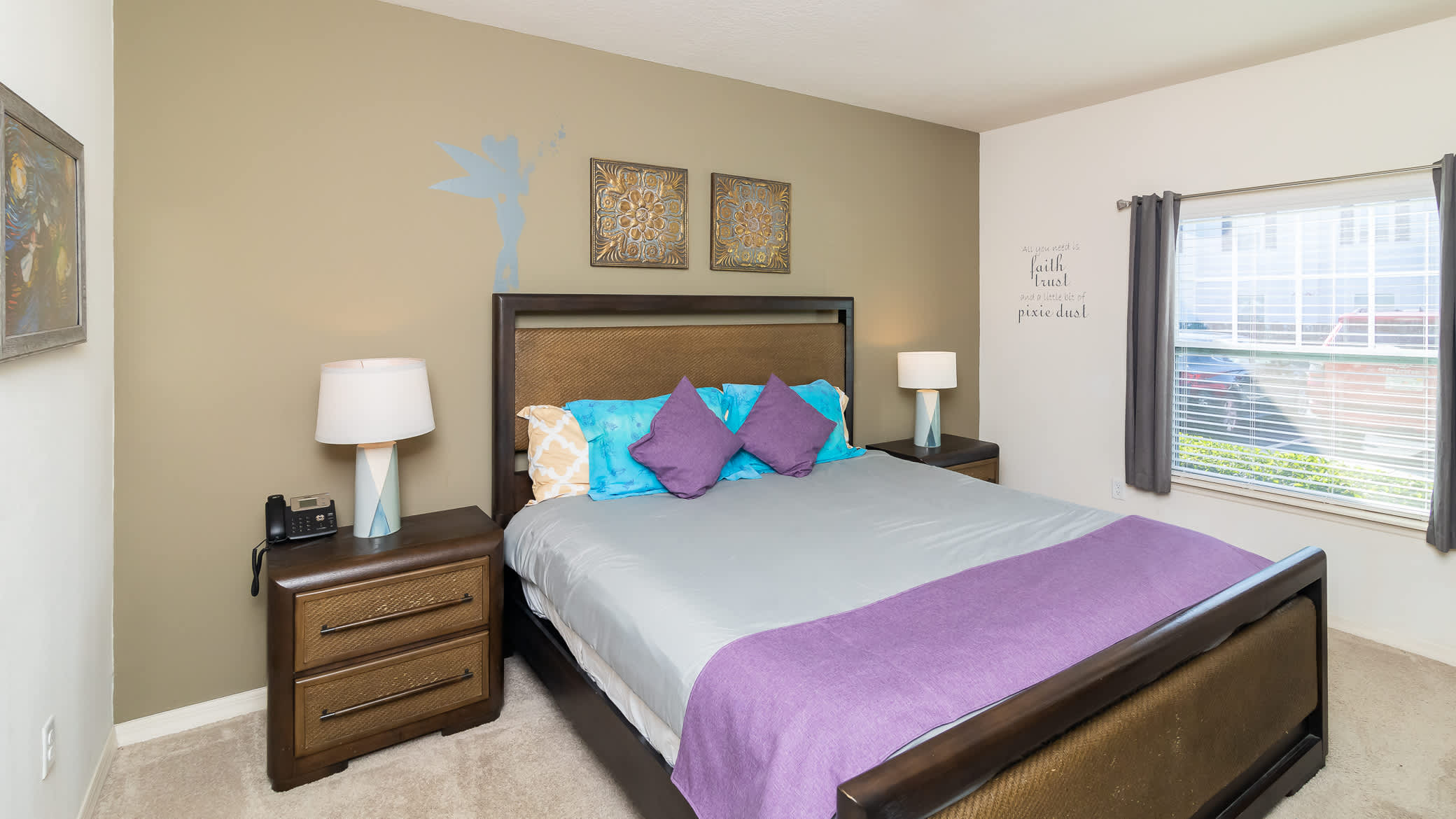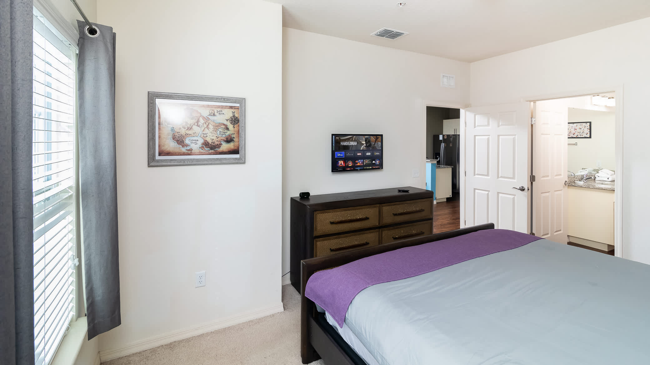 Bedroom #1 is the primary suite with a subtle Peter Pan theme, king size bed, smart tv, and ensuite bathroom with dual sinks and shower/tub combo.