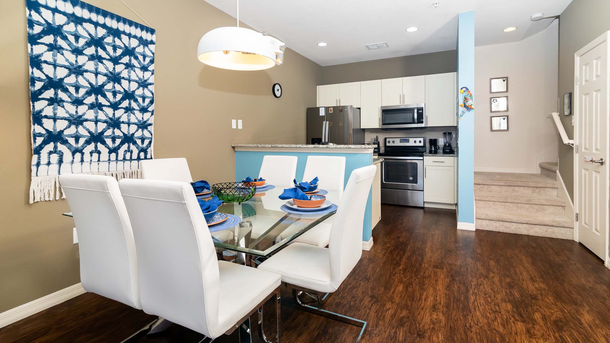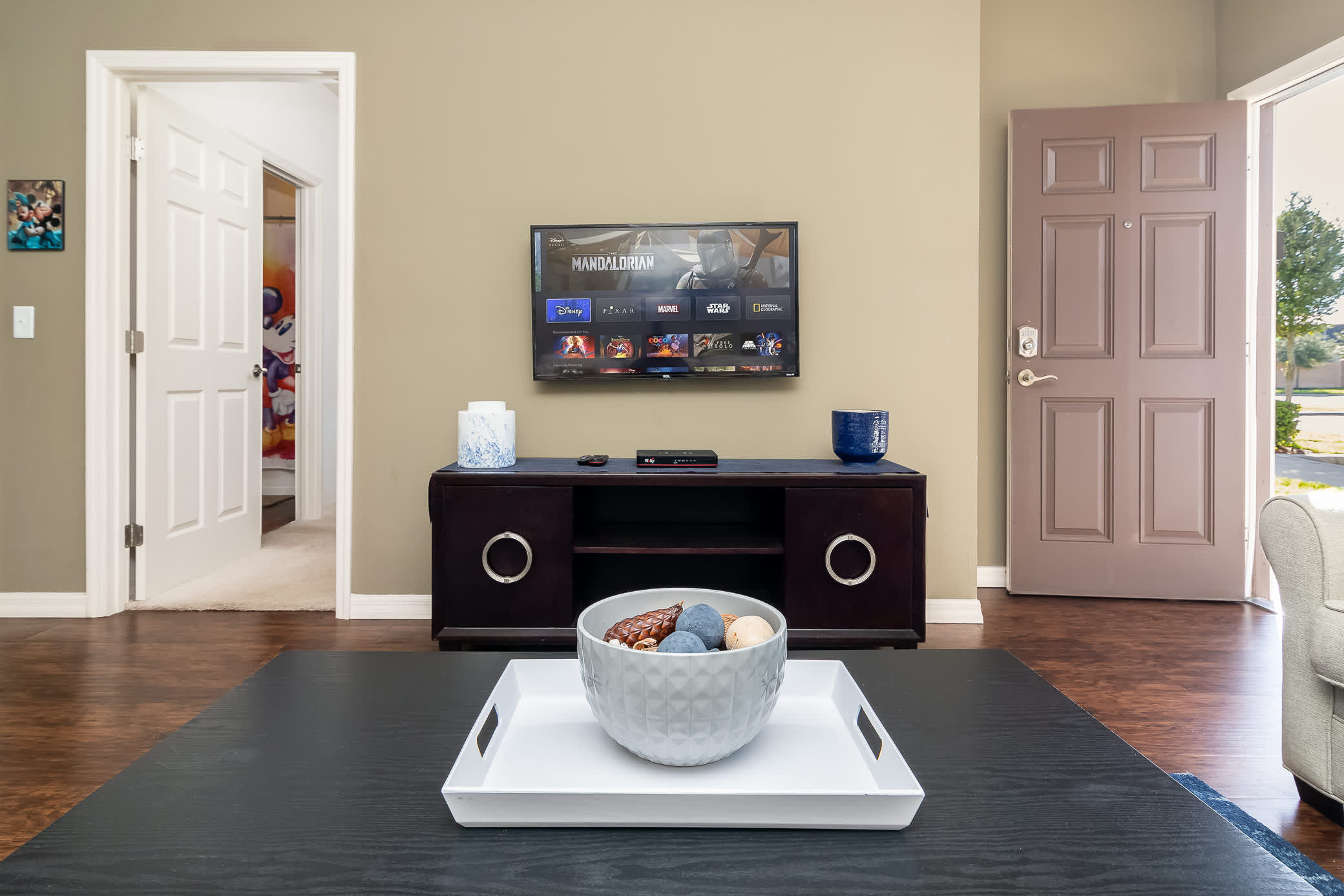 The home’s first level consists of an open concept gathering space. A hub of activity, the kitchen has stainless steel appliances, cookware, coffee machine, blender, and toaster for convenient meals at home. The dining table is just off the kitchen with seating for 6. Between meals, excursions, and enjoying the onsite amenities like the outdoor pool, hang out on the cozy couches surrounding a large smart tv where you can enjoy your favorite Disney movies ahead of meeting your favorite characters in person.