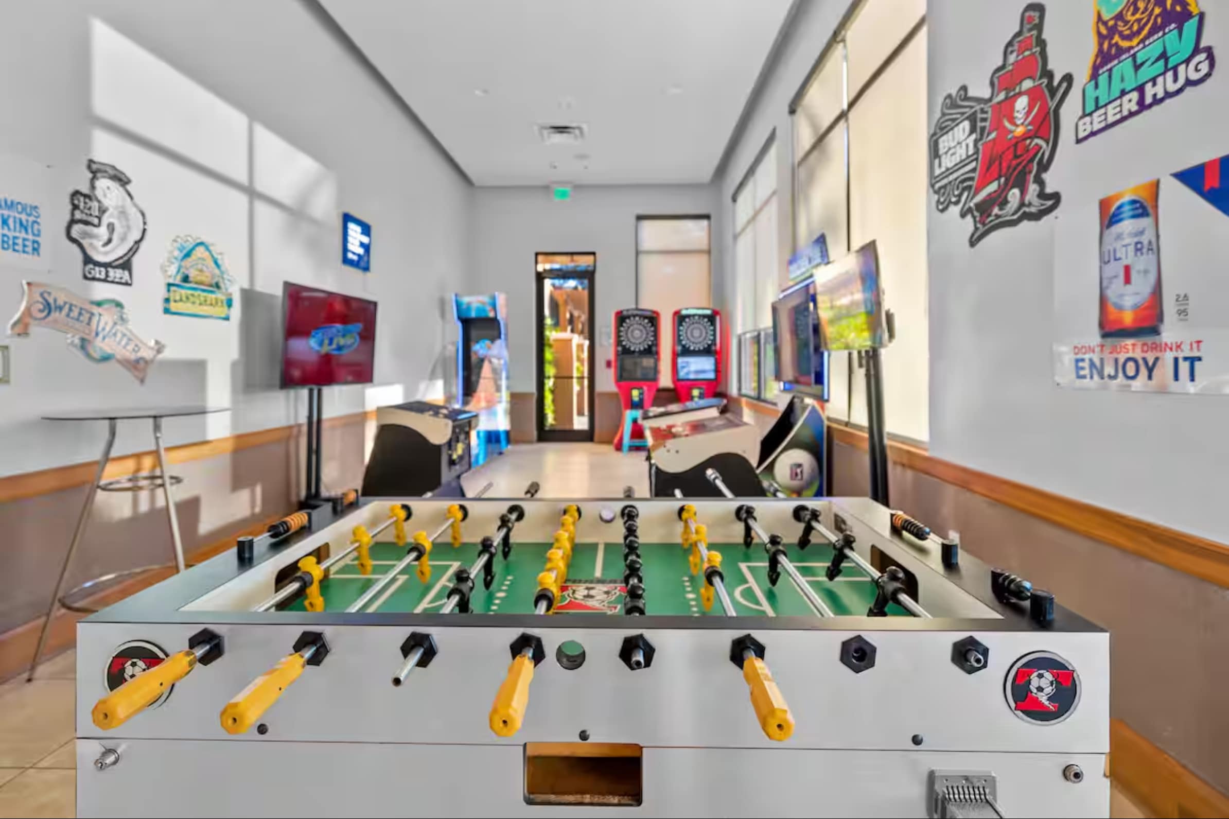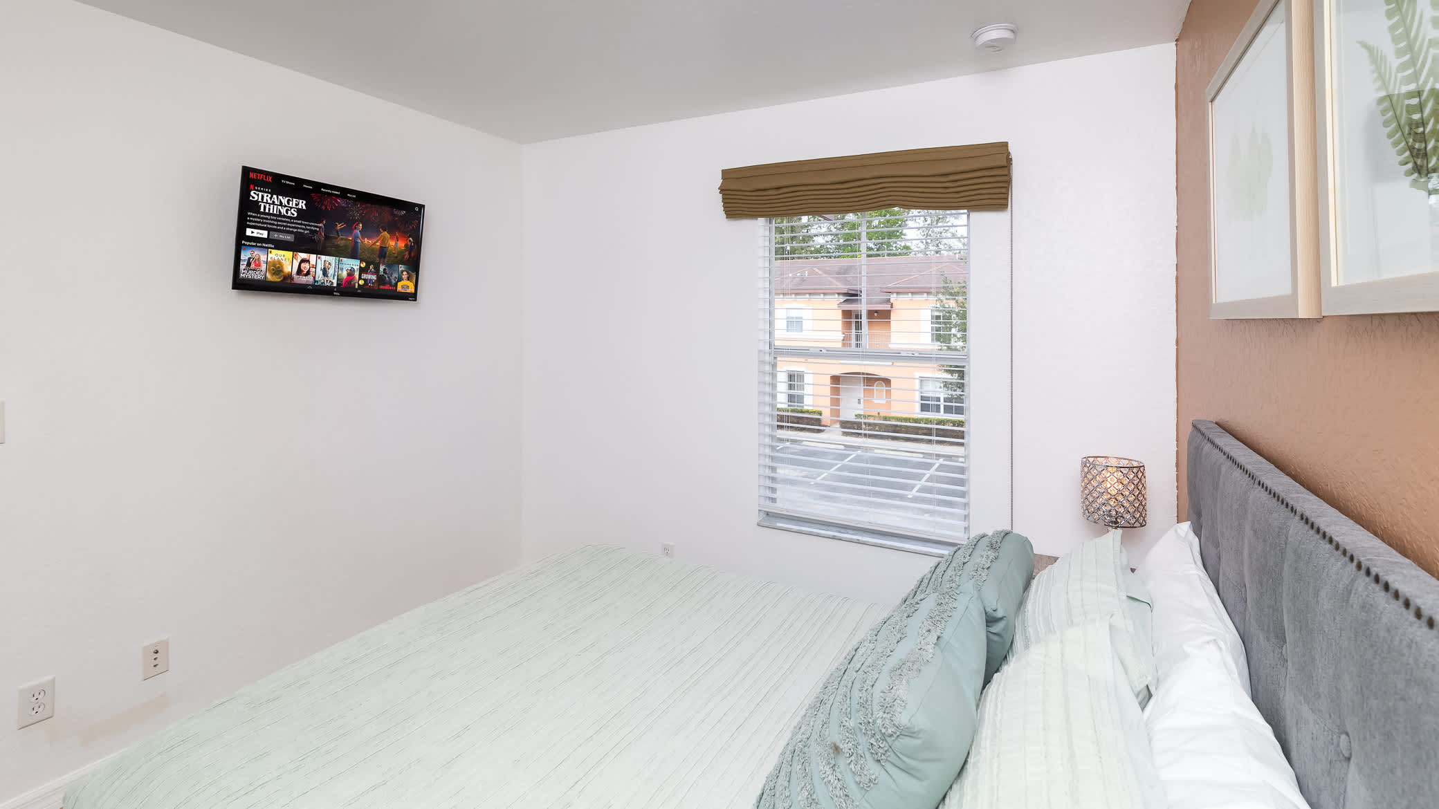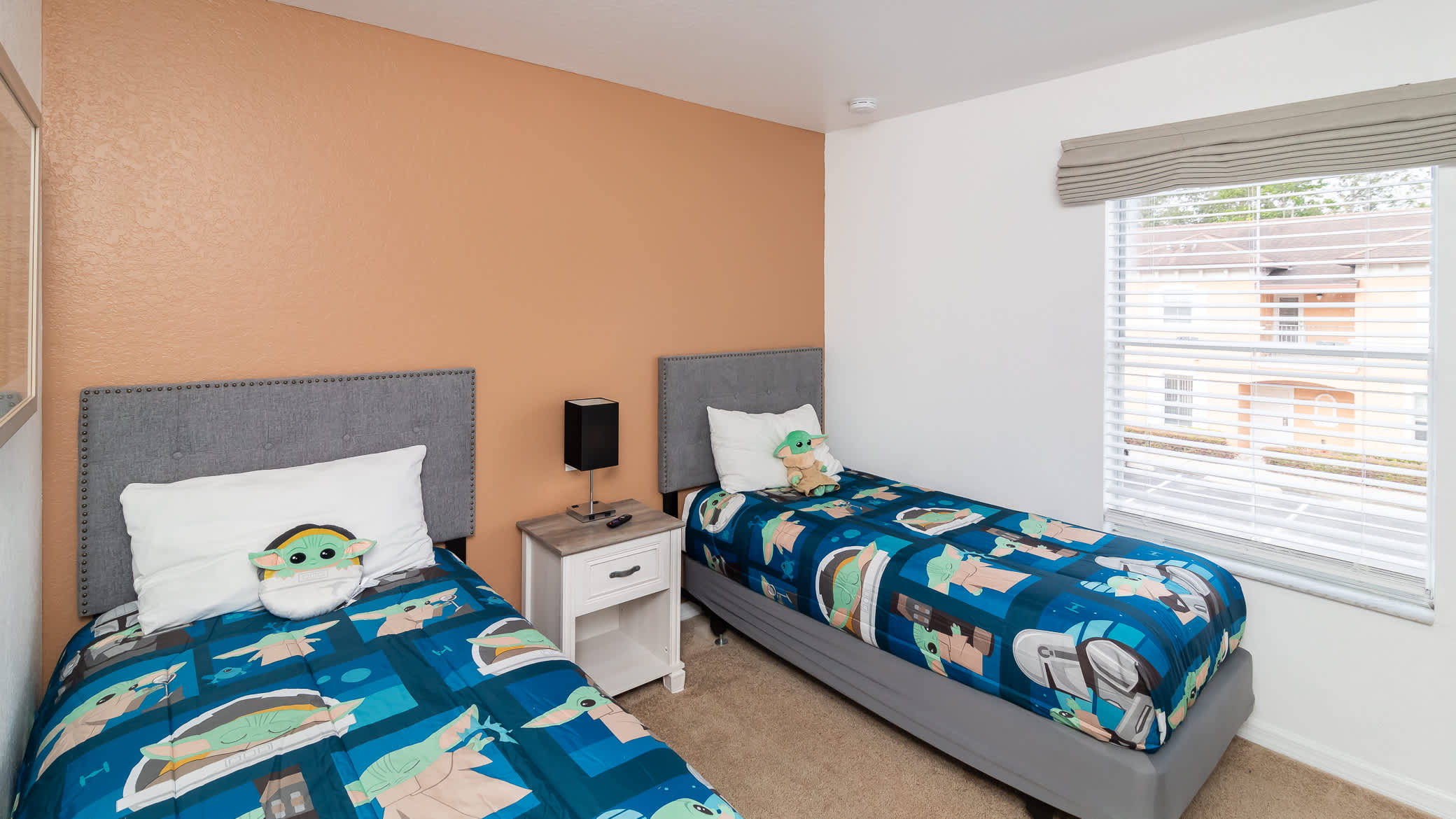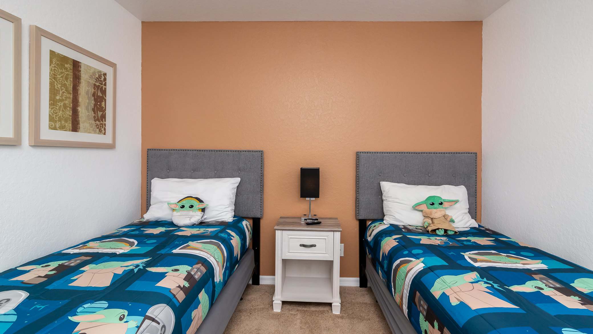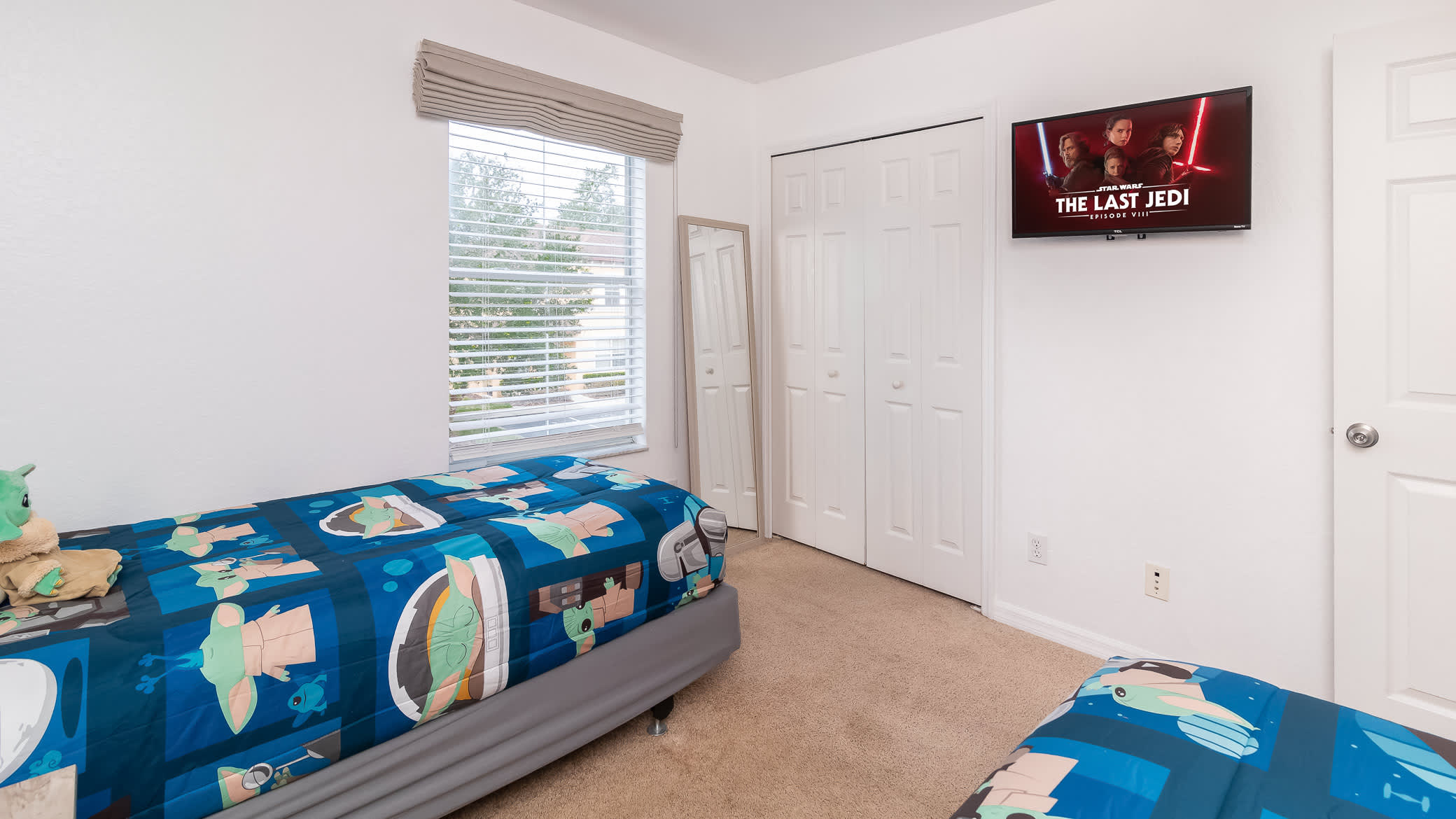 The upper level includes a Master Bedroom suite with a King size bed, smart tv and ensuite bathroom with shower tub combo. Another bedroom has a queen size bed with a smart tv. Last but not least is the bedroom with Yoda themed this include 2 twin size beds and smart tv and another bathroom.