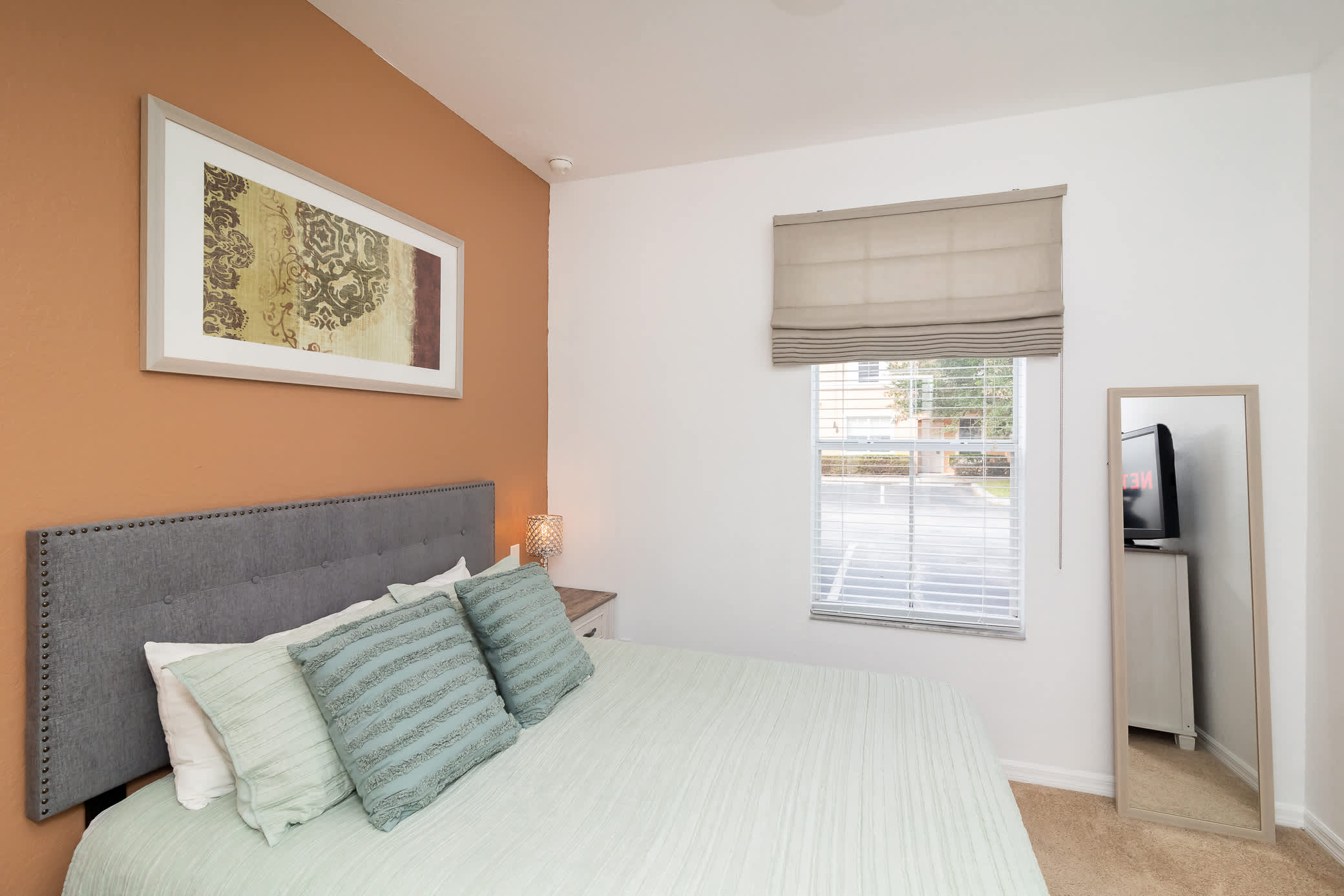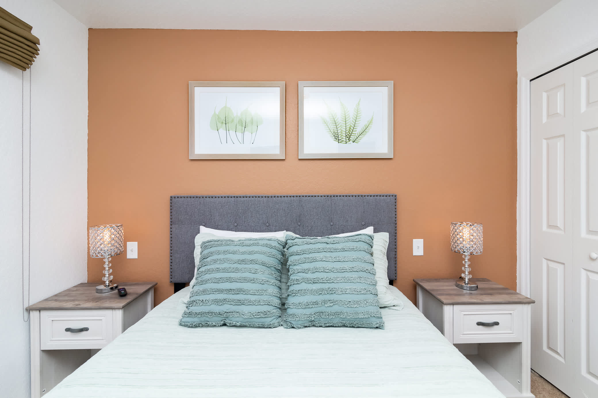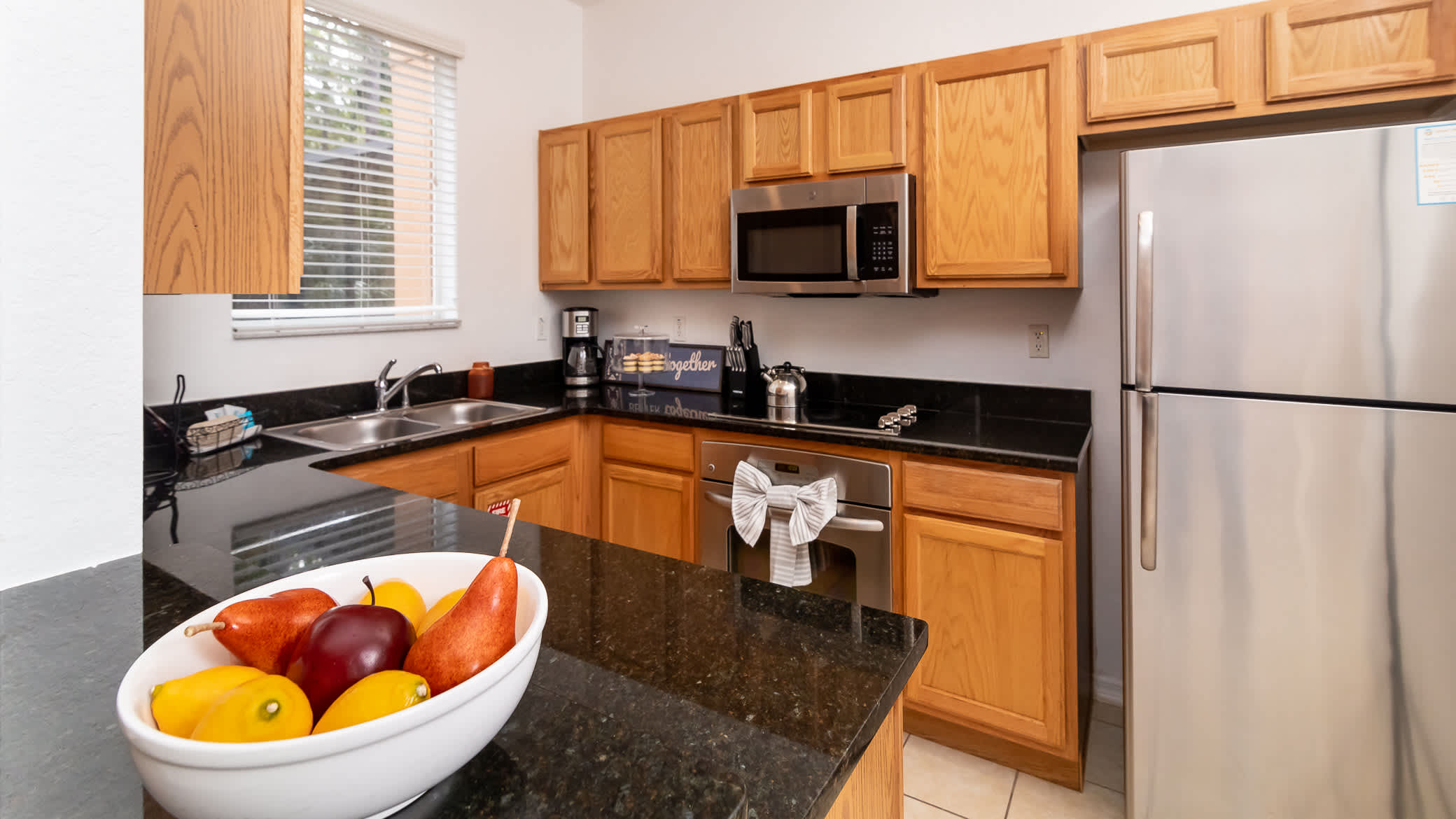 Back inside, the fully equipped kitchen includes stainless steel appliances, toaster, coffee maker, and all the cookware you’ll need to make convenient meals at home. The spacious dining table has seating for 6 where you can share breakfast before hitting the parks, or dinner while reliving all the day’s adventures.