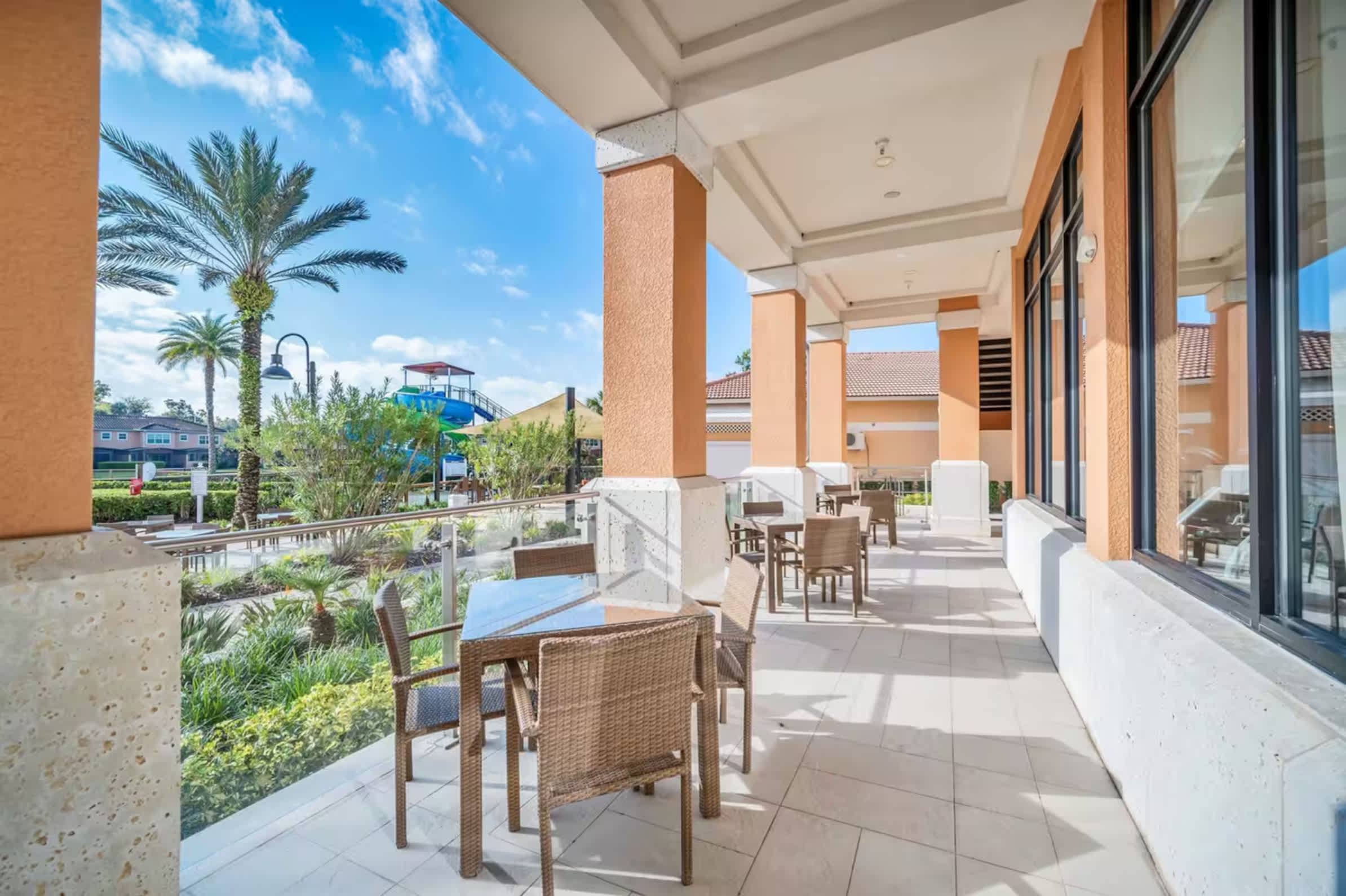 Guests can enjoy the outdoor pool with waterslides, poolside bar and grill, fitness center, tennis court, and onsite market. An exceptional array of restaurants and shopping is nearby including with onsite resort amenities.
