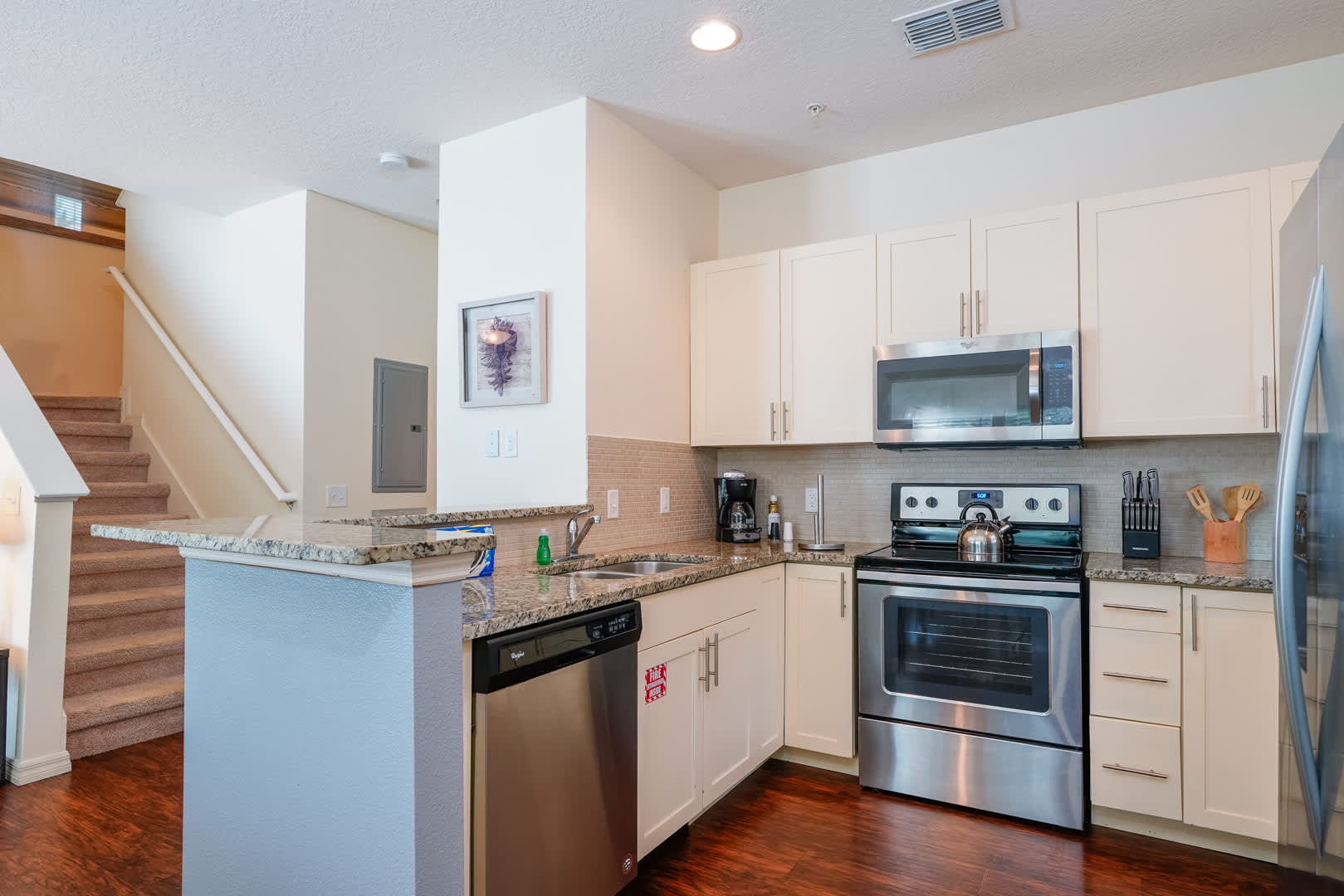 The home’s first level consists of an open concept gathering space. A hub of activity, the kitchen has stainless steel appliances, cookware, cooking tools, coffee machine, and toaster for convenient meals at home. Sit right at the kitchen counter where barstool seating for 2 offers space for a casual bite to eat or hold more formal meals at the dining table with seating for 6. Leather couches surround a large screen smart tv where you can enjoy your favorite Disney movies ahead of meeting your favorite characters in person.