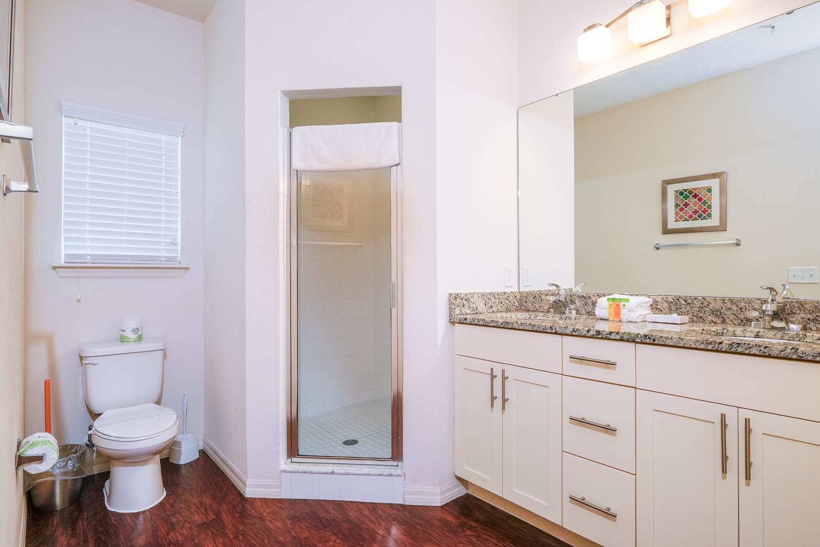 There is an additional shared bathroom with dual sinks and walk-in shower.