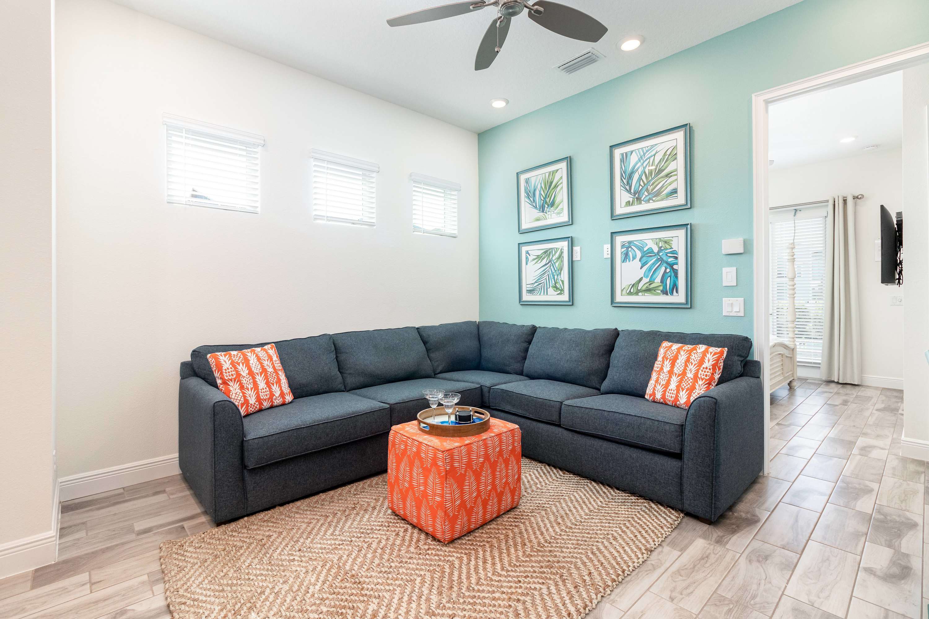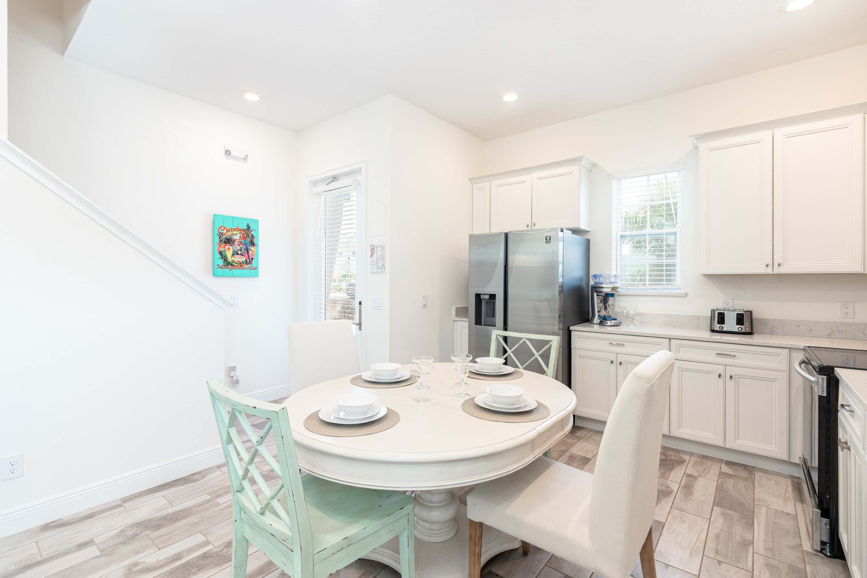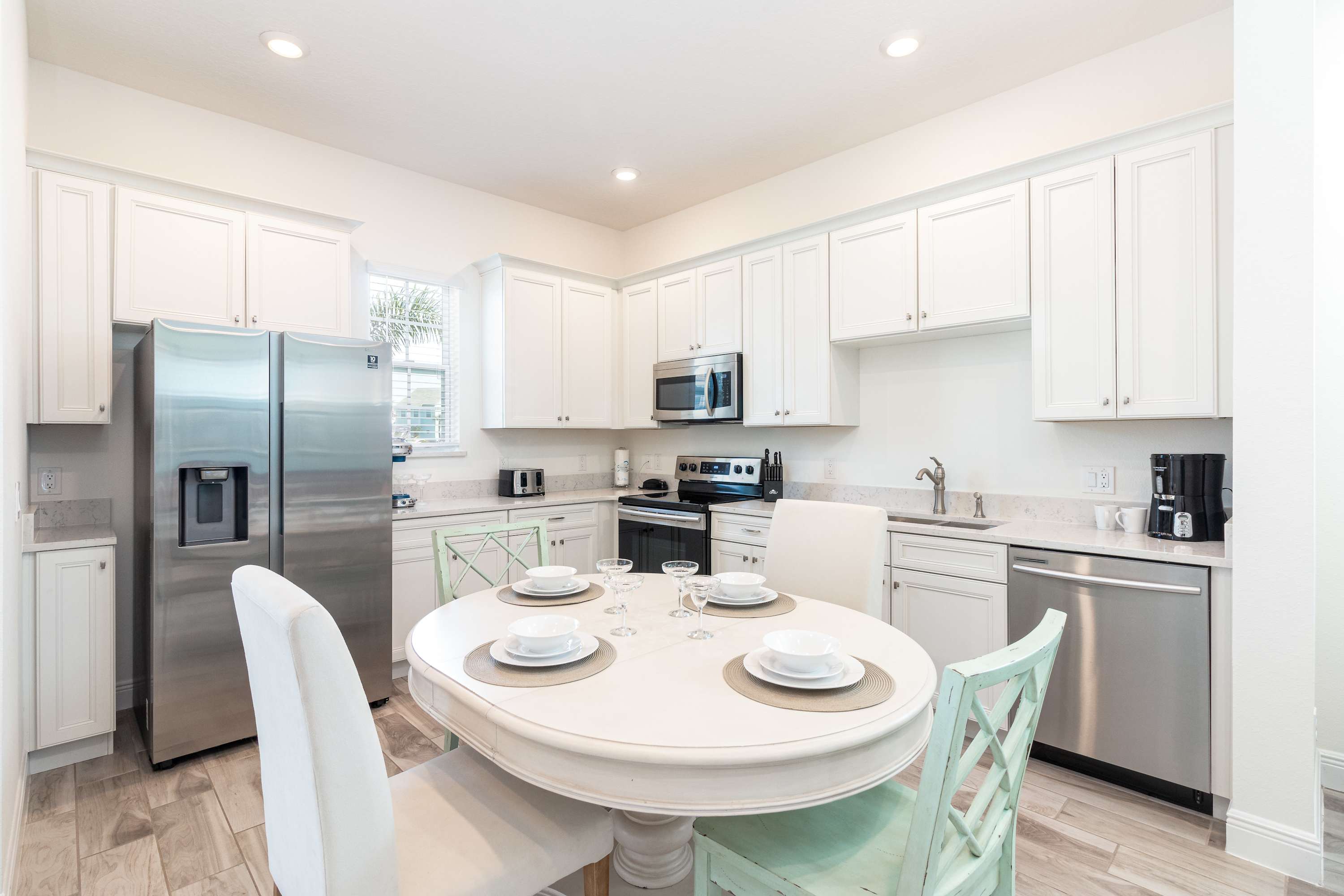 The living room offers a Smart TV, PS4, and a comfortable sofa. The kitchen is equipped with a suite of stainless-steel appliances and everything you may need to whip up delicious meals from home or a quick pre-theme park snack. In the kitchen you can also find a dining table for 4.