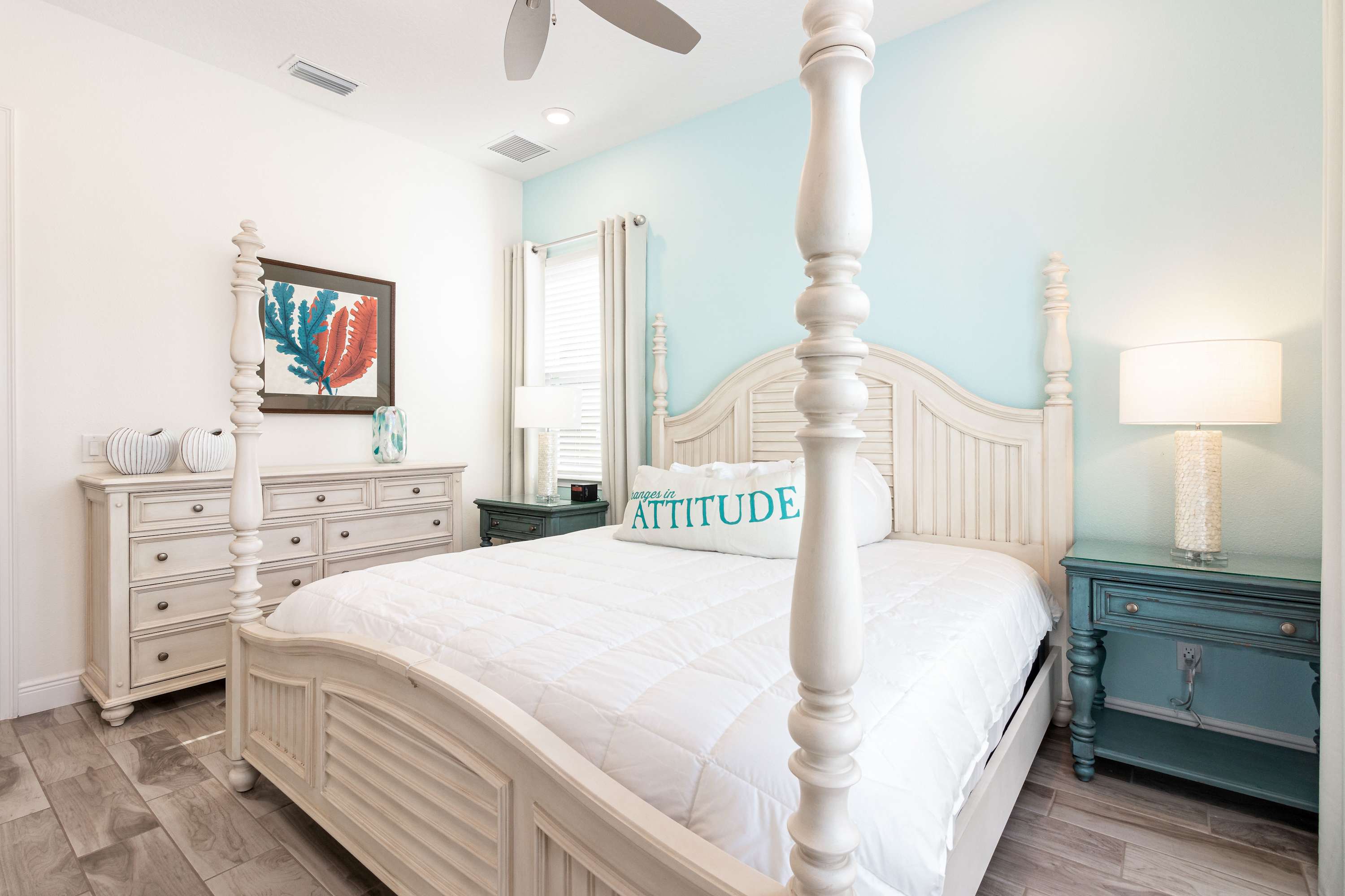 The home sleeps up to 9 guests comfortably between 4 bedrooms, and sleeper sofa in the living room. Each space is tastefully decorated and is furnished with cool, crisp linens to ensure everyone has a restful stay.