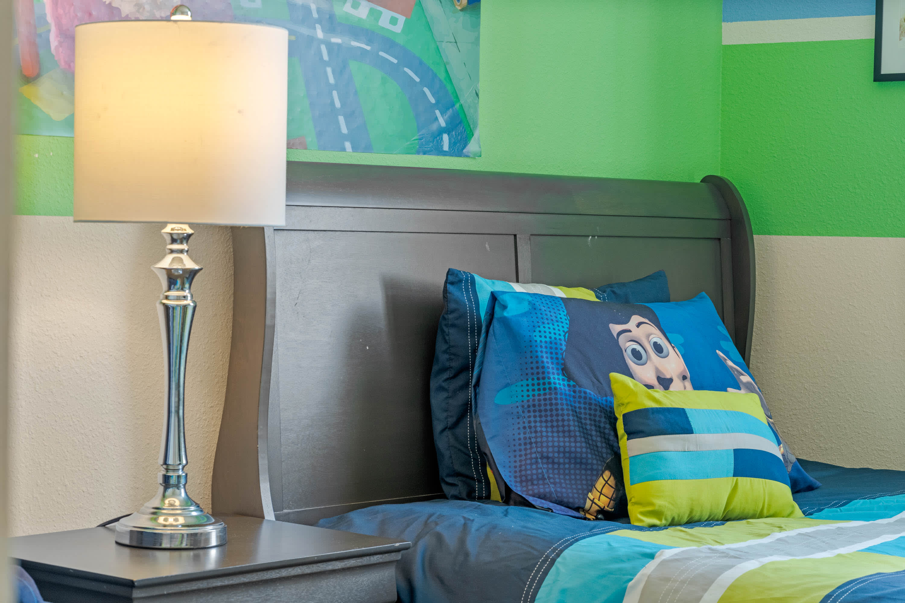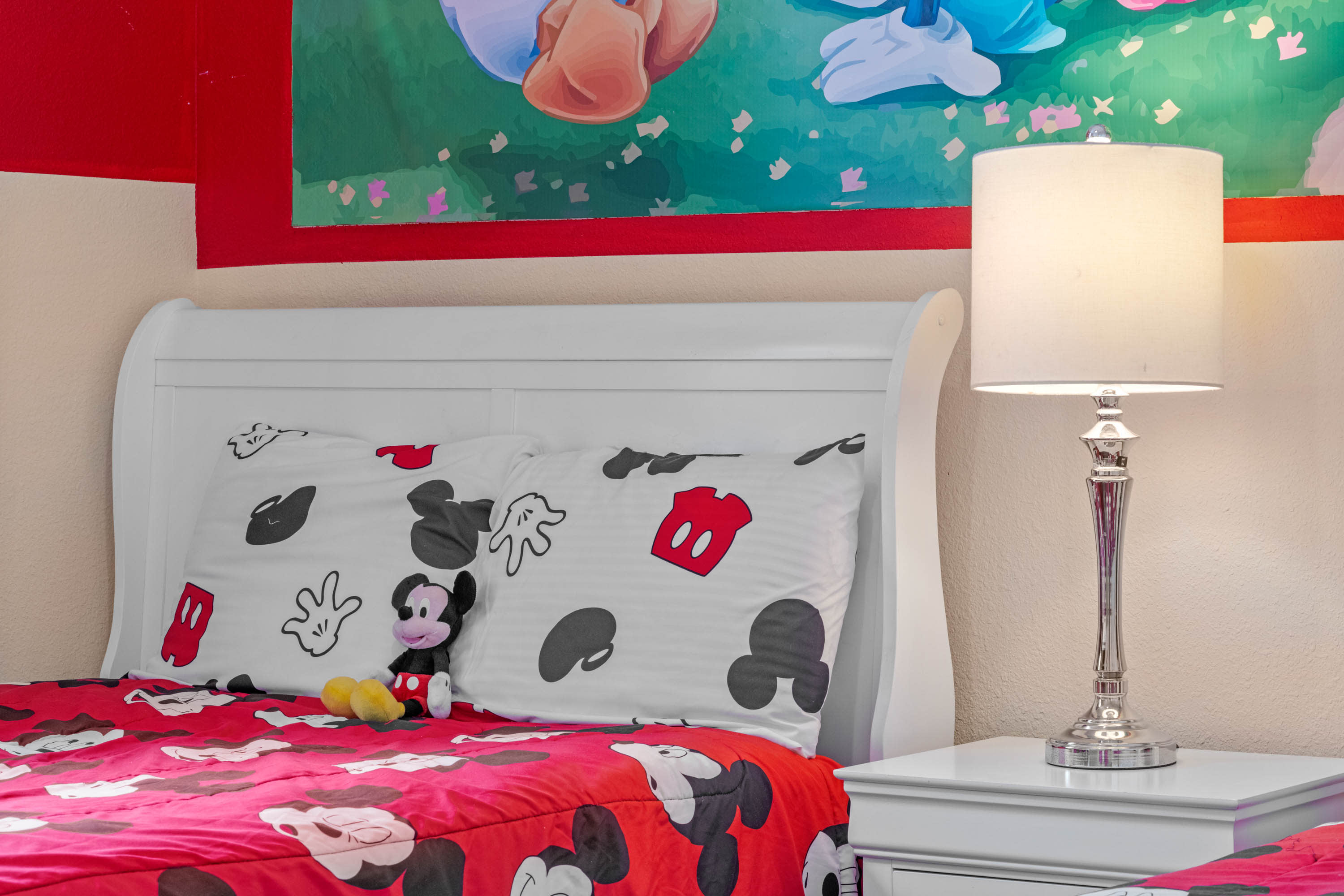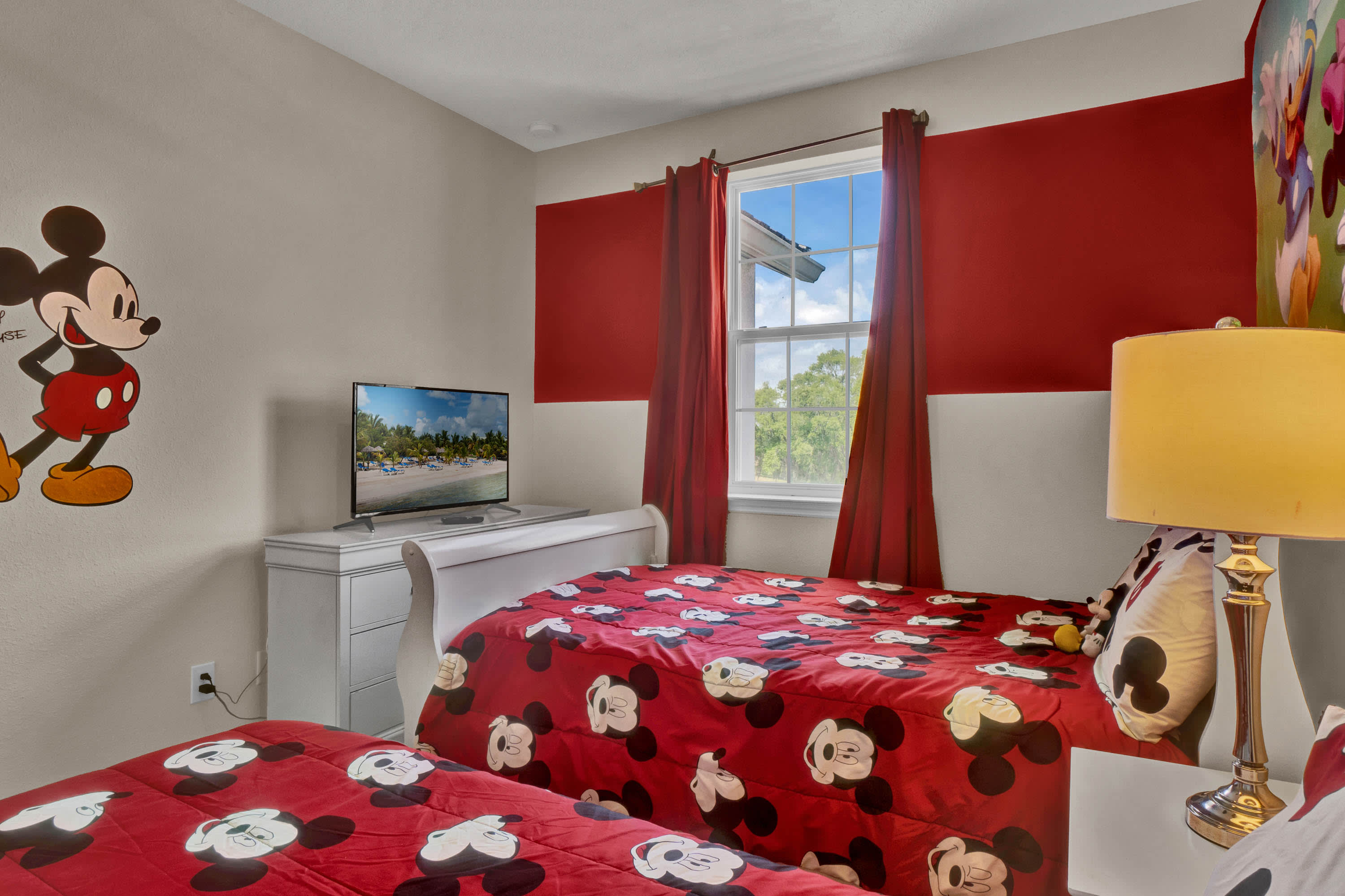 Bedroom #3 – The kids clubhouse!!! Also on the second floor, out bursts Mickey Mouse inspired décor, twin beds and a smart TV.