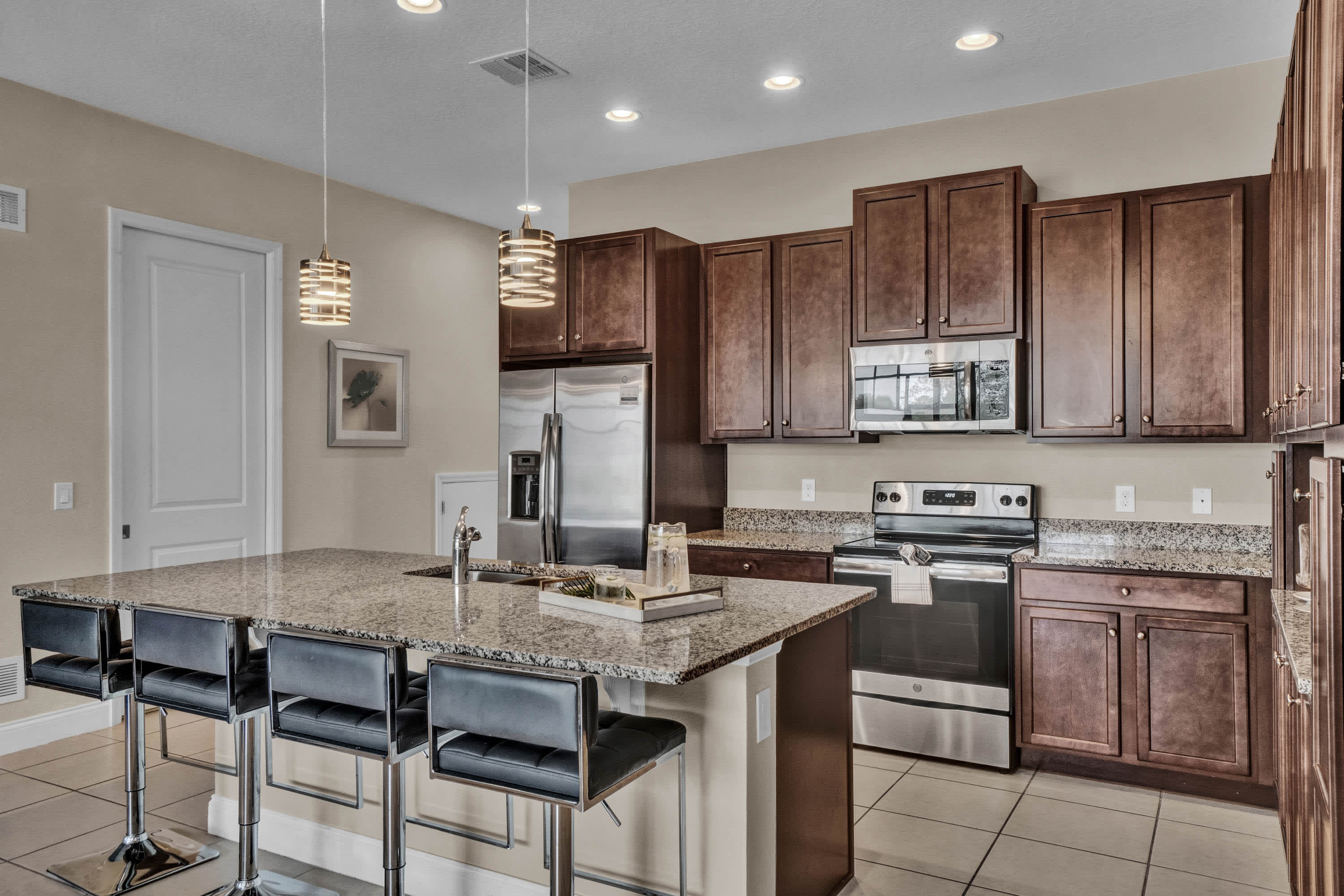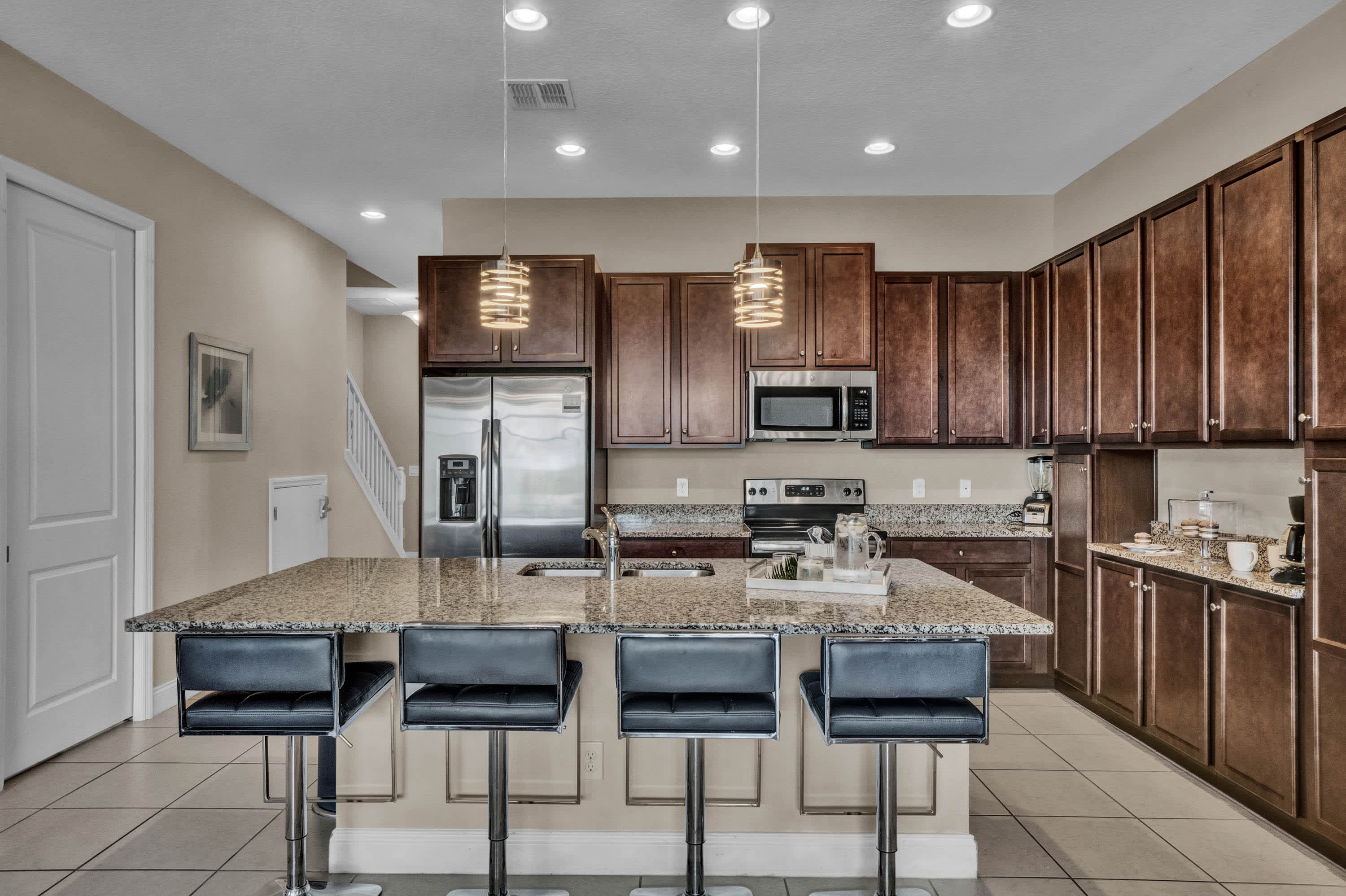 The open-plan kitchen is equipped with glossy granite countertops and modern stainless-steel appliances. Additional items including a coffee machine, oven, refrigerator, wine and cookware are available for everyday use. The extended countertop with barstools sits 4, and is perfect for evening cocktails, while the indoor dining area for 8 comes with relaxing views of the pool.
