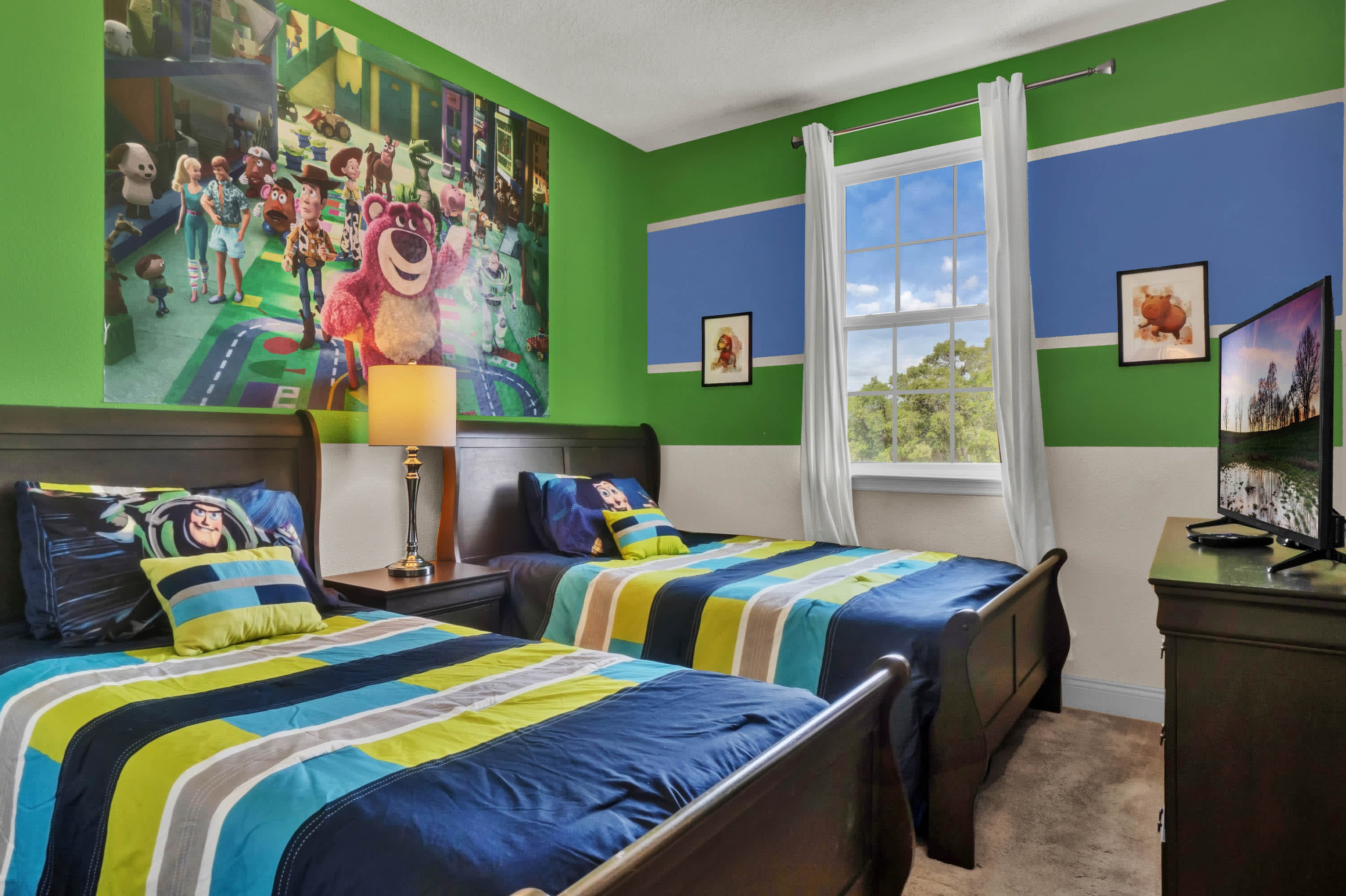 Bedroom #4, To infinity and beyond on the second floor! This room features twin beds, a smart TV and bright Toy Story designs. The adjacent bathroom is provided with a shower/tub combo.