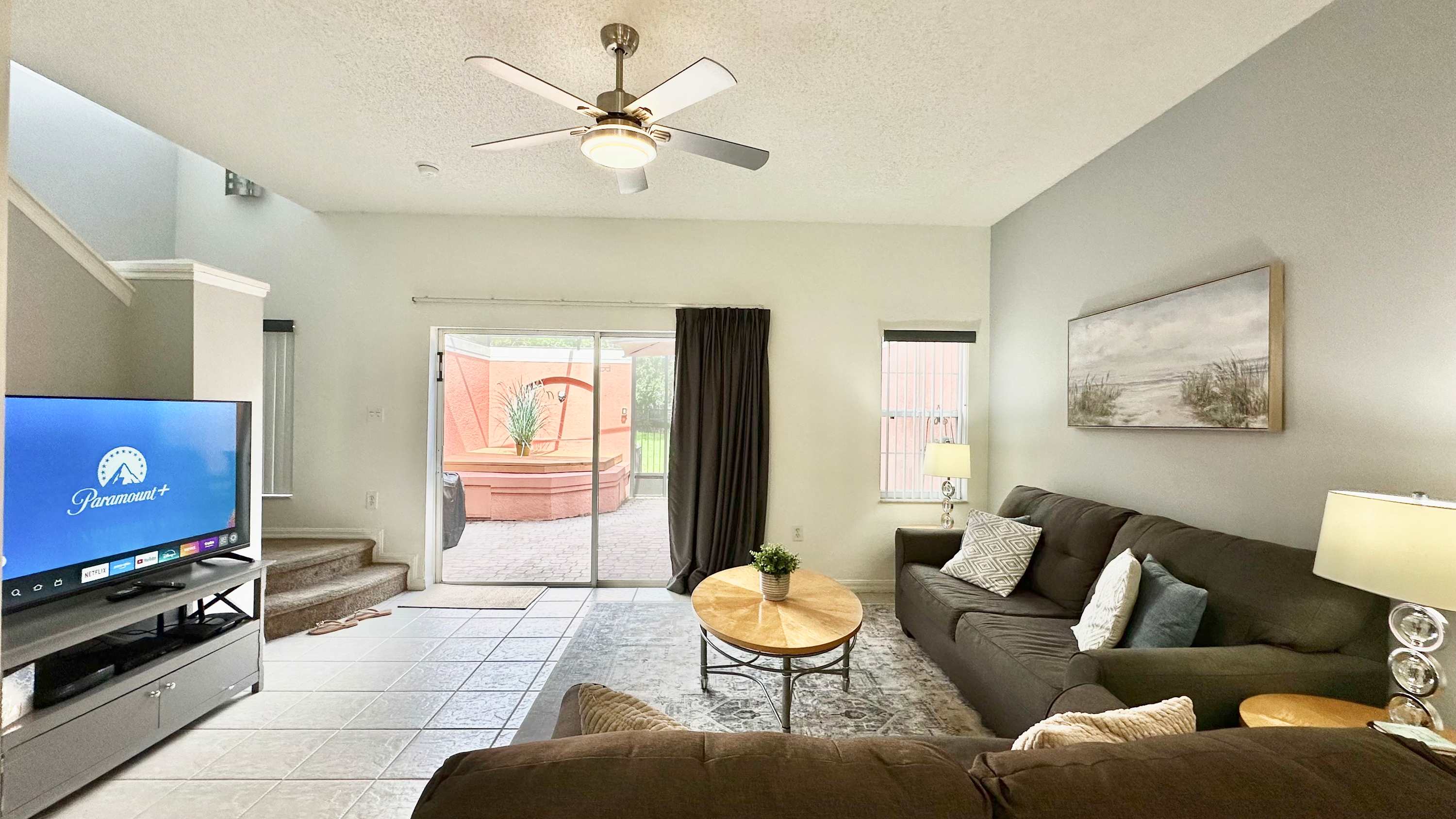 The home is washed in soothing pastel-colored exteriors and dewy white interiors. Puffy couches flank a sleek, smart TV. Large sliders open on to a sun-kissed veranda that features loungers and an al-fresco dining table for 6.