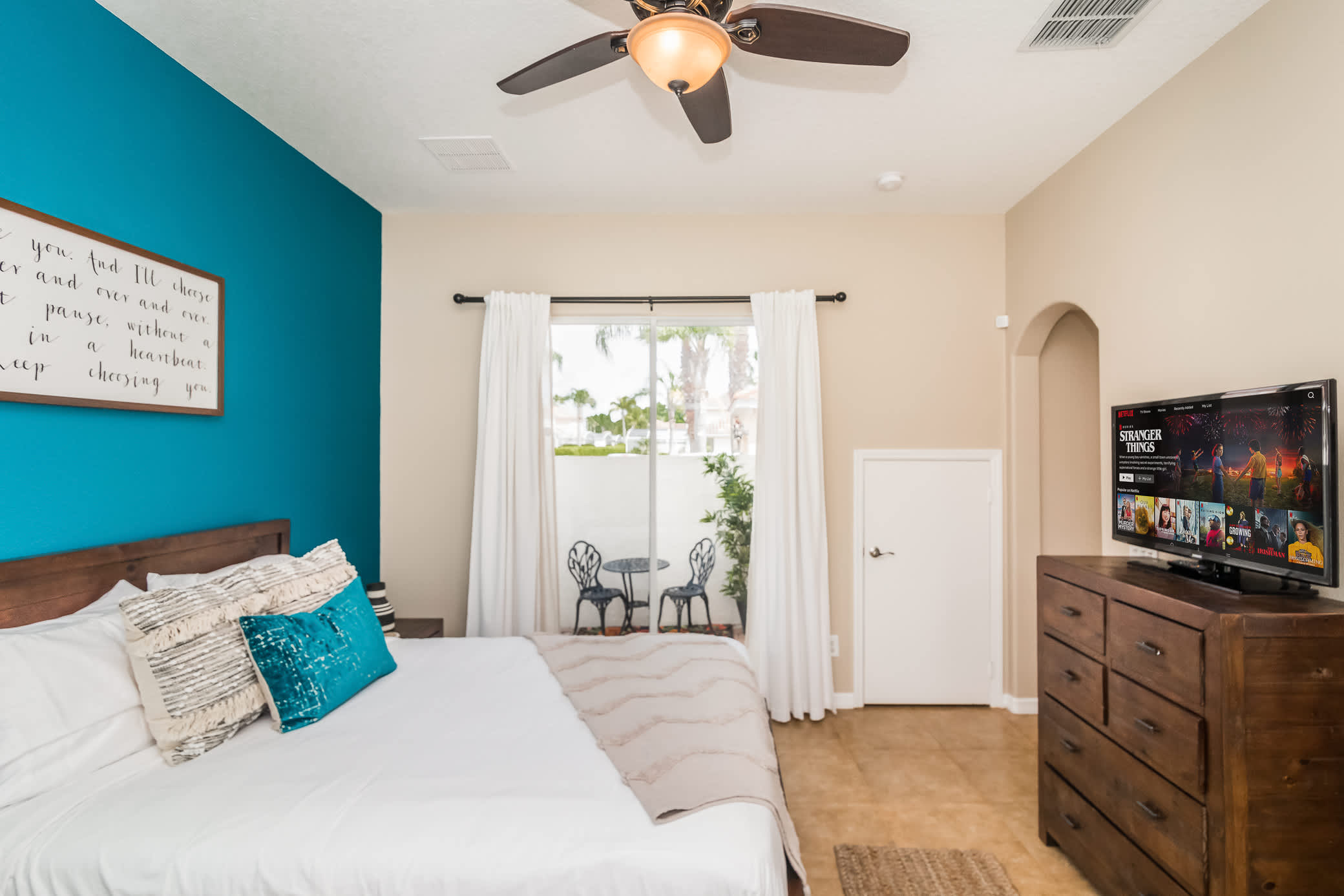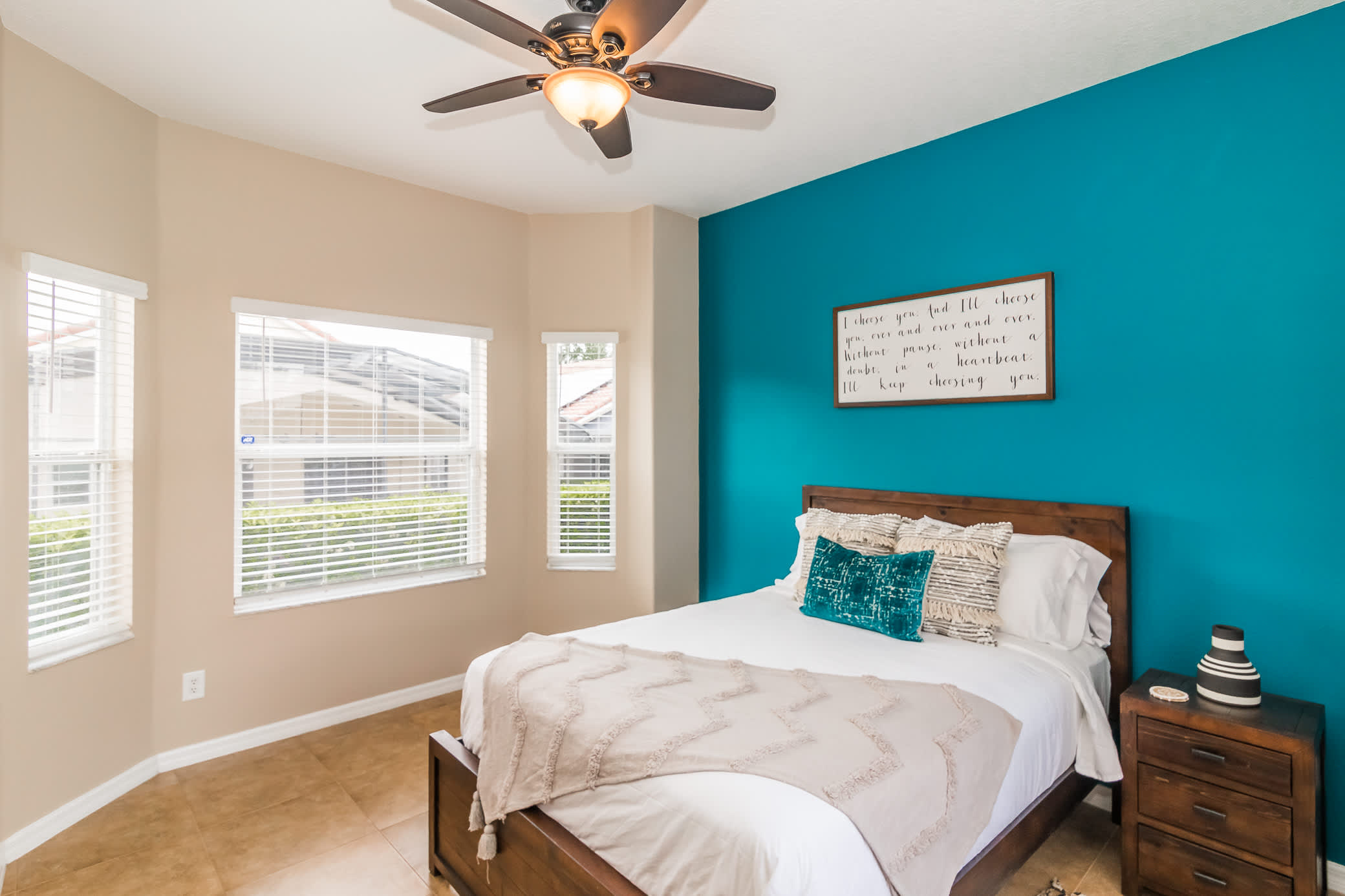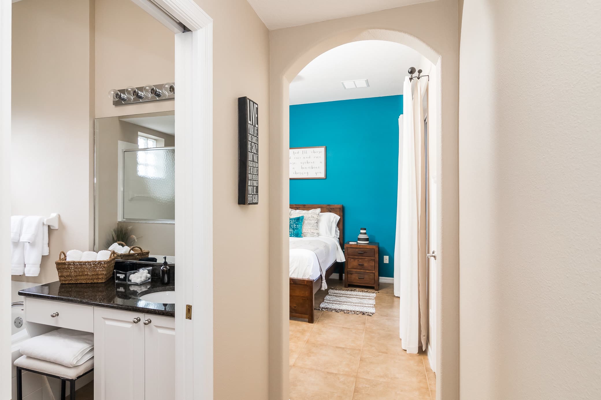 Bedroom #1 – This is the only first floor bedroom and is a vacation in itself. Wake up rested in your comfortable queen-sized bed. Your own personal lanai, complete with its beautifully classic iron table and chairs is always in your sights and is the perfect spot to escape and take a sun-soaked moment to yourselves. The natural light, tiled floor, and beautiful blue walls make for beachy vibrations. A few steps away is your ensuite bathroom, complete with vanity, shower, and jacuzzi.