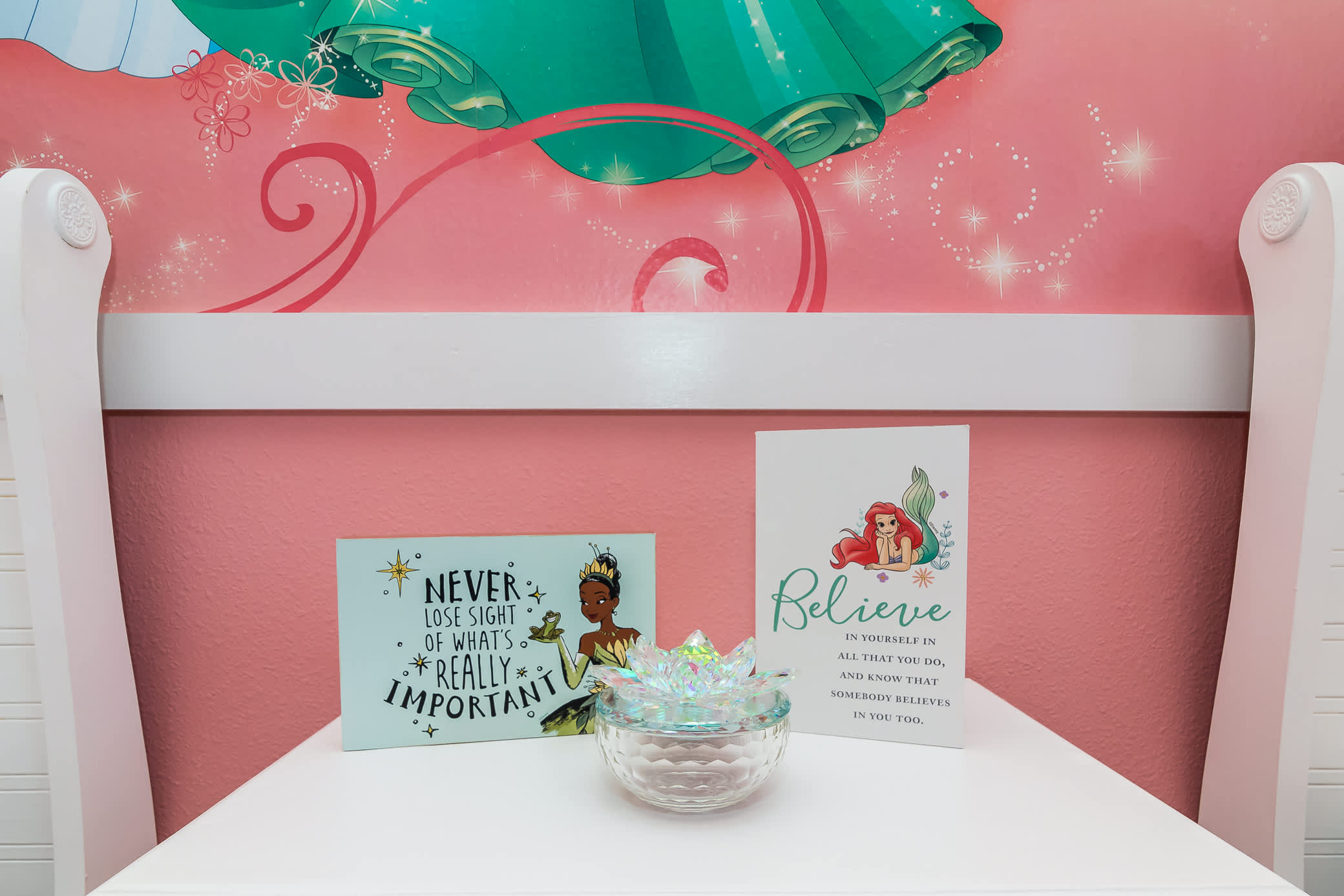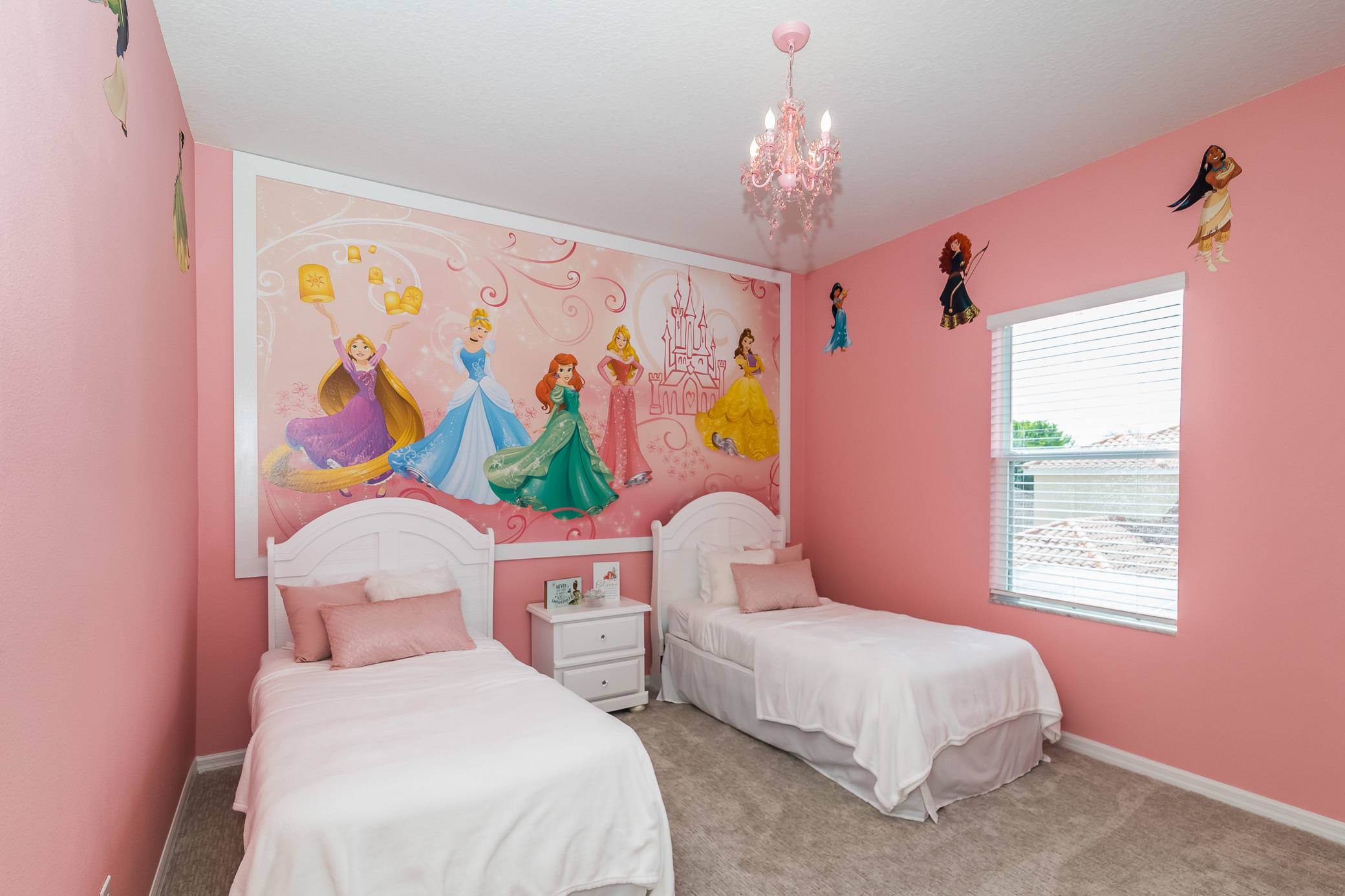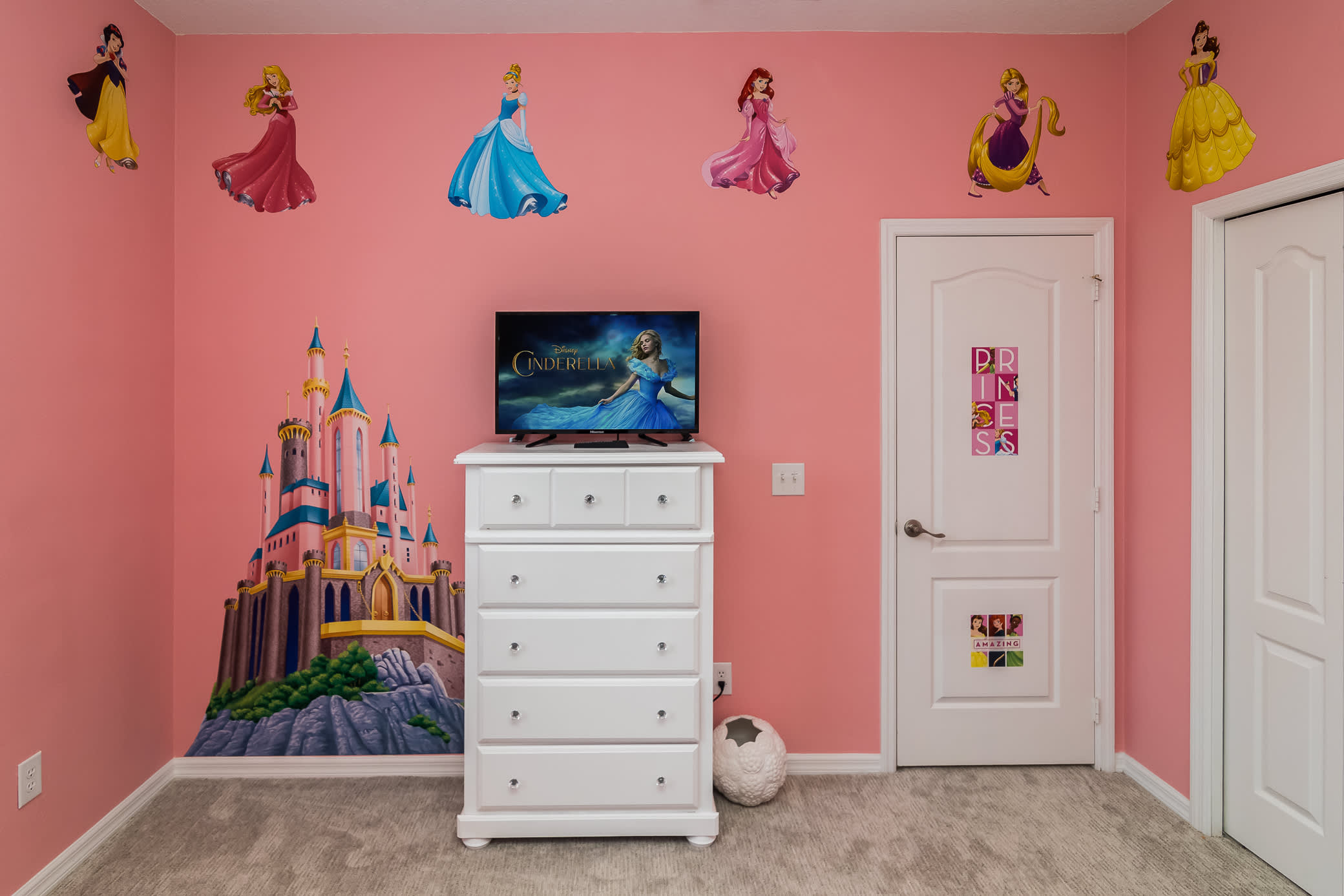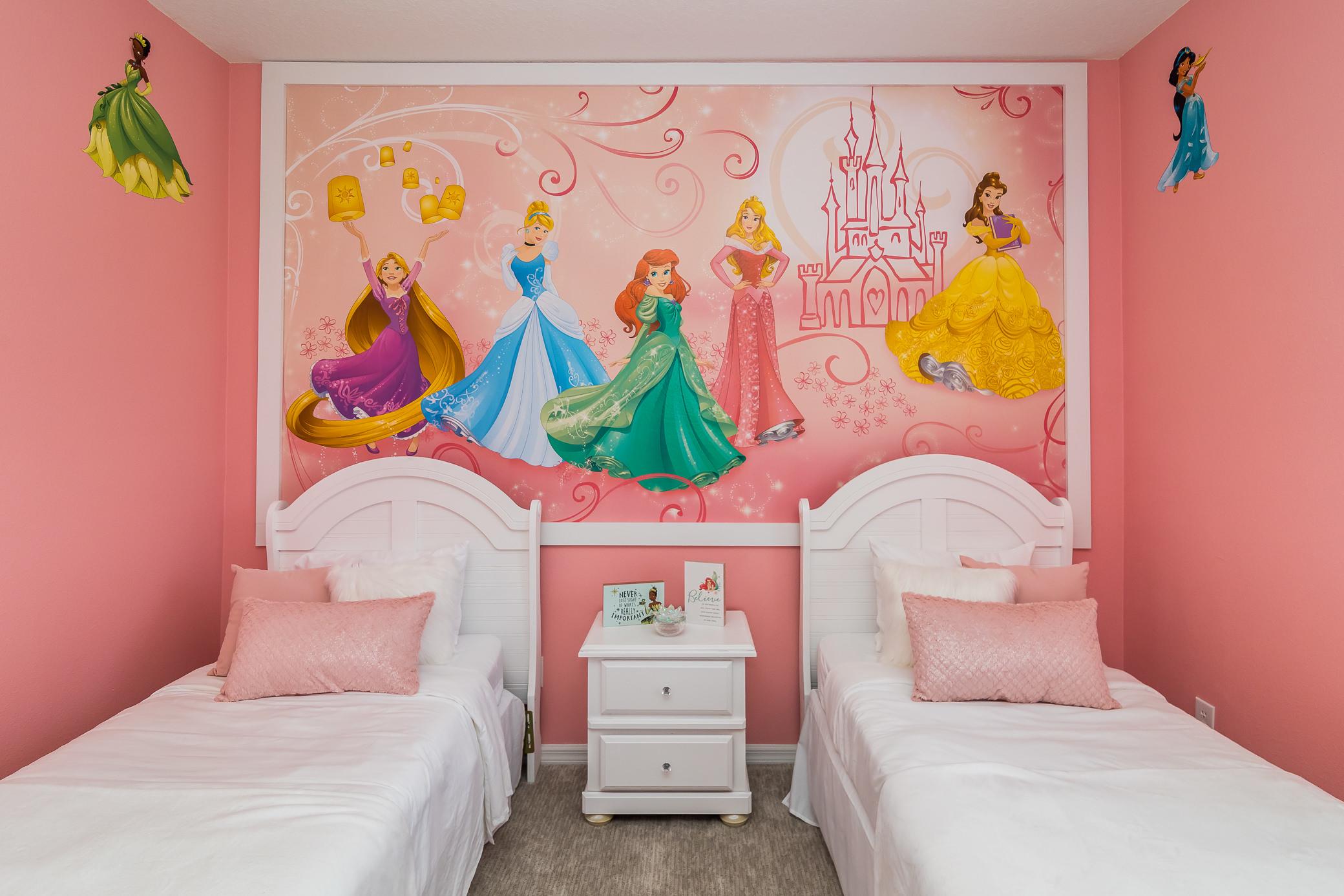 Bedroom #3 – Welcome to the princess room! You will find all your favorite Disney princesses awaiting you, with decals and murals surrounding two twin-sized beds, complete with TV, and in the prettiest of pink.