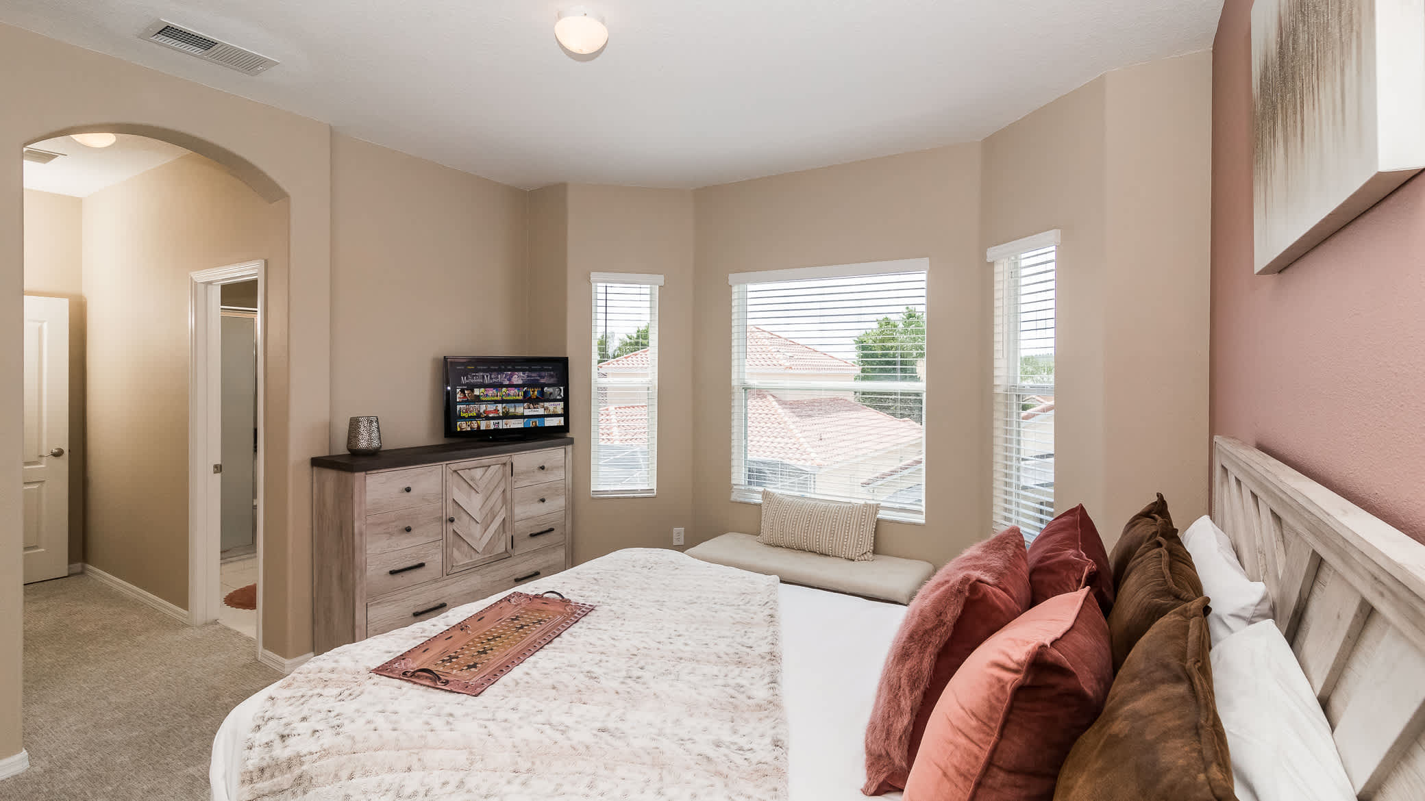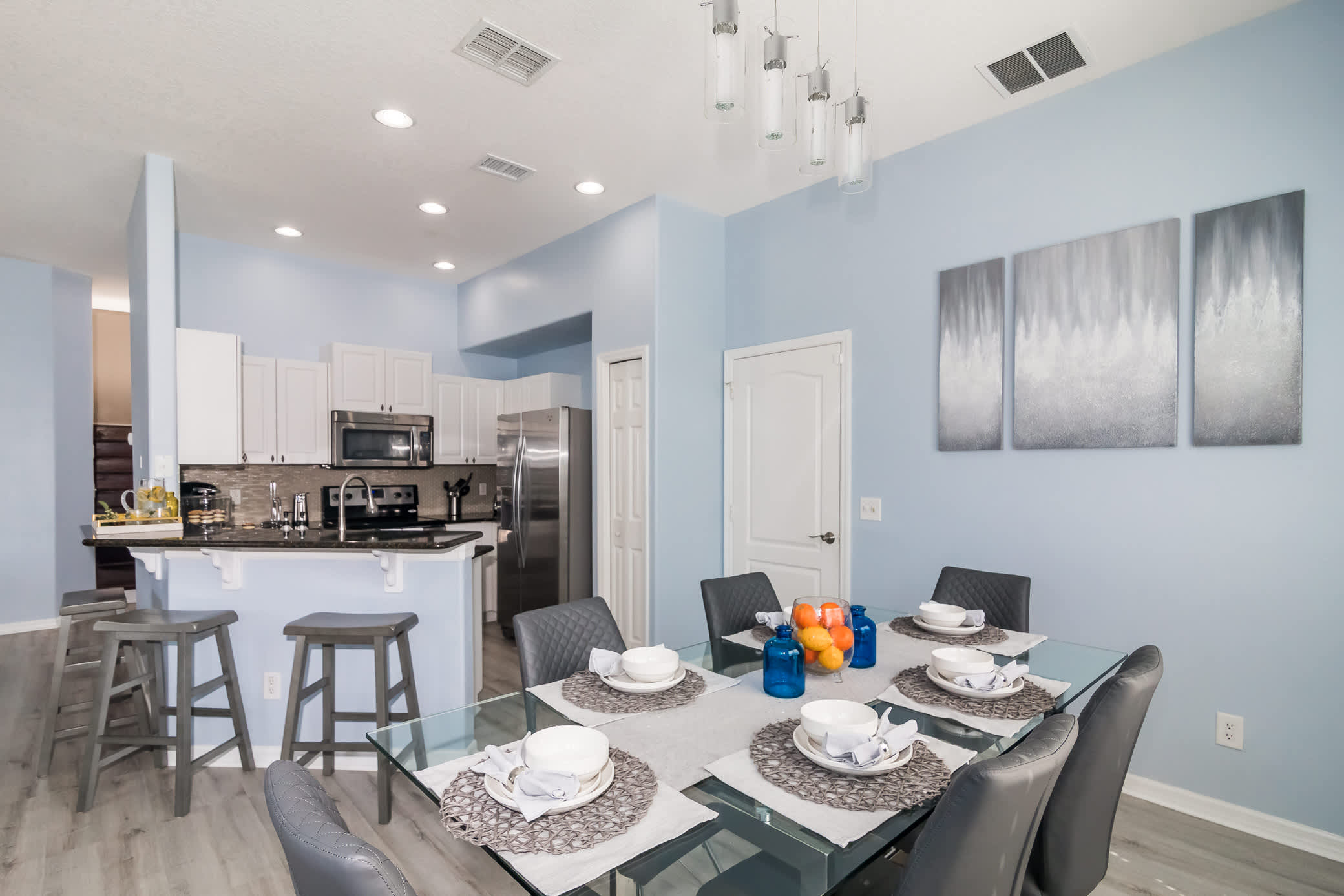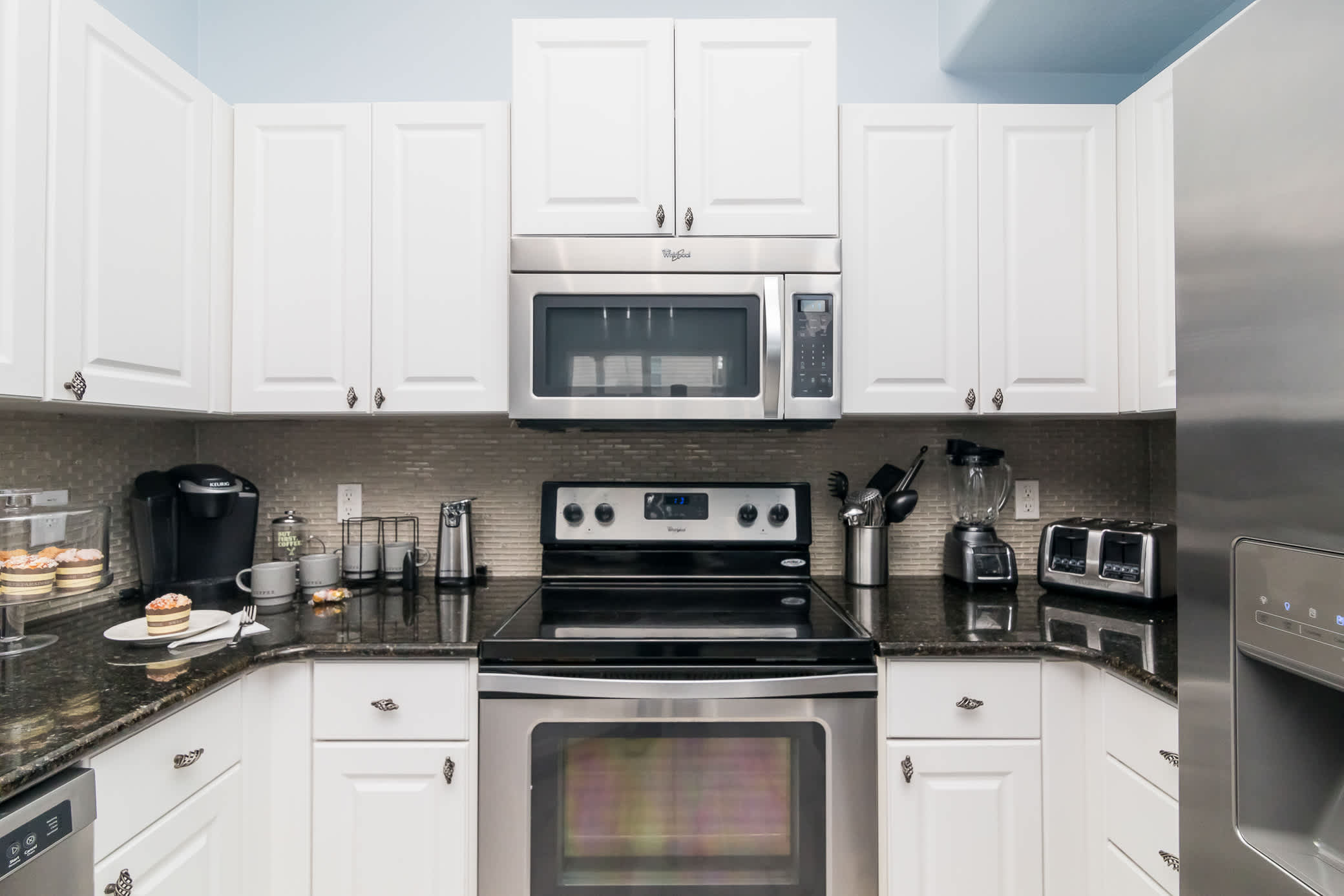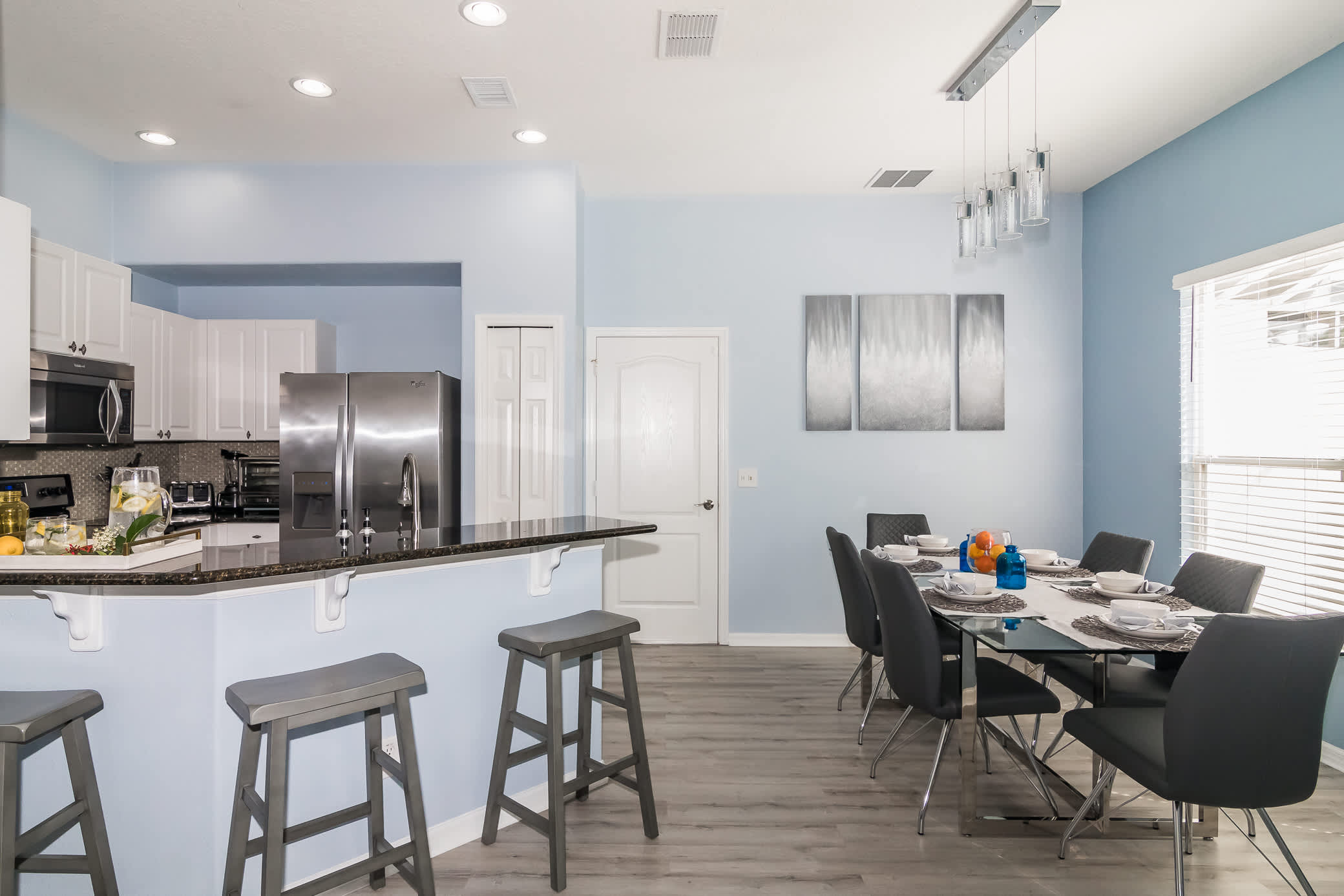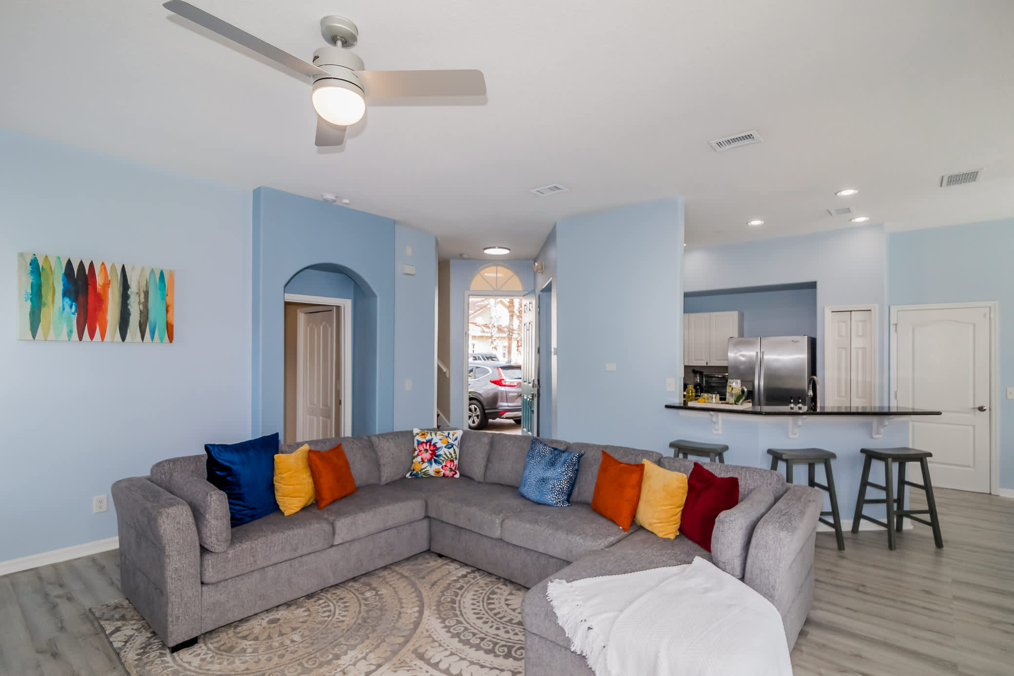 Through the front door: enter tranquility. The living space is decked out with everything you may need to unwind after a busy day of adventures. With calm modern colors, a large cozy sectional, and a Smart TV, you’ll be more than pleased to opt in for a movie or reading night for recharging.