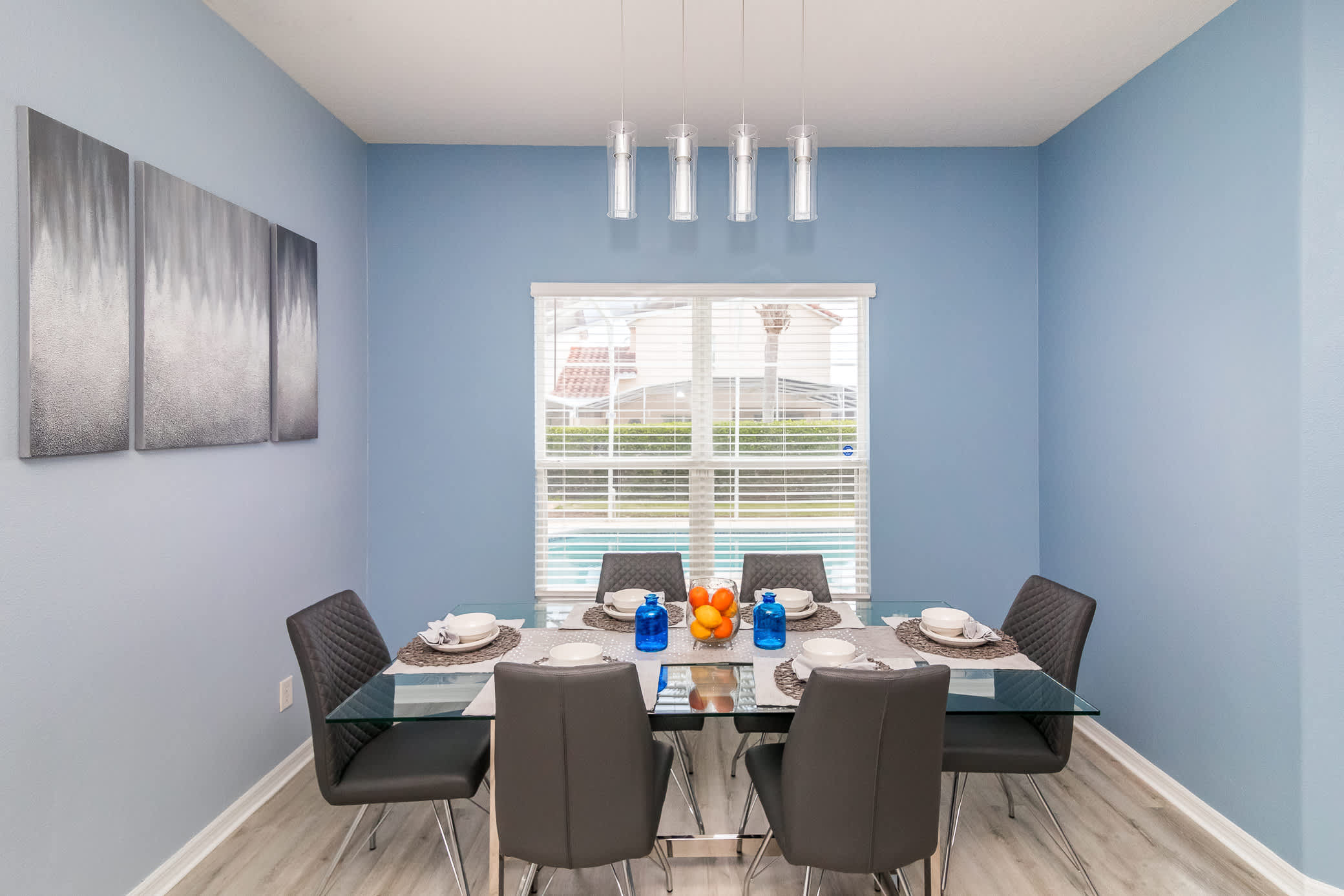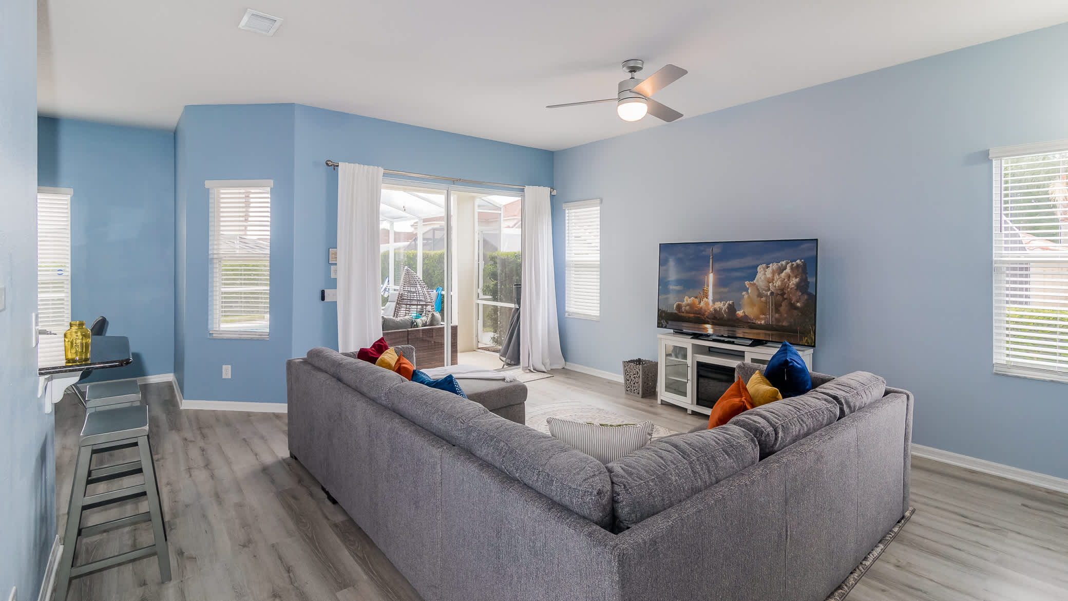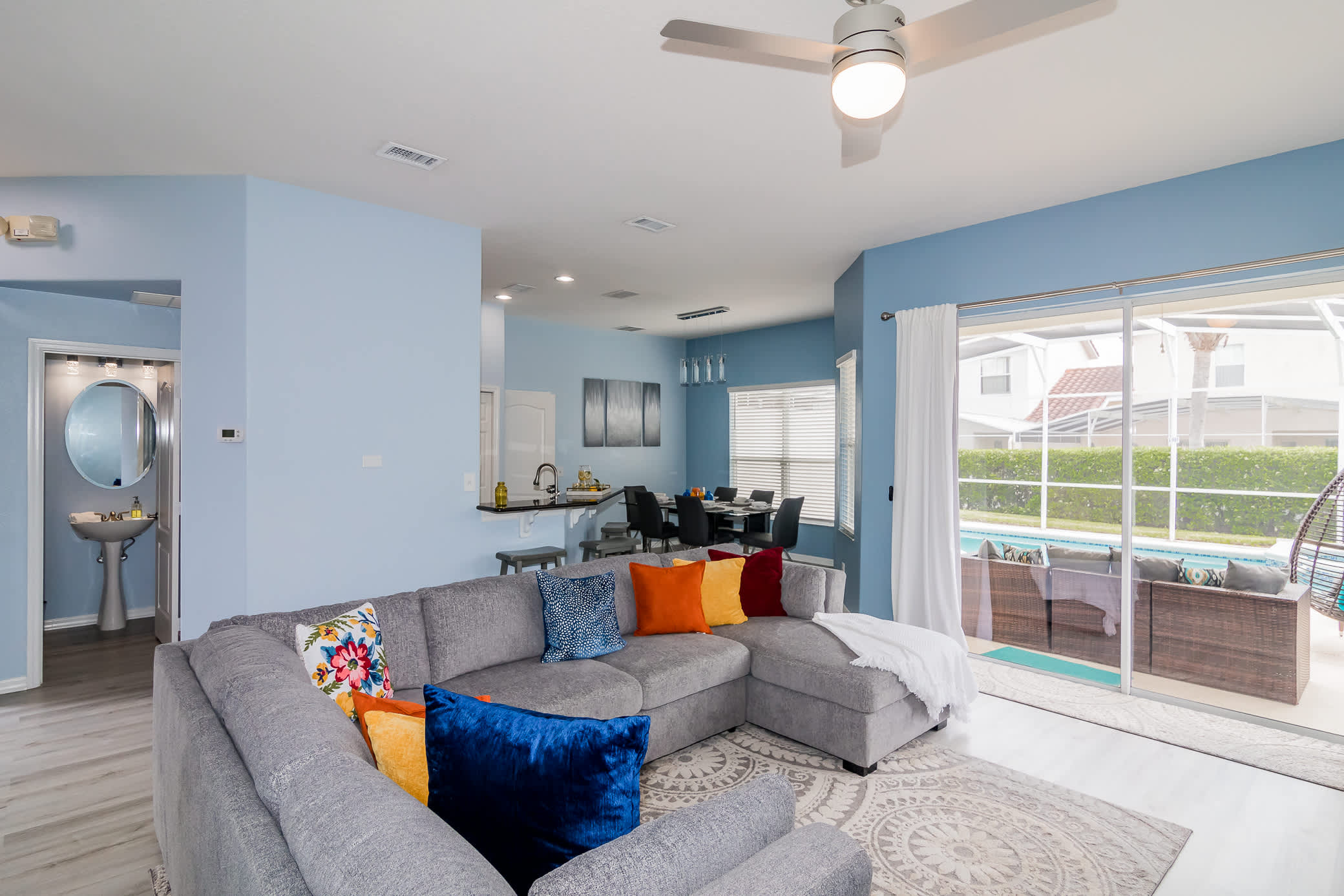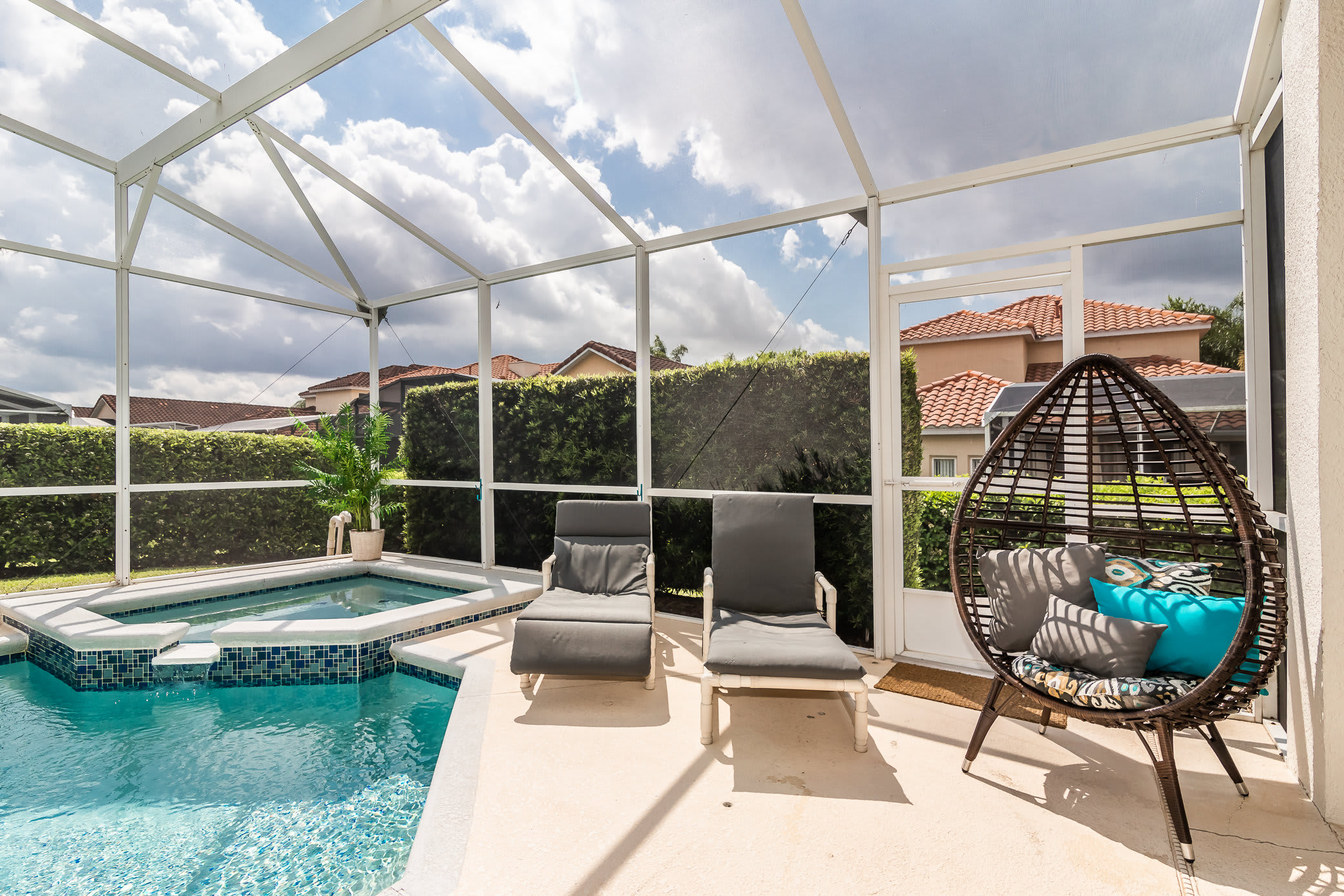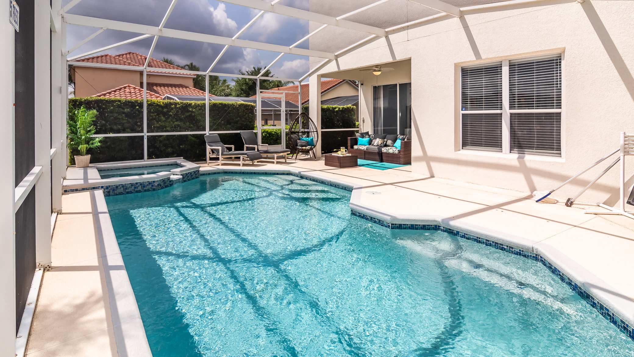 Shift your mealtime to the spacious dining table which sits six to eight. Steps away, you will find your pool and outdoor patio. The pool/spa area is completely enclosed, helping to keep your pool clean for your entire stay, and shielding you from too much exposure and heat while you are still soaking up every bit of fun in the sun. With no shortage of seating (outdoor sofa, loungers, and table) you have the perfect opportunity to take in a well-deserved day off. The jacuzzi is the perfect spot to enjoy the sunset, the patio is primed for taking your enjoyment and family meals to dine al fresco. The pool is visible around your whole view of your living space, reminding you that relaxation is just outside.