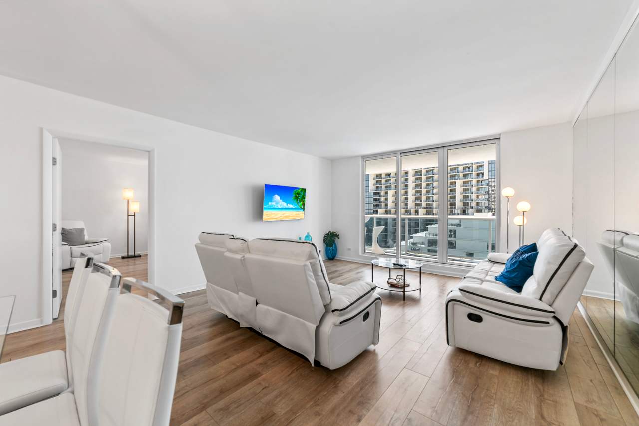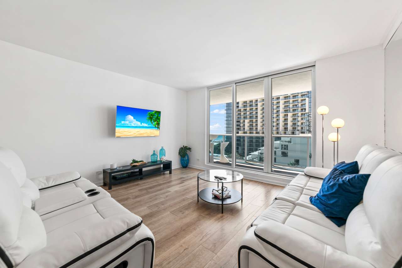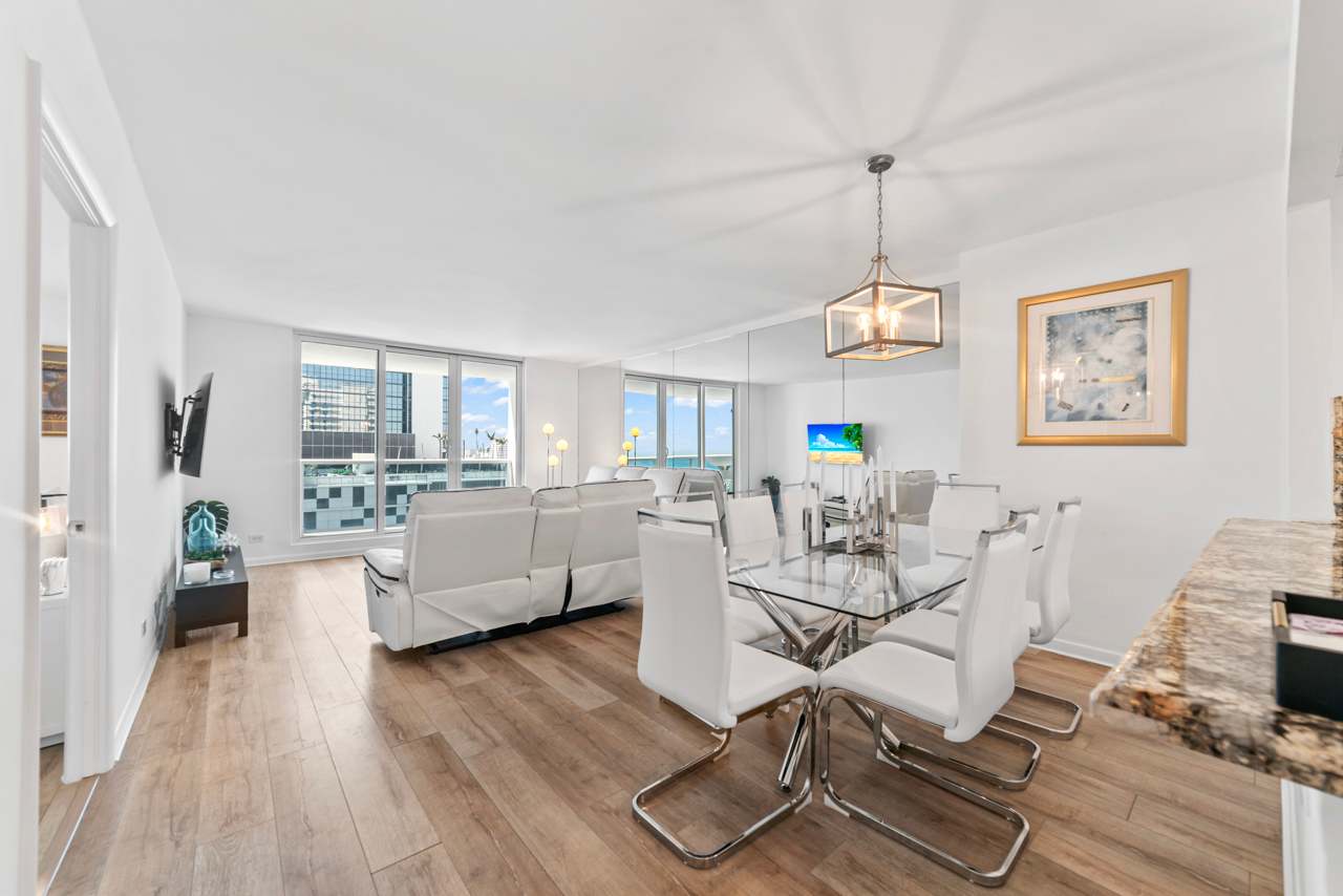 You’ll feel right at home the moment you step inside this beautiful Miami Beach apartment. The kitchen gleams with stainless steel appliances, crisp white cabinetry, and smooth stone countertops, inviting you to whip up everything from casual breakfasts to gourmet dinners. Just beyond, a dining table that seats eight makes hosting dinner parties or family gatherings a breeze. The living room is cozy and stylish, featuring a comfortable couch and a reclining love seat, perfect for unwinding in front of the TV after a long day in the sun. Slide open the balcony doors and breathe in the salty air — your private balcony overlooks the pool area and the beach beyond, with a charming table for two where you can sip your morning coffee or toast the evening sky. This isn't just a rental; it's a lifestyle upgrade waiting for you.
