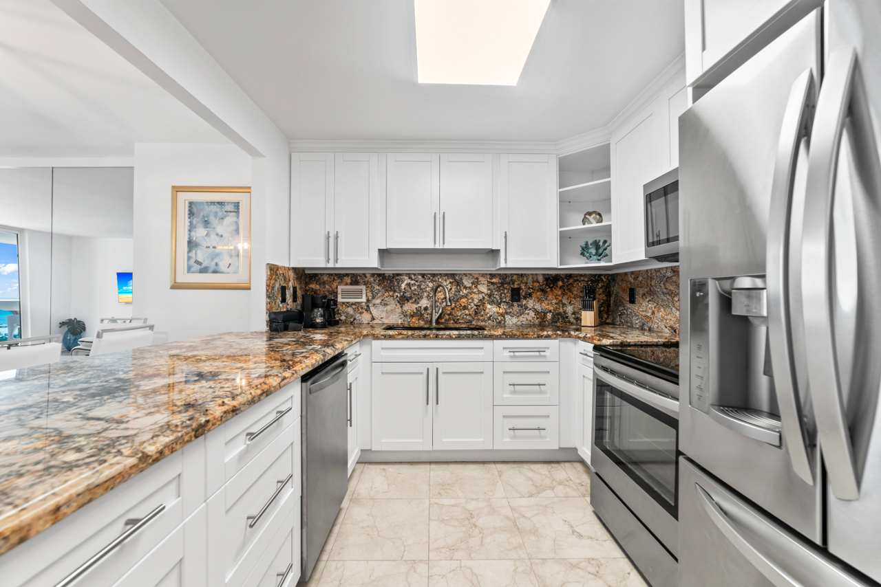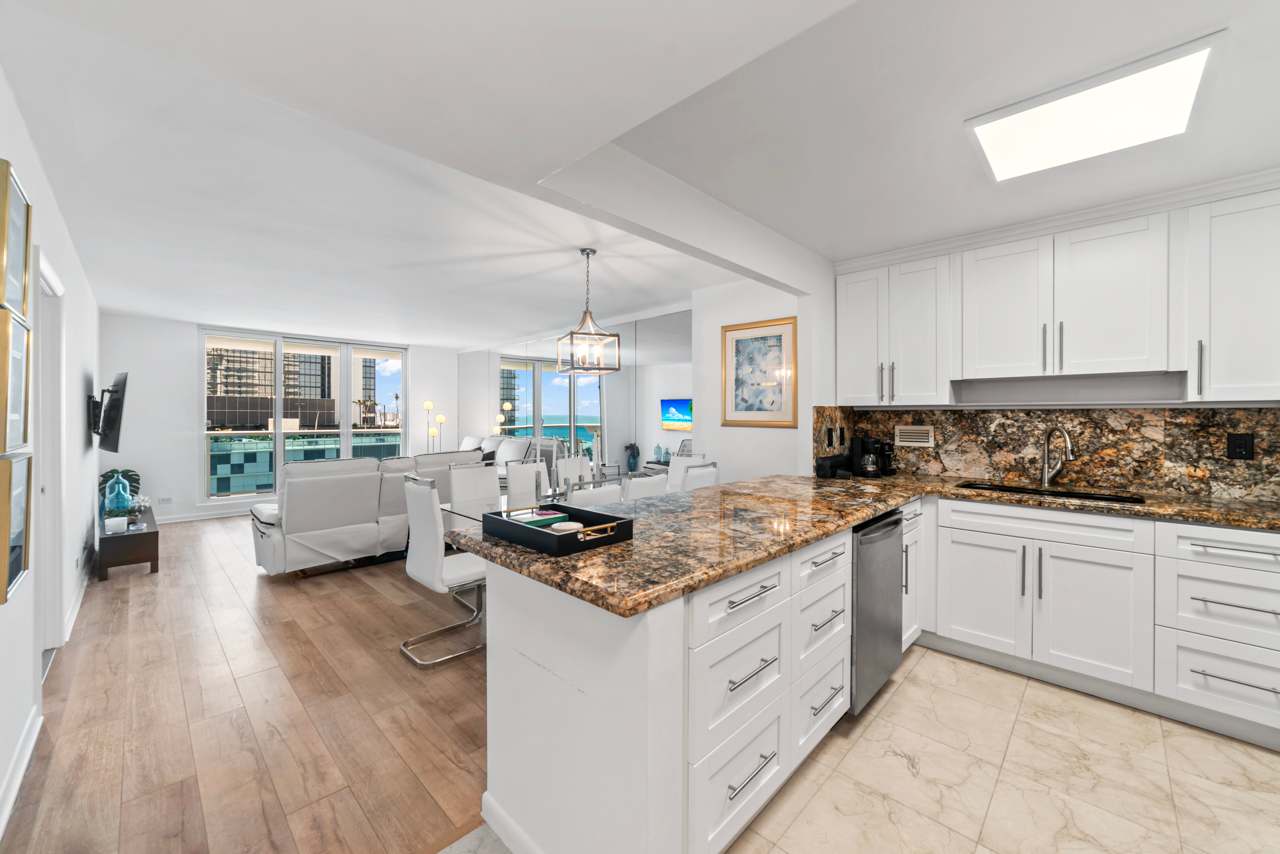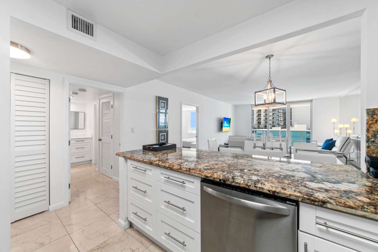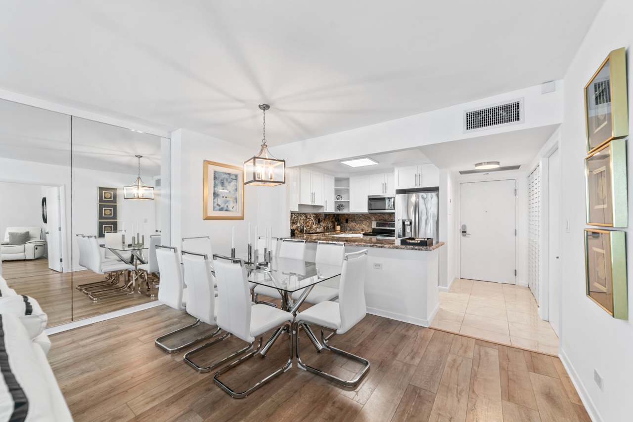 You’ll feel right at home the moment you step inside this beautiful Miami Beach apartment. The kitchen gleams with stainless steel appliances, crisp white cabinetry, and smooth stone countertops, inviting you to whip up everything from casual breakfasts to gourmet dinners. Just beyond, a dining table that seats eight makes hosting dinner parties or family gatherings a breeze. The living room is cozy and stylish, featuring a comfortable couch and a reclining love seat, perfect for unwinding in front of the TV after a long day in the sun. Slide open the balcony doors and breathe in the salty air — your private balcony overlooks the pool area and the beach beyond, with a charming table for two where you can sip your morning coffee or toast the evening sky. This isn't just a rental; it's a lifestyle upgrade waiting for you.