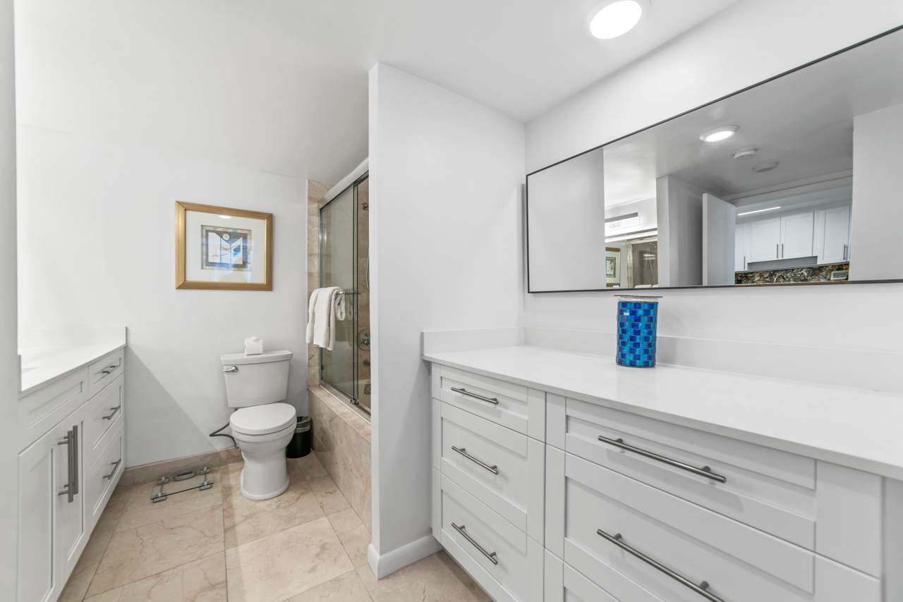 Bedroom #1 includes a king size bed, a cable TV, and an ensuite bathroom with a single vanity and a shower/tub combo.