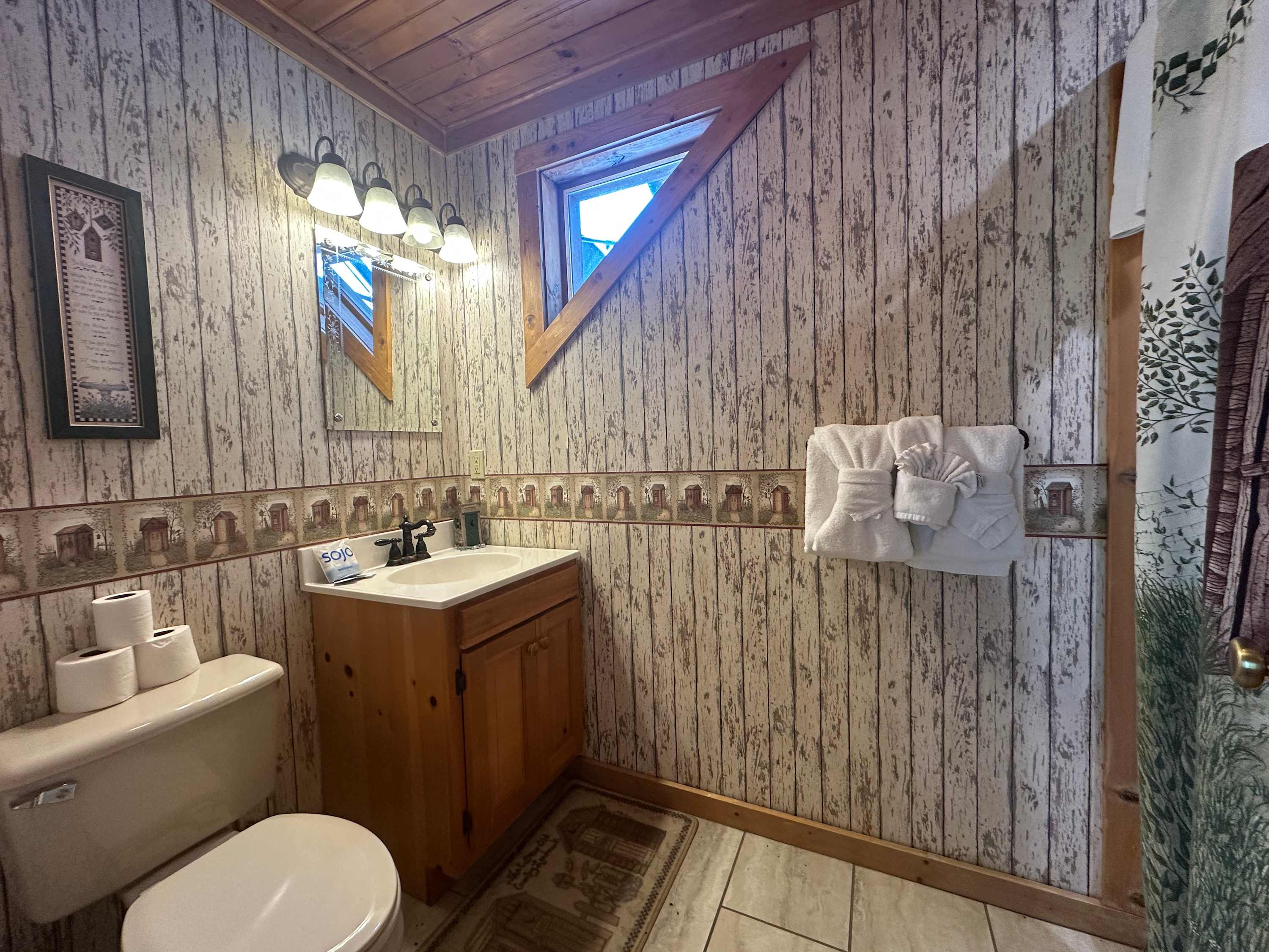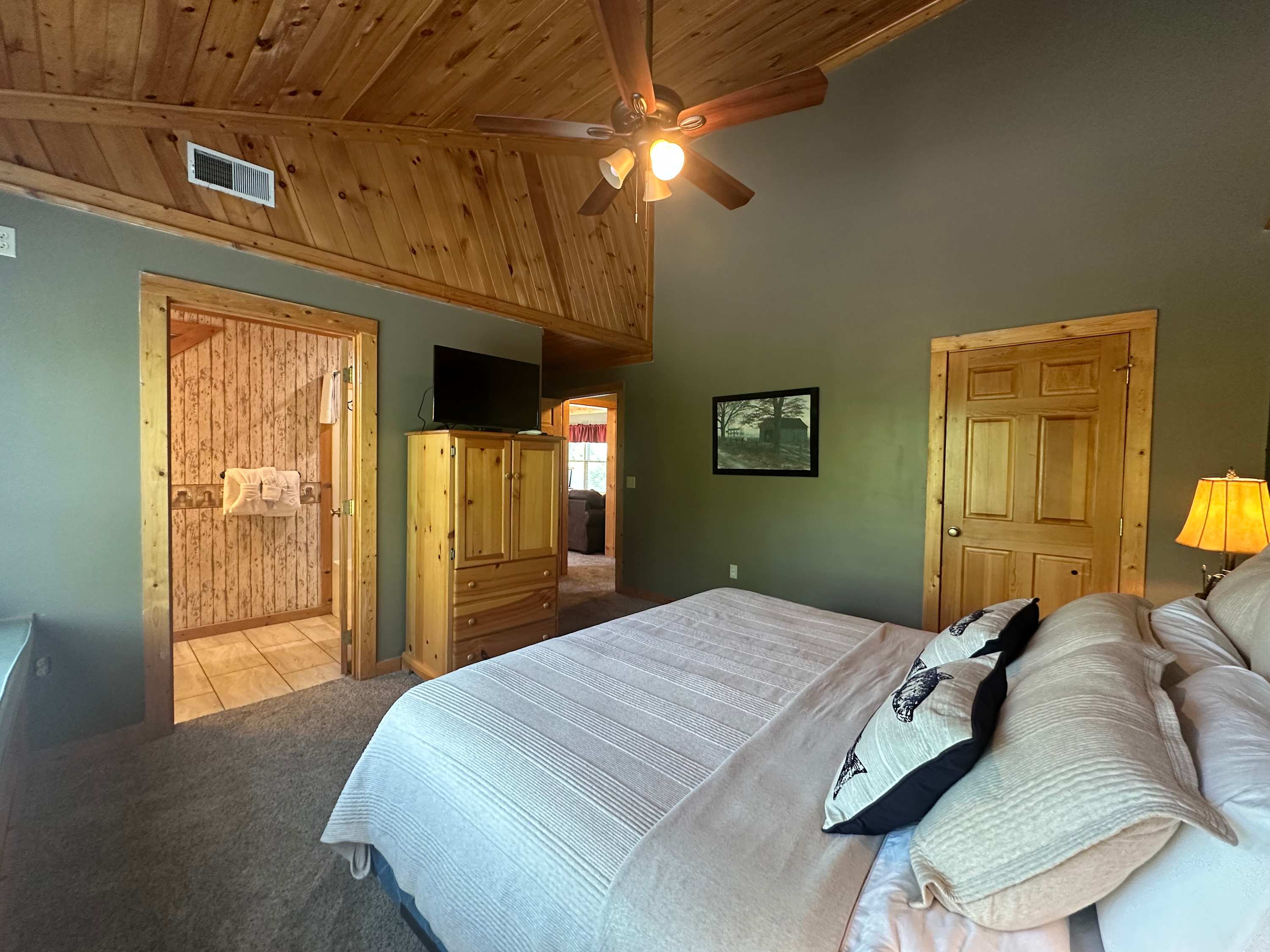 • Bedroom 3: King bed, cable TV; ensuite bathroom with single vanity and shower/tub combo