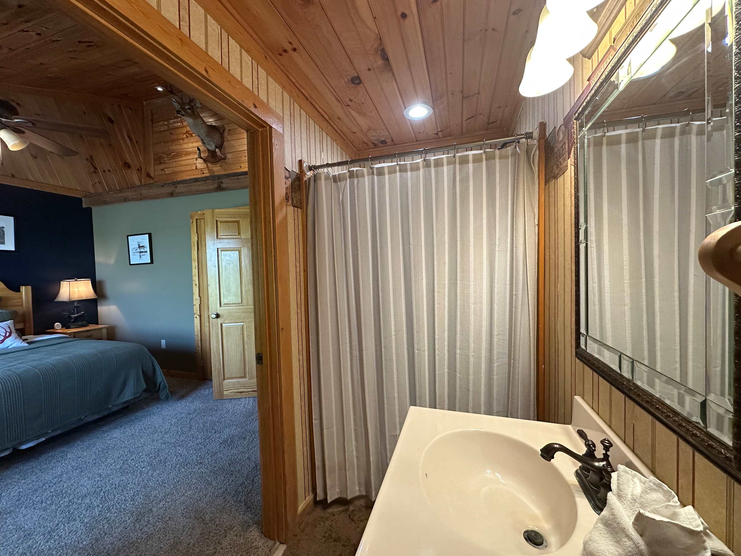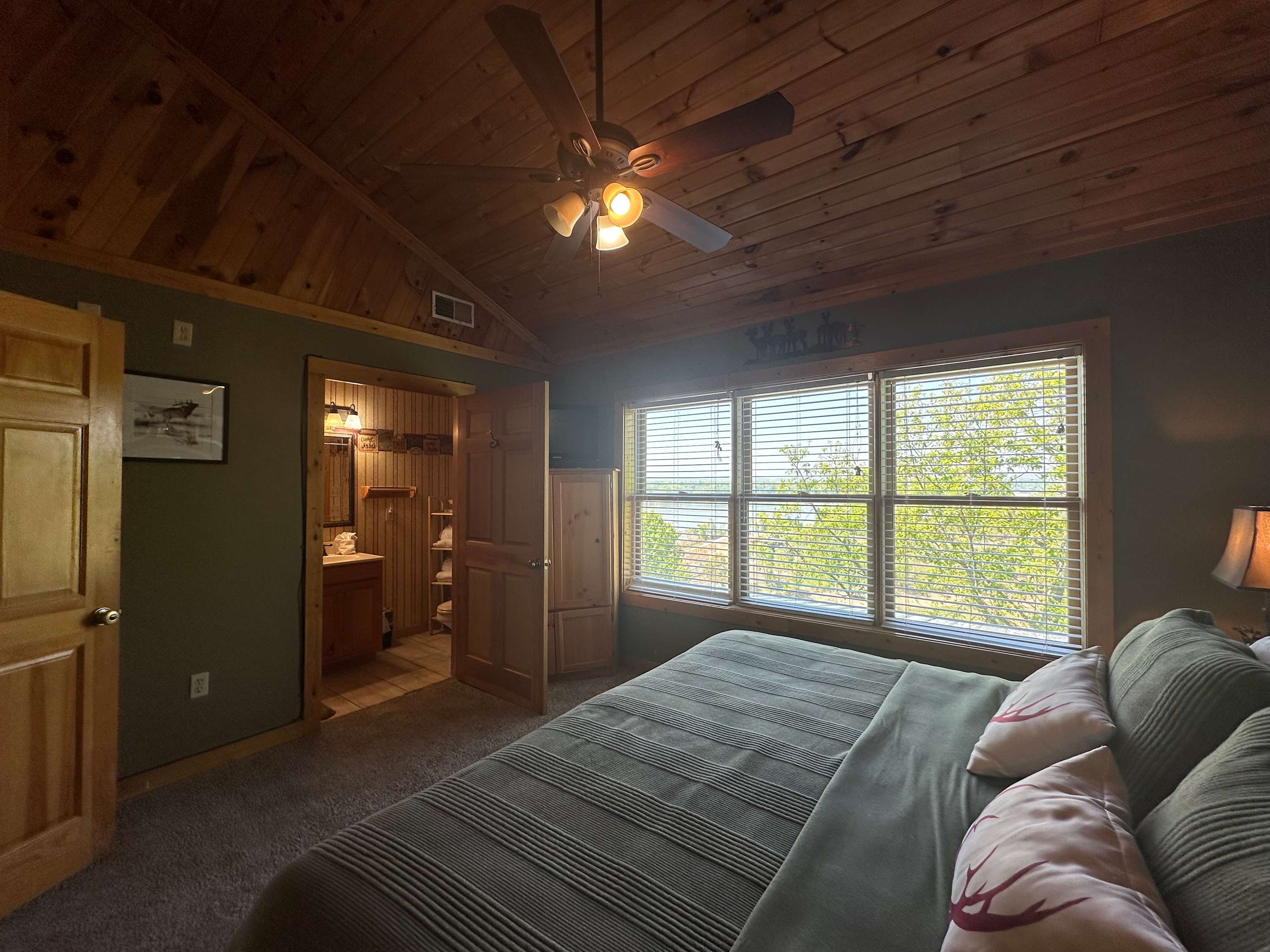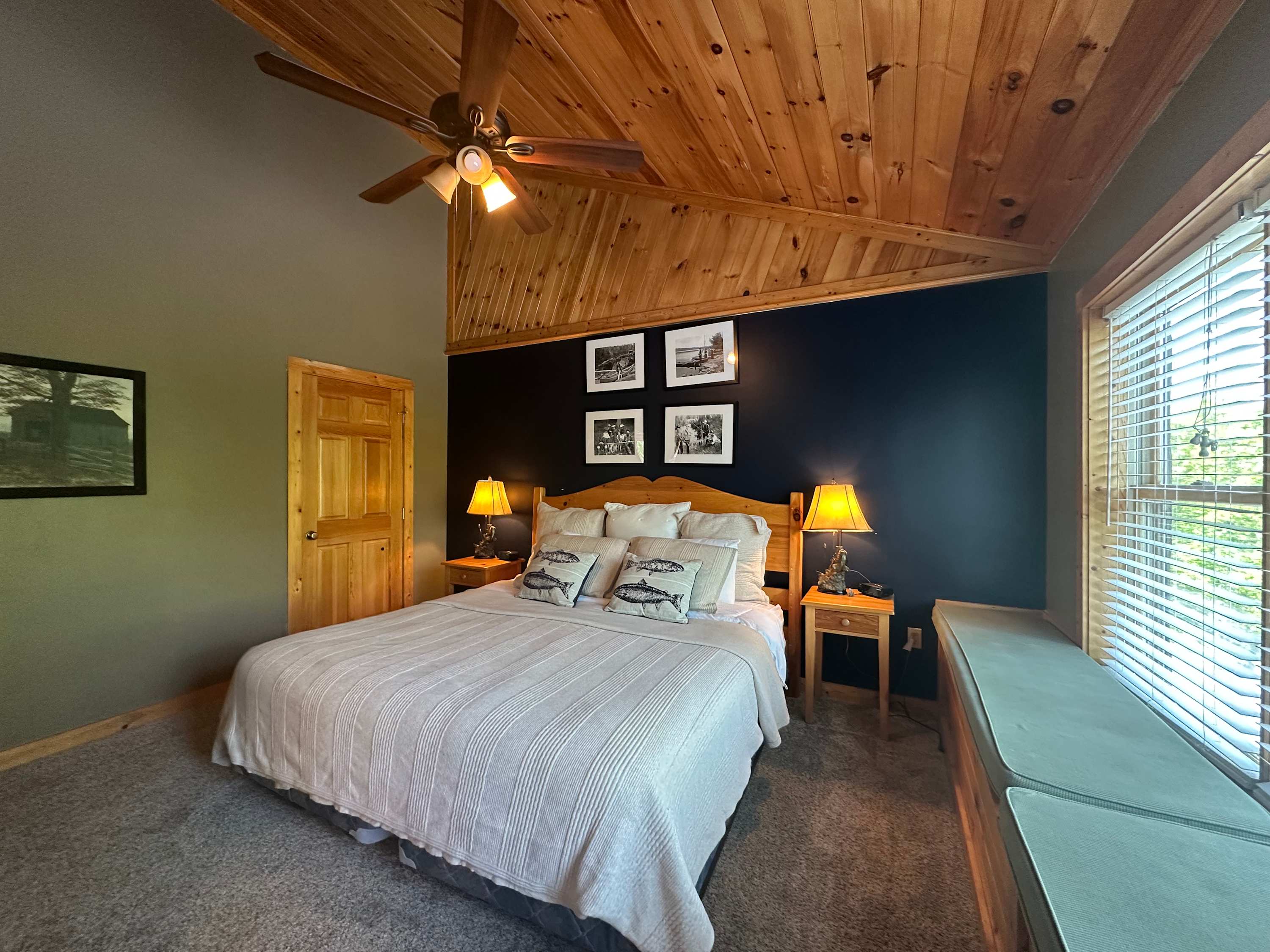 • Bedroom 5: King bed, full-size sleeper sofa in sitting area, cable TV, deck access; ensuite bathroom with single vanity and walk-in shower