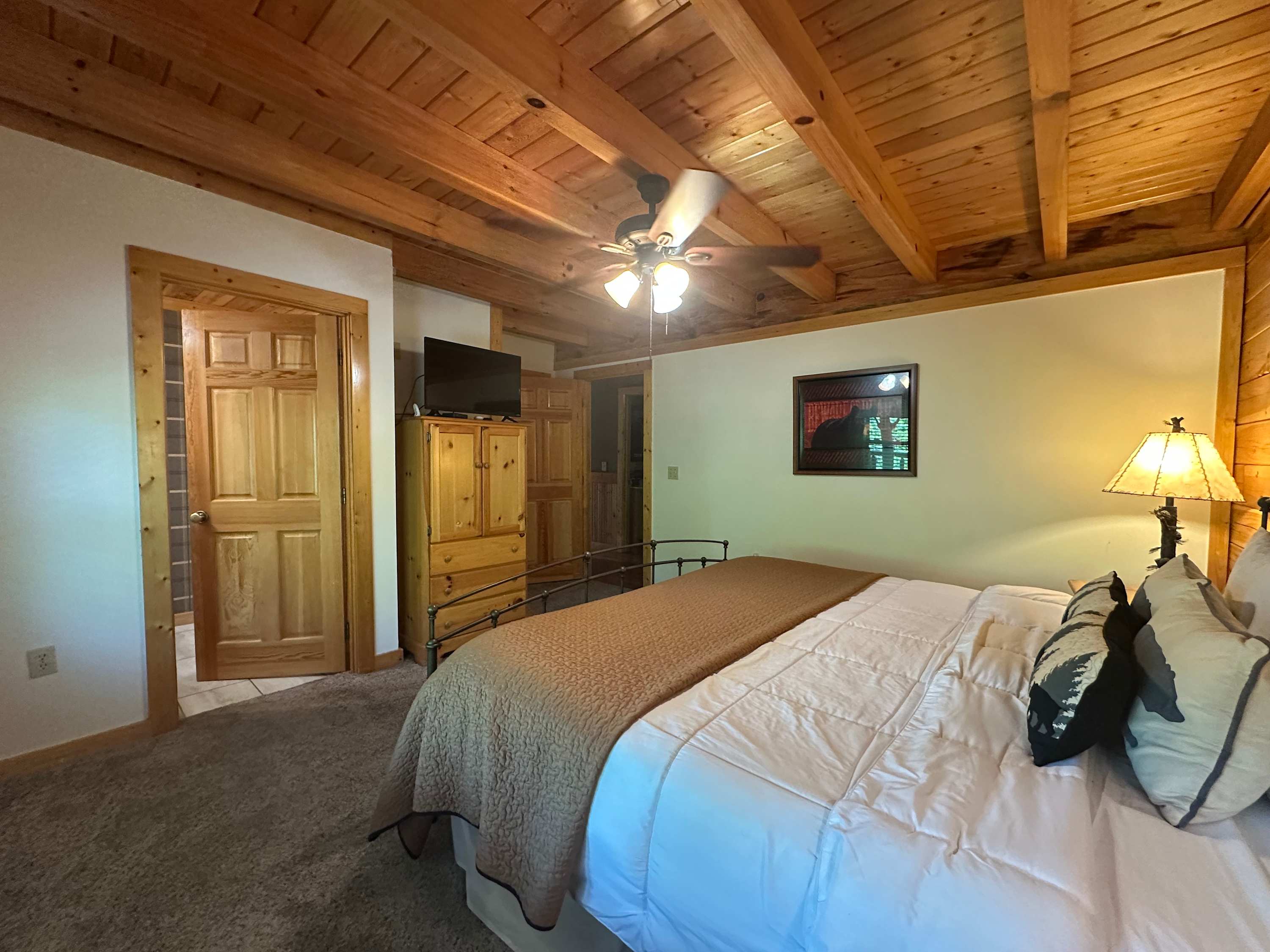 • Bedroom 1: King bed, cable TV; ensuite bathroom with single vanity and walk-in shower