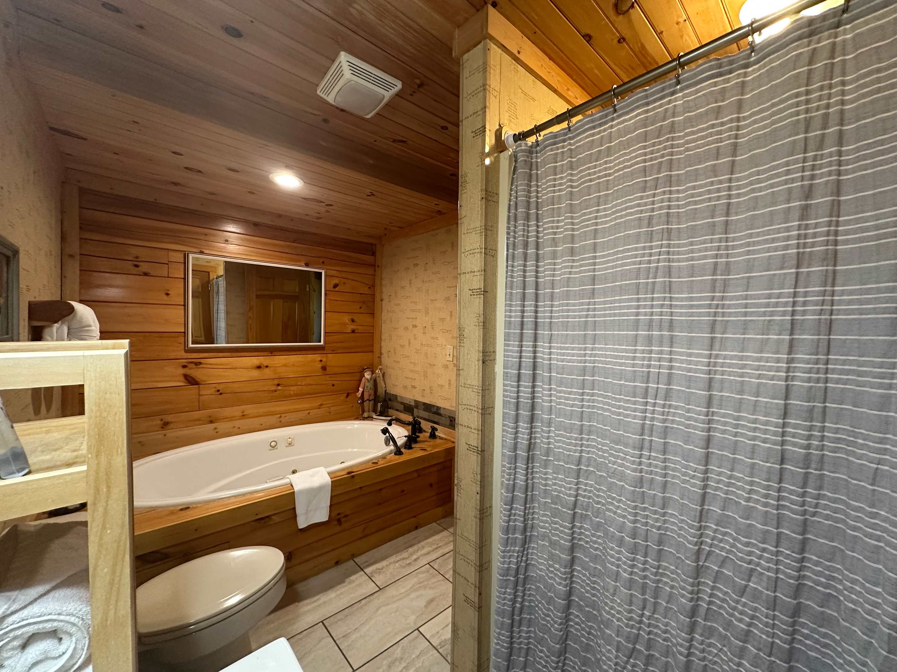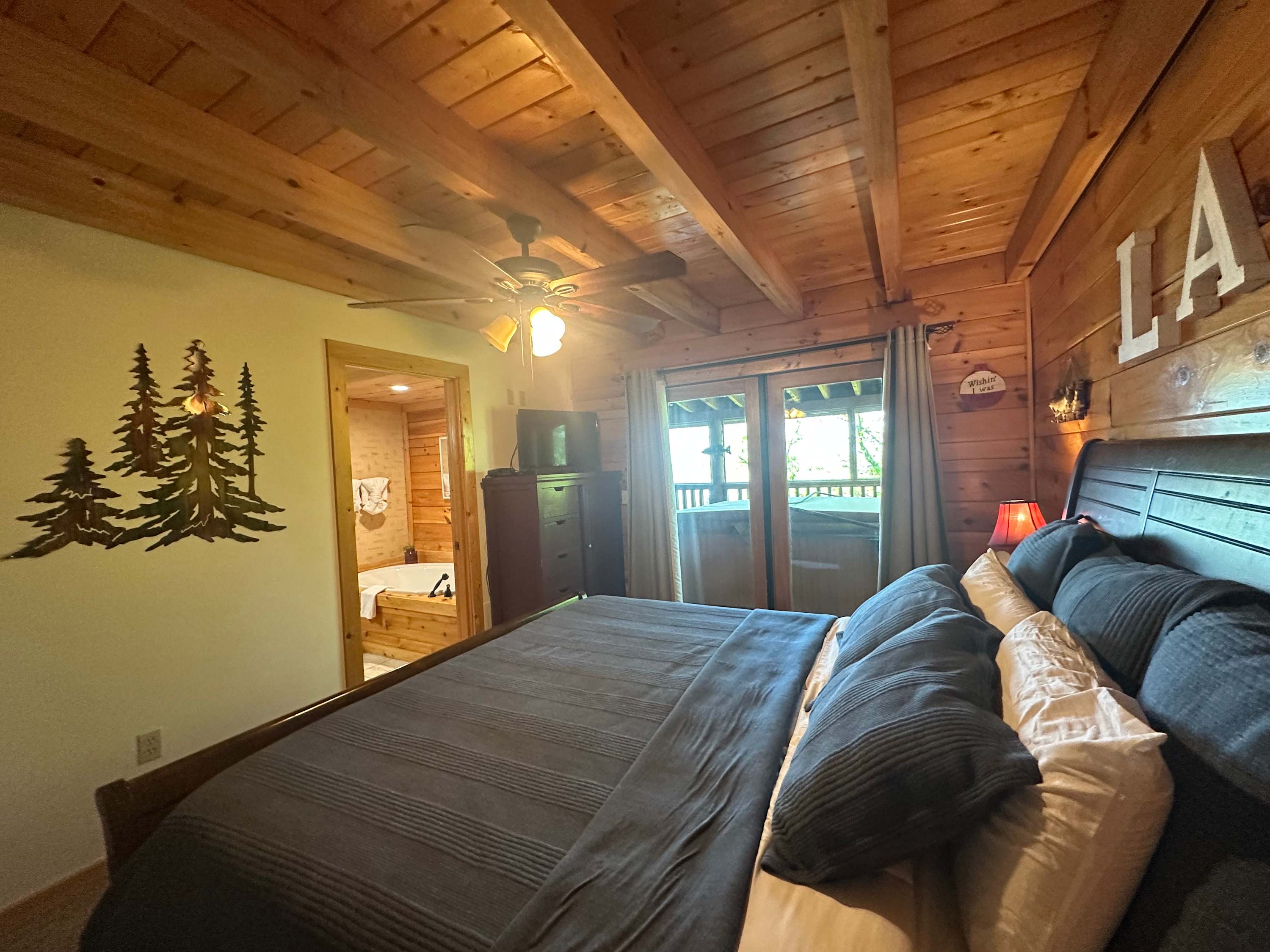 • Bedroom 2: King bed, cable TV, deck access; Jack-and-Jill bathroom with single vanity, jetted tub, and walk-in shower