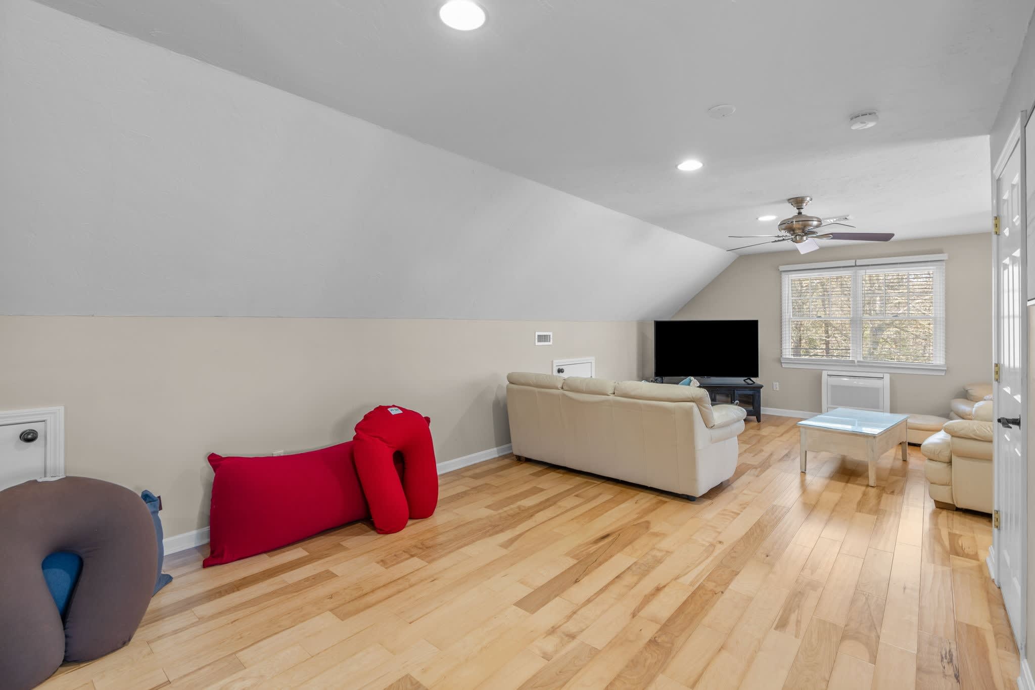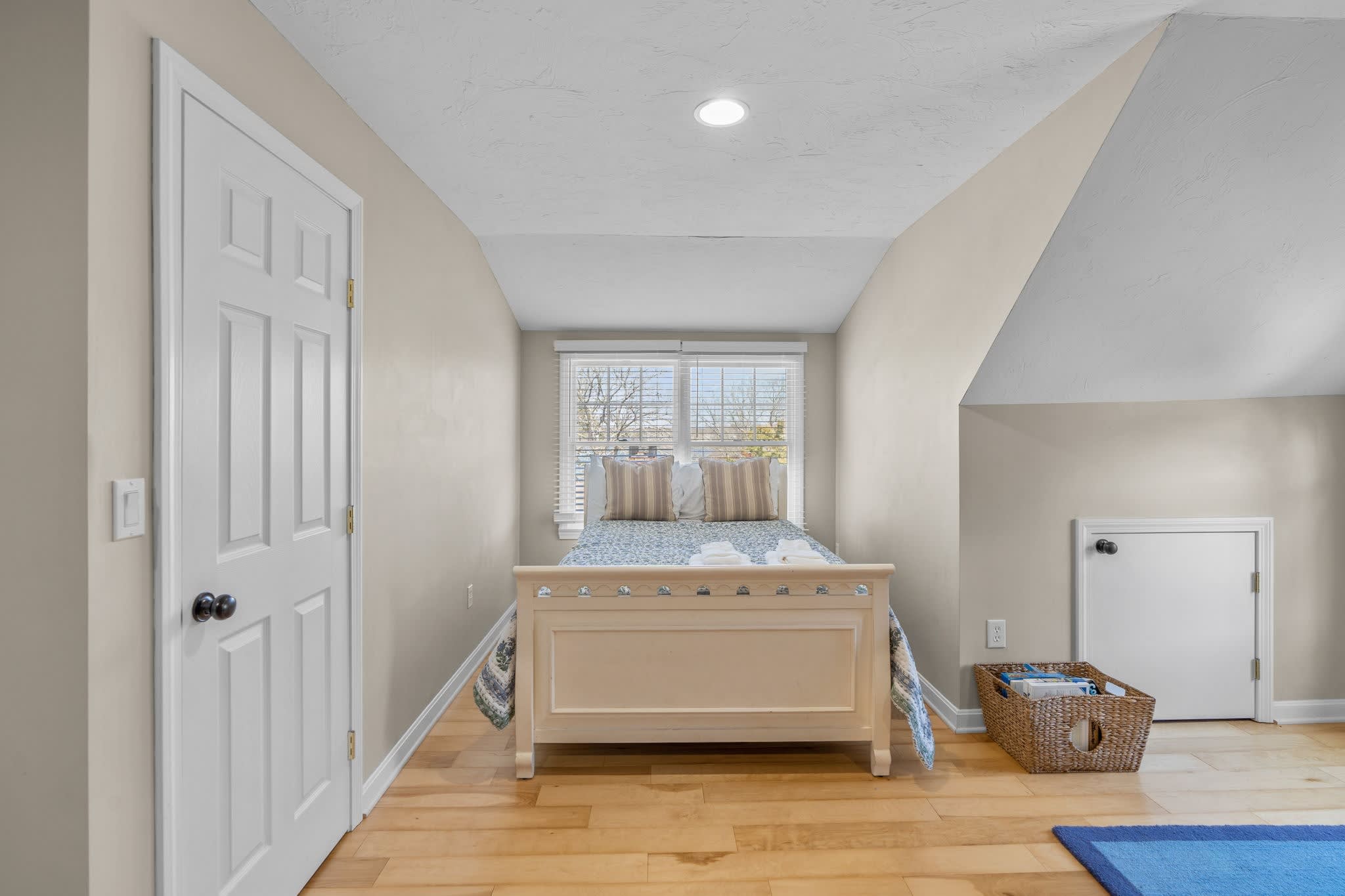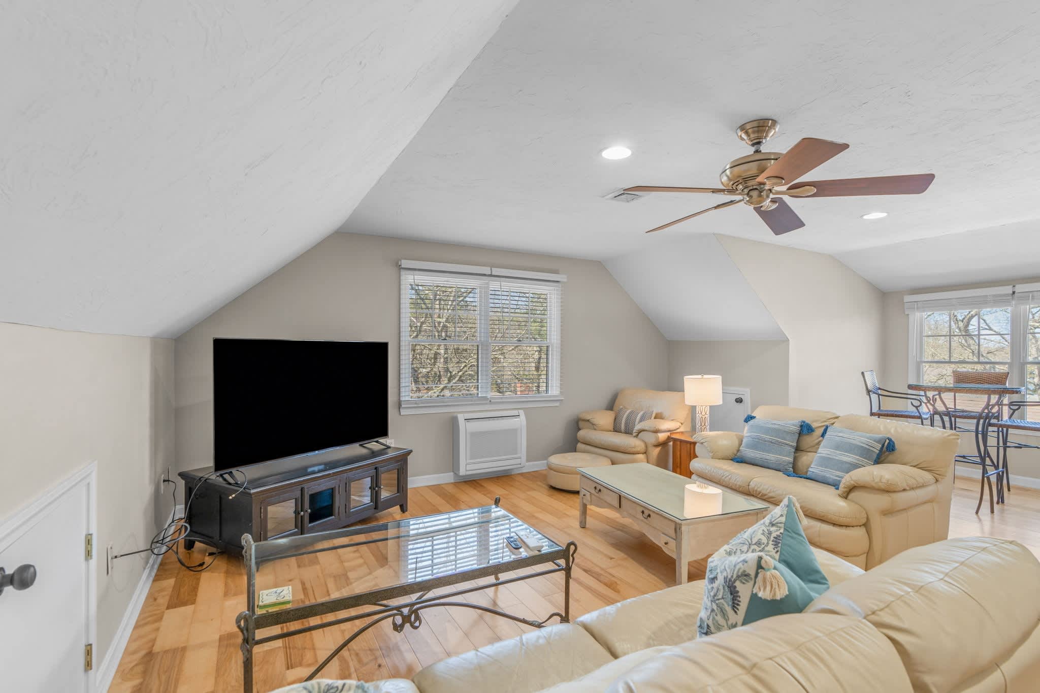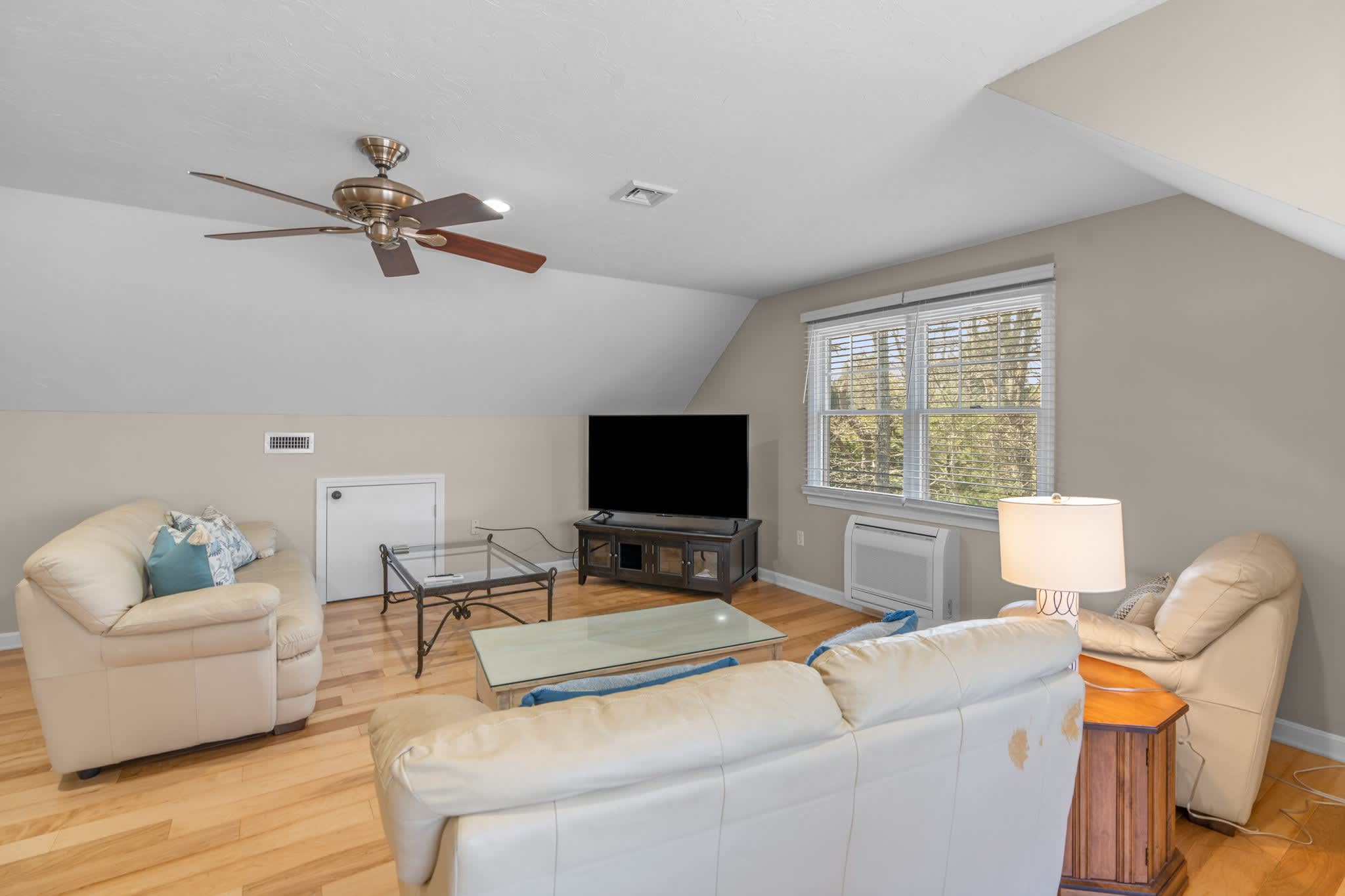 As you move through Summer by the Sea, the comforts continue. Step out to the patio, where seating and a table for four invite al fresco meals or quiet moments with your morning coffee. When it's time to unwind or have fun indoors, head up to the third-floor game room. This cozy retreat boasts two plush couches, a comfy armchair, a smart TV, and a board game table—ideal for evening competitions or relaxing with a view. And speaking of views, the expansive window offers a beautiful look out over a tranquil lake, reminding you at every turn that you’re surrounded by the natural beauty of Cape Cod.
