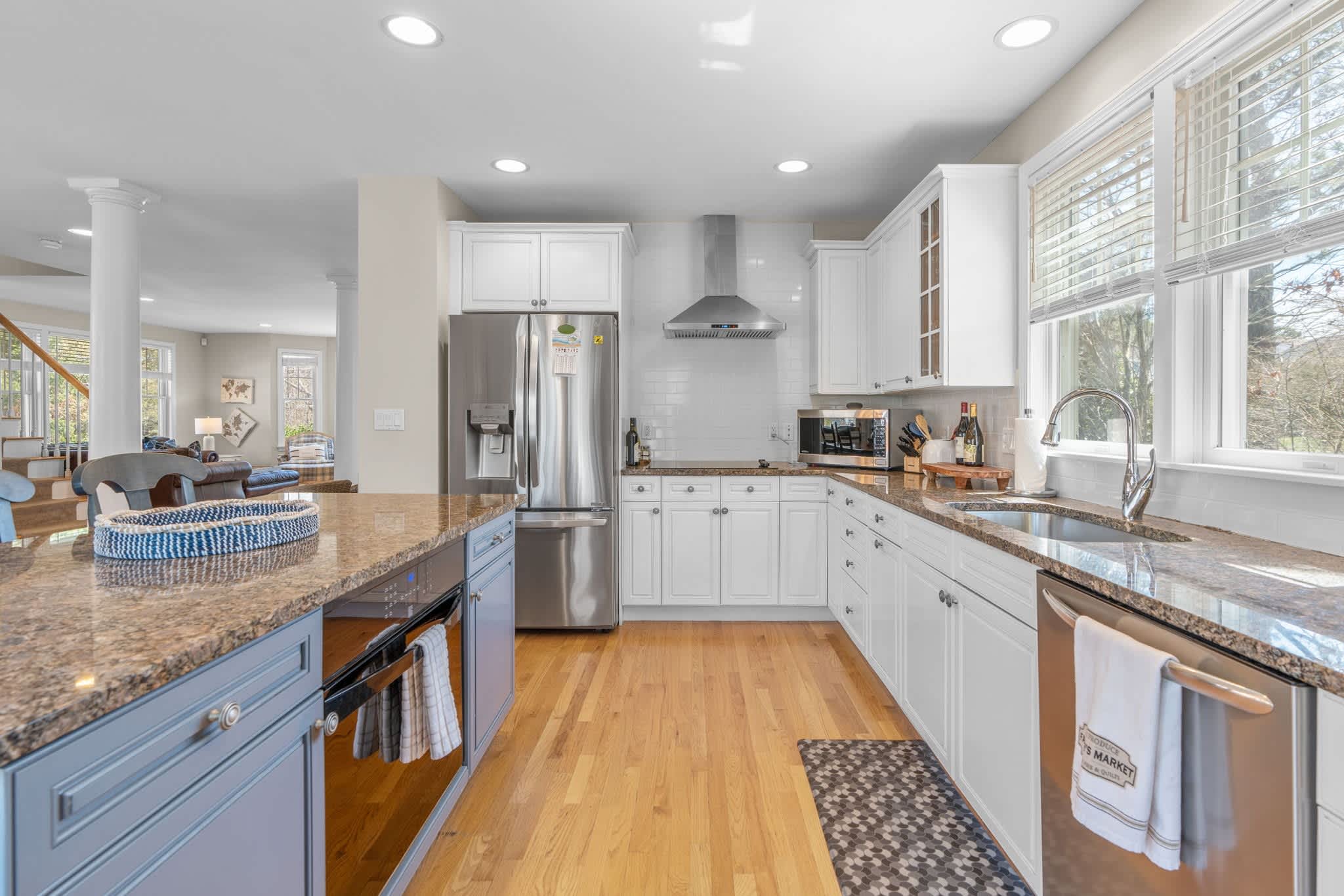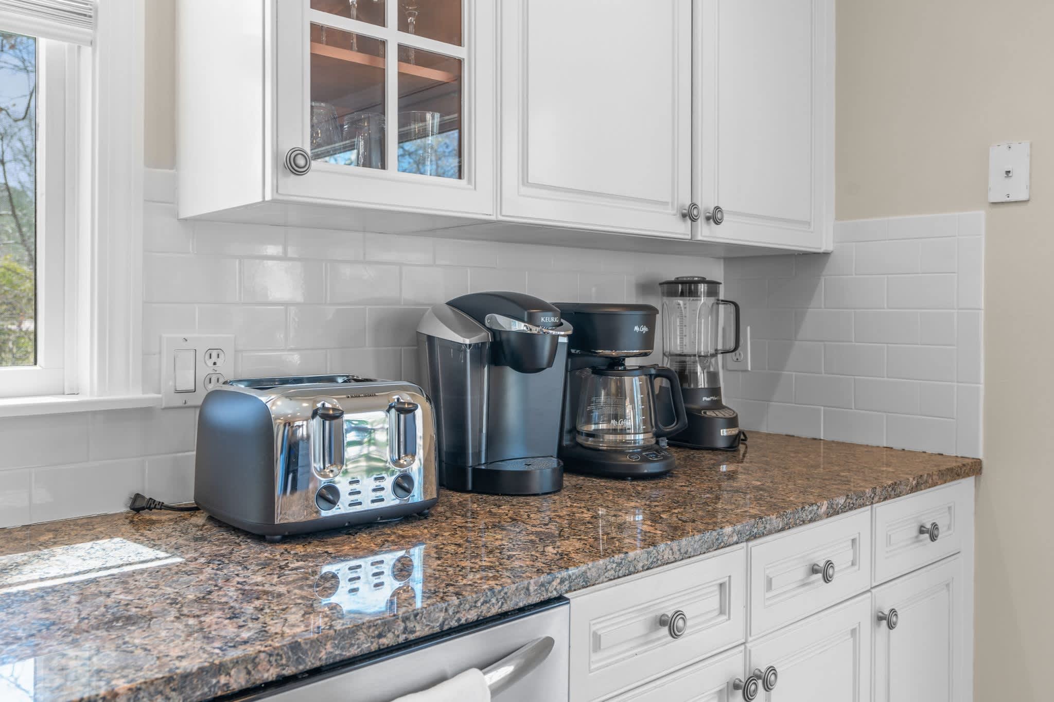 When you head inside, the open-concept living area is warm and inviting, with a large wraparound sectional centered around a cozy fireplace and a smart TV—perfect for movie nights or relaxing after a beach day. Just off the living room, the dining space comfortably seats six and flows into a modern kitchen equipped with sleek stainless steel appliances, stone countertops, and both Keurig and drip coffee makers to suit every morning preference. Pull up a stool at the counter seating for three while someone whips up breakfast or pours a glass of wine at sunset.