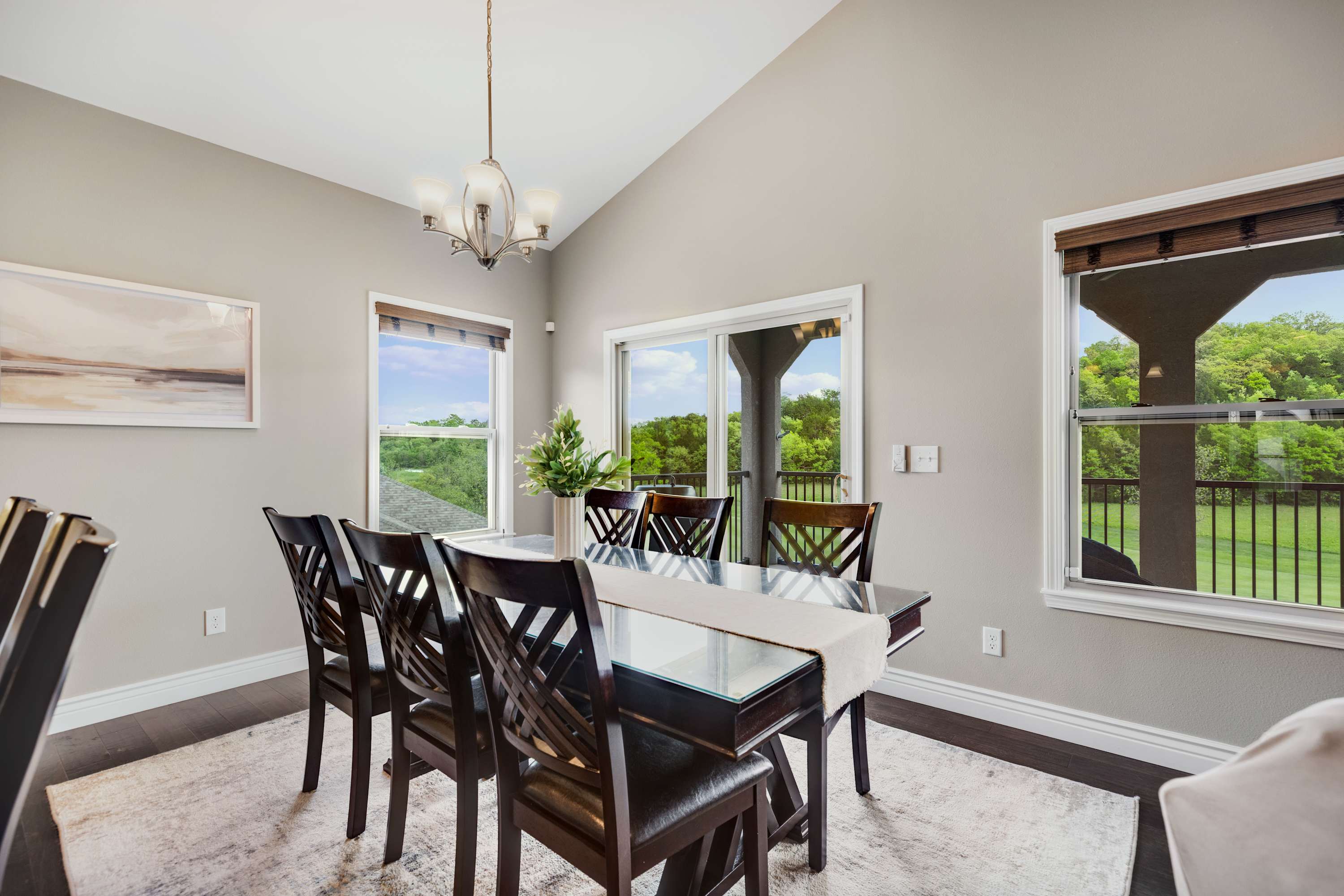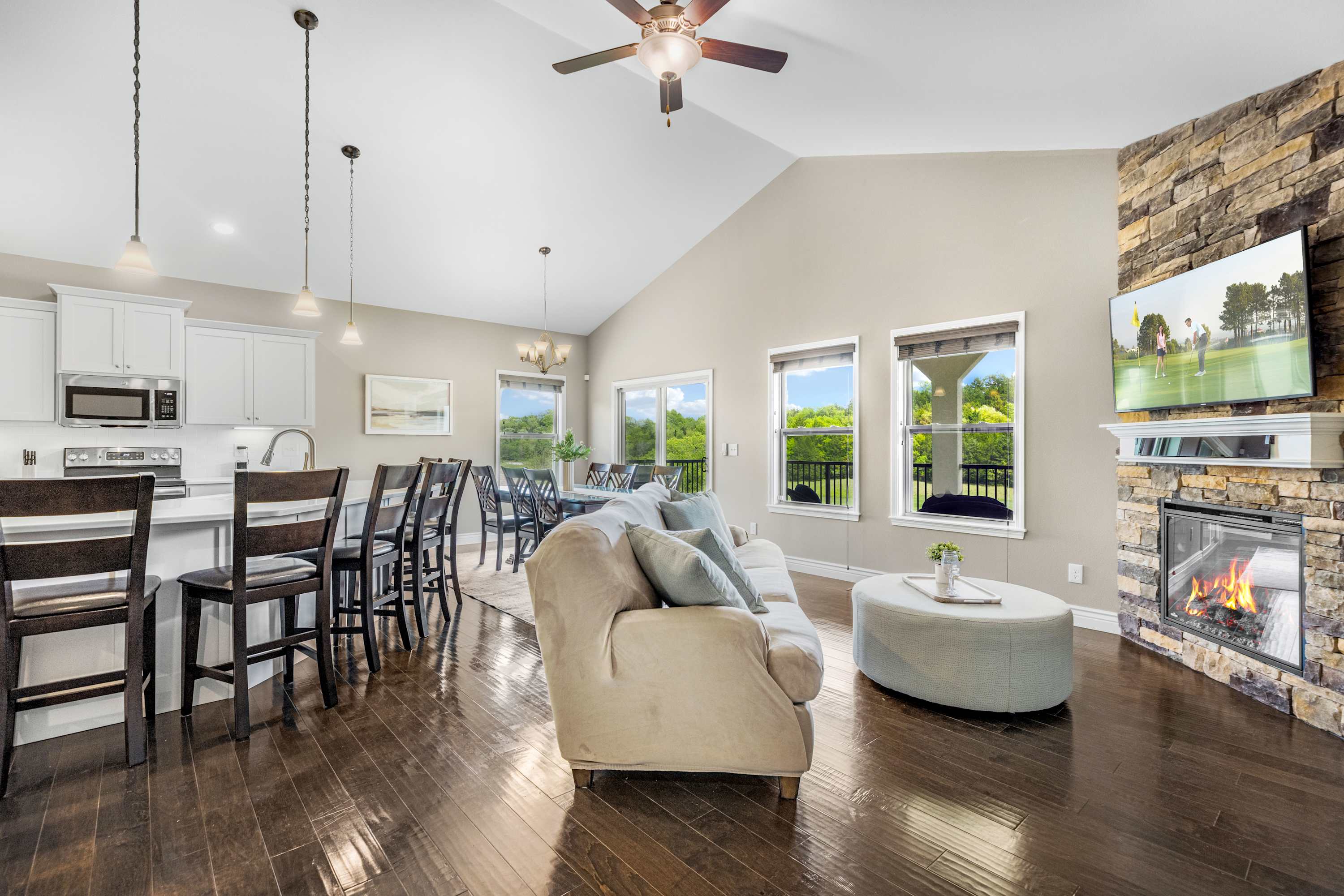 Step inside your beautifully appointed home located on the 12th fairway, and be greeted by an open-concept main living space, where a cozy couch and a fireplace create the perfect setting to unwind after a day outdoors. Adjacent is a sleek, stylish kitchen featuring stone countertops, stainless steel appliances, and both Keurig and drip coffee makers—ideal for mornings that begin at your own pace. The expansive counter seating for six makes casual meals a breeze, while a formal dining table for six invites you to sit down and share stories over dinner. Just beyond the main floor, a covered balcony with comfortable seating overlooks the lush greens of the golf course—a picture-perfect spot for your morning coffee or a glass of wine at sunset.