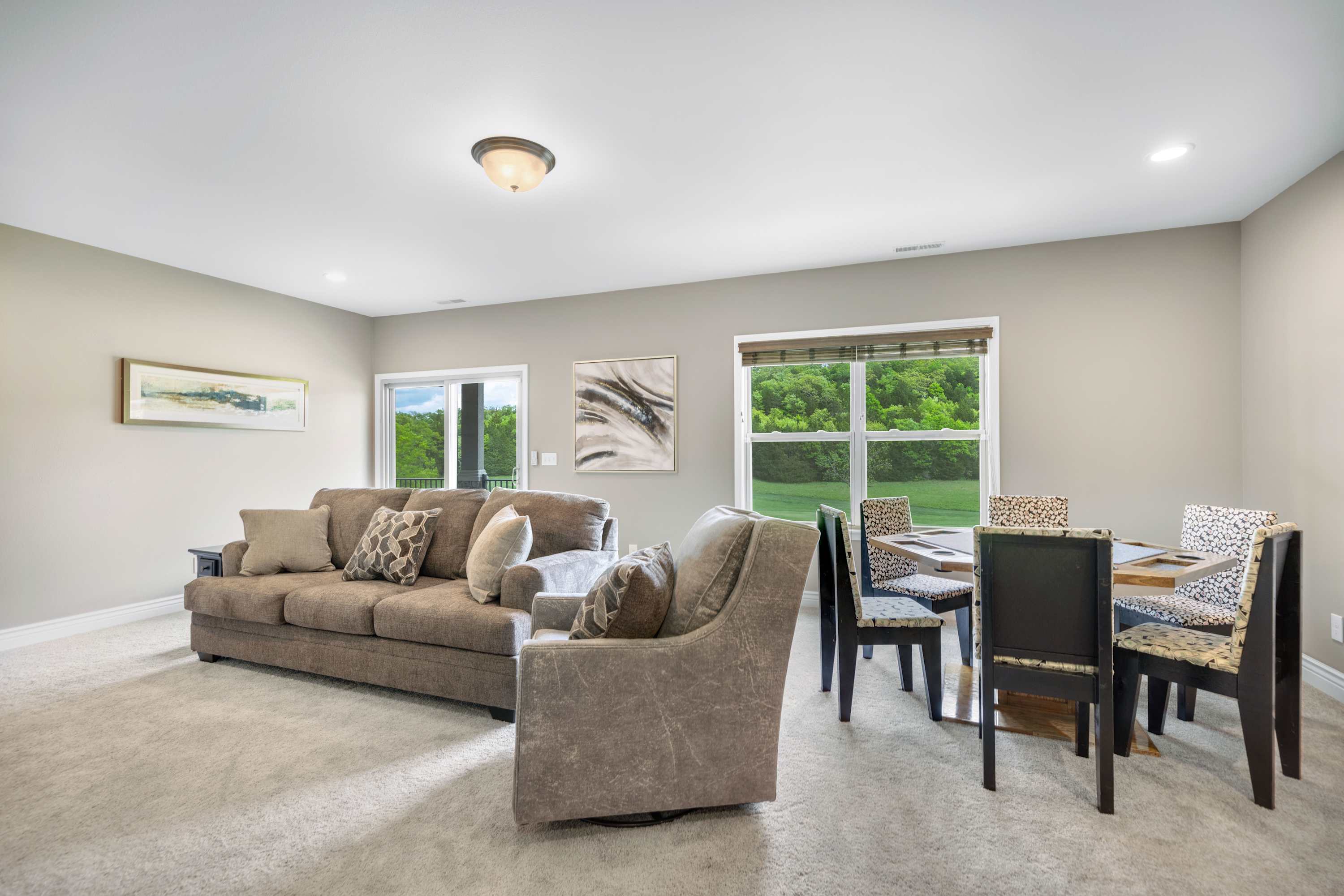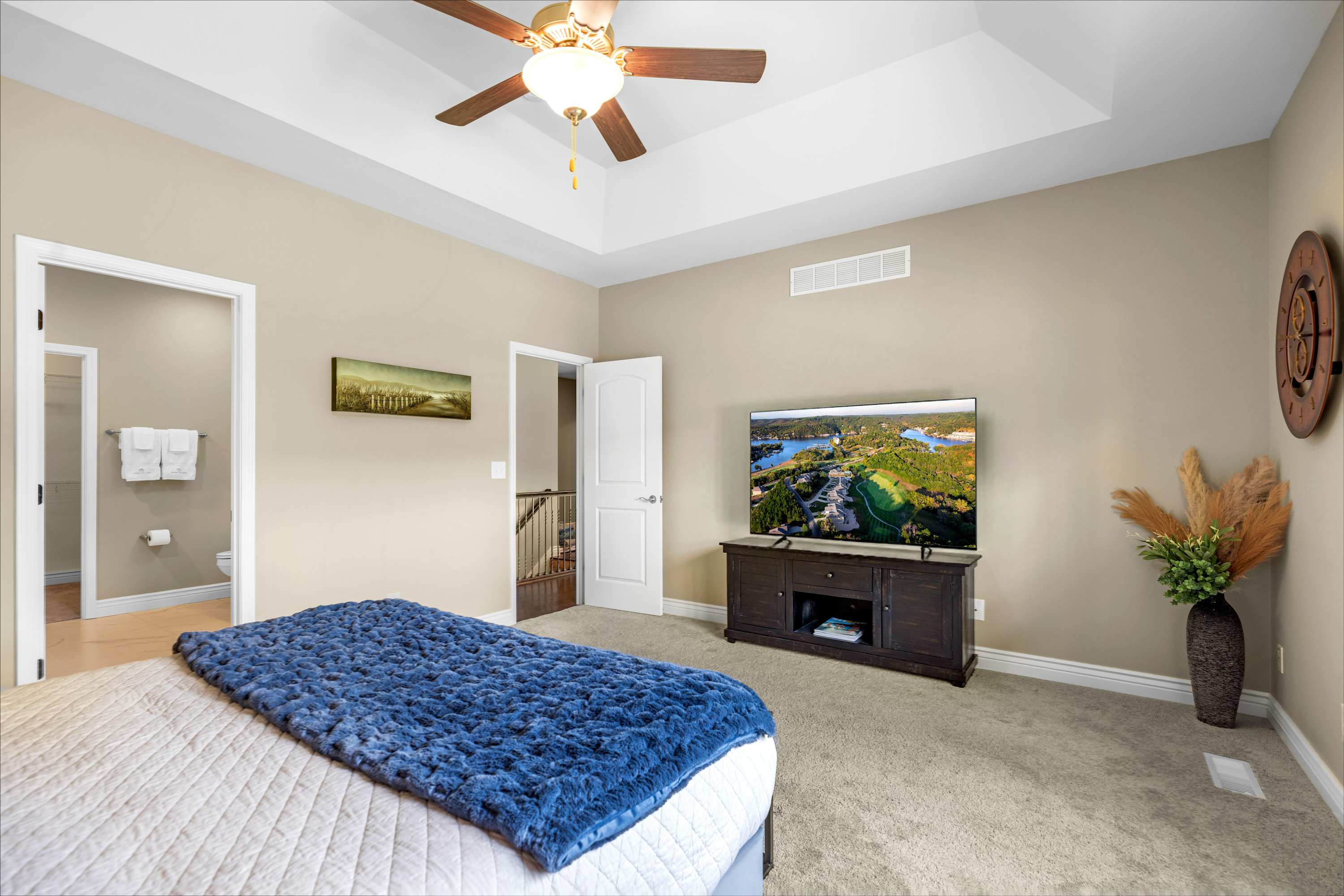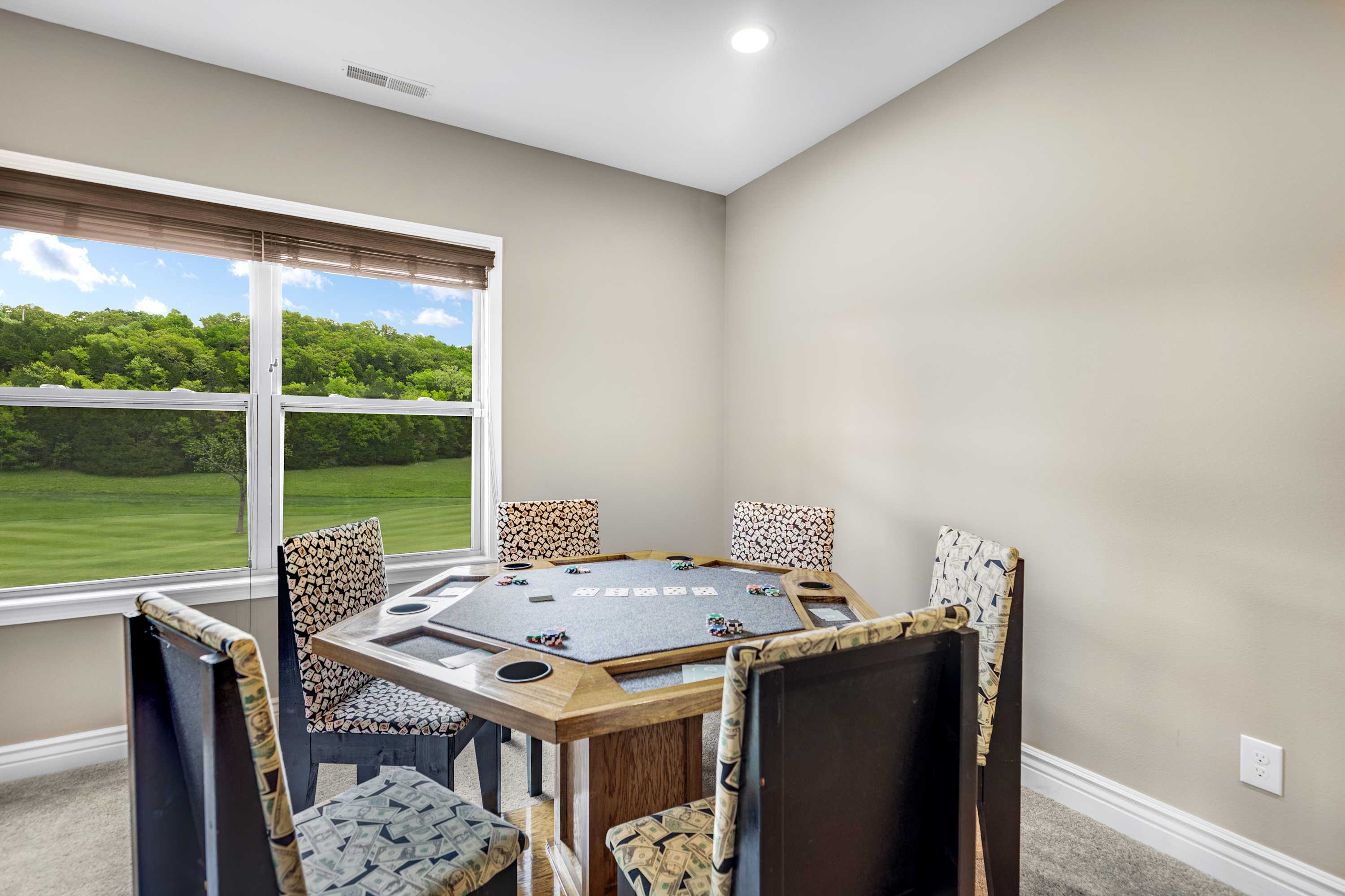 Downstairs, the second living area opens up a world of entertainment. Sink into the couch or armchair and stream a movie or catch a game, then gather around the poker table for a little friendly competition. Board games and additional space make it a hub for both kids and adults to relax and play. Step out onto the lower-level balcony where lounge chairs await, offering another private outdoor retreat for sunbathing or stargazing. With space to spread out, amenities at your fingertips, and a prime location in the heart of Missouri’s lake country, Fairway Lake Retreat is the perfect blend of comfort, luxury, and adventure.