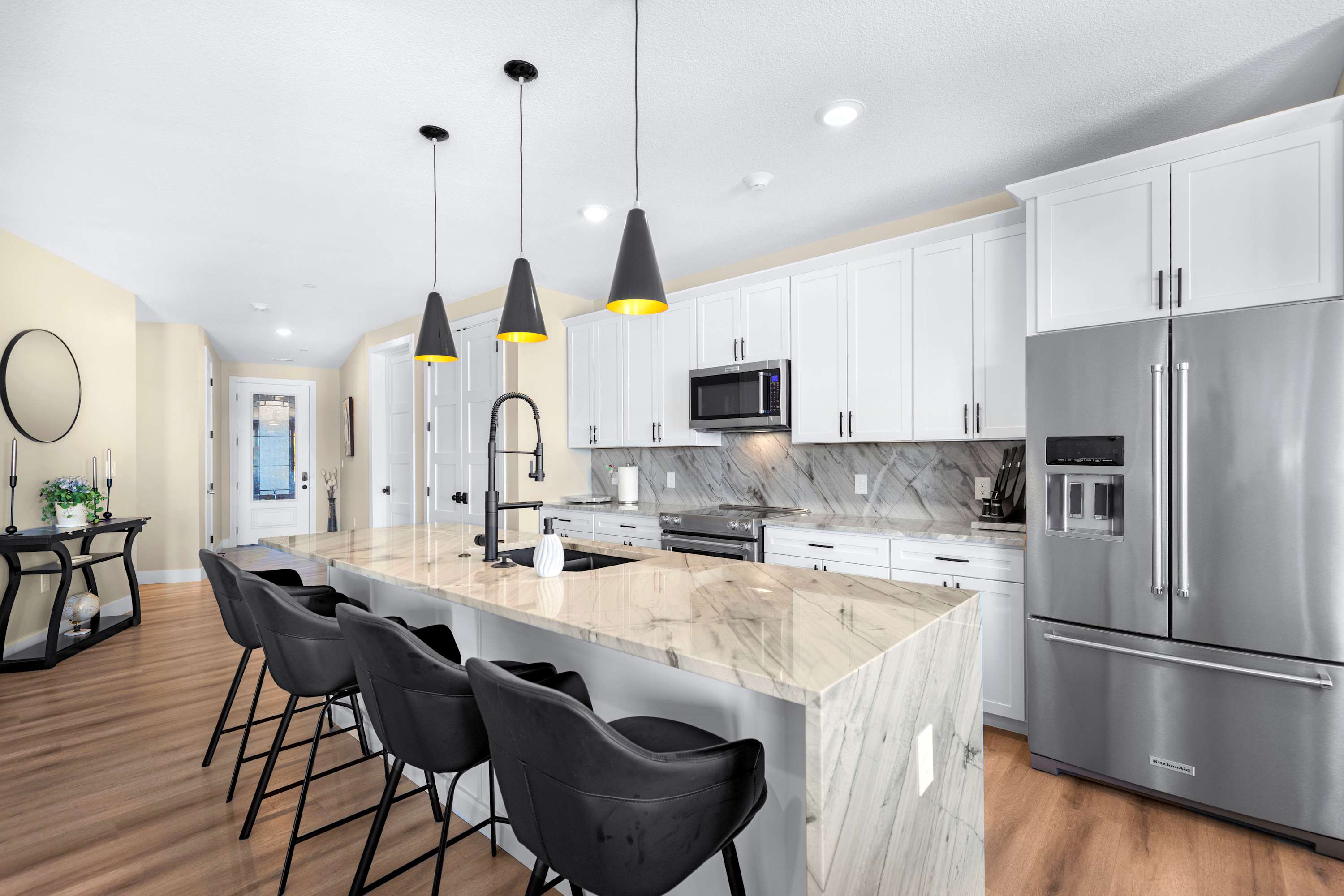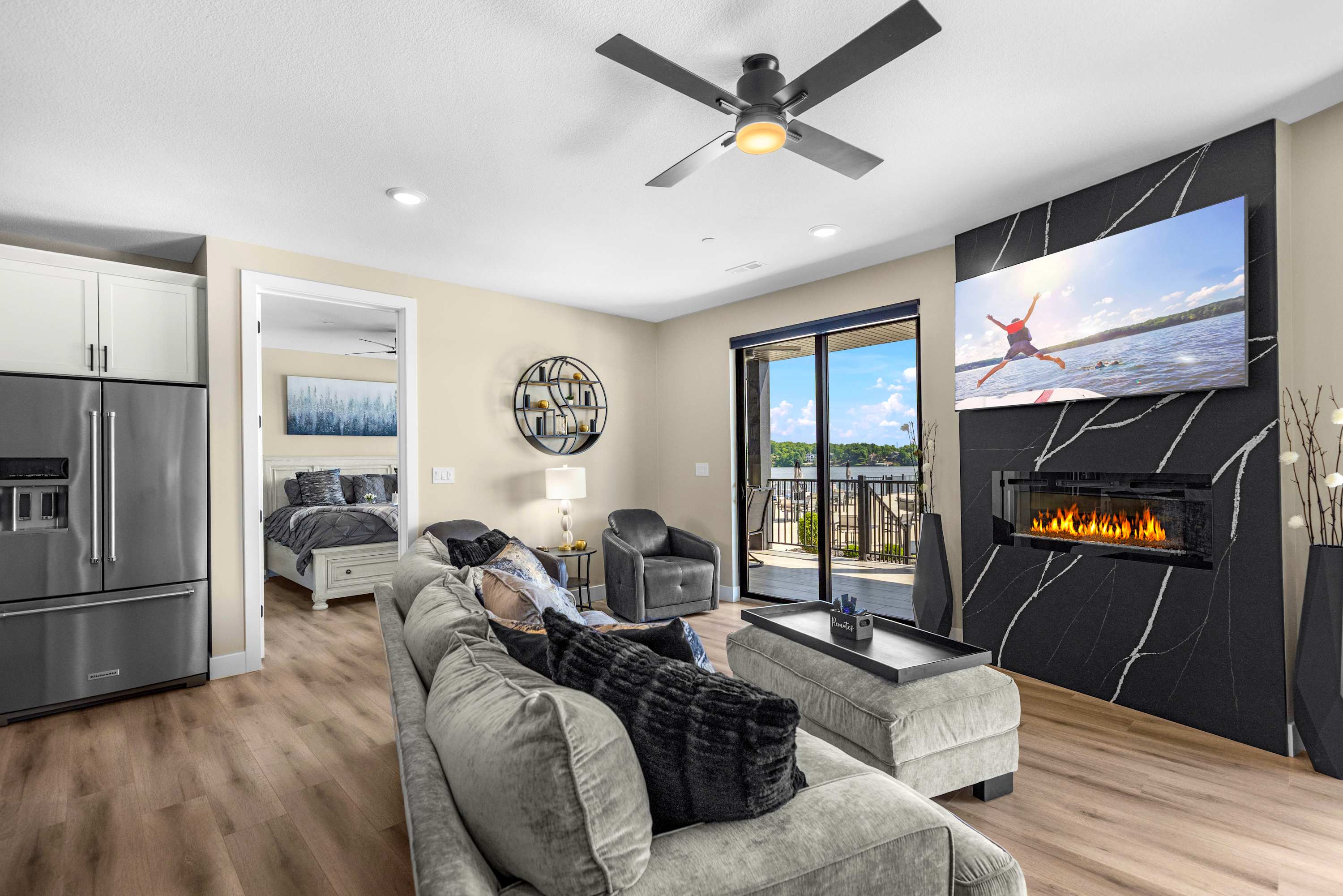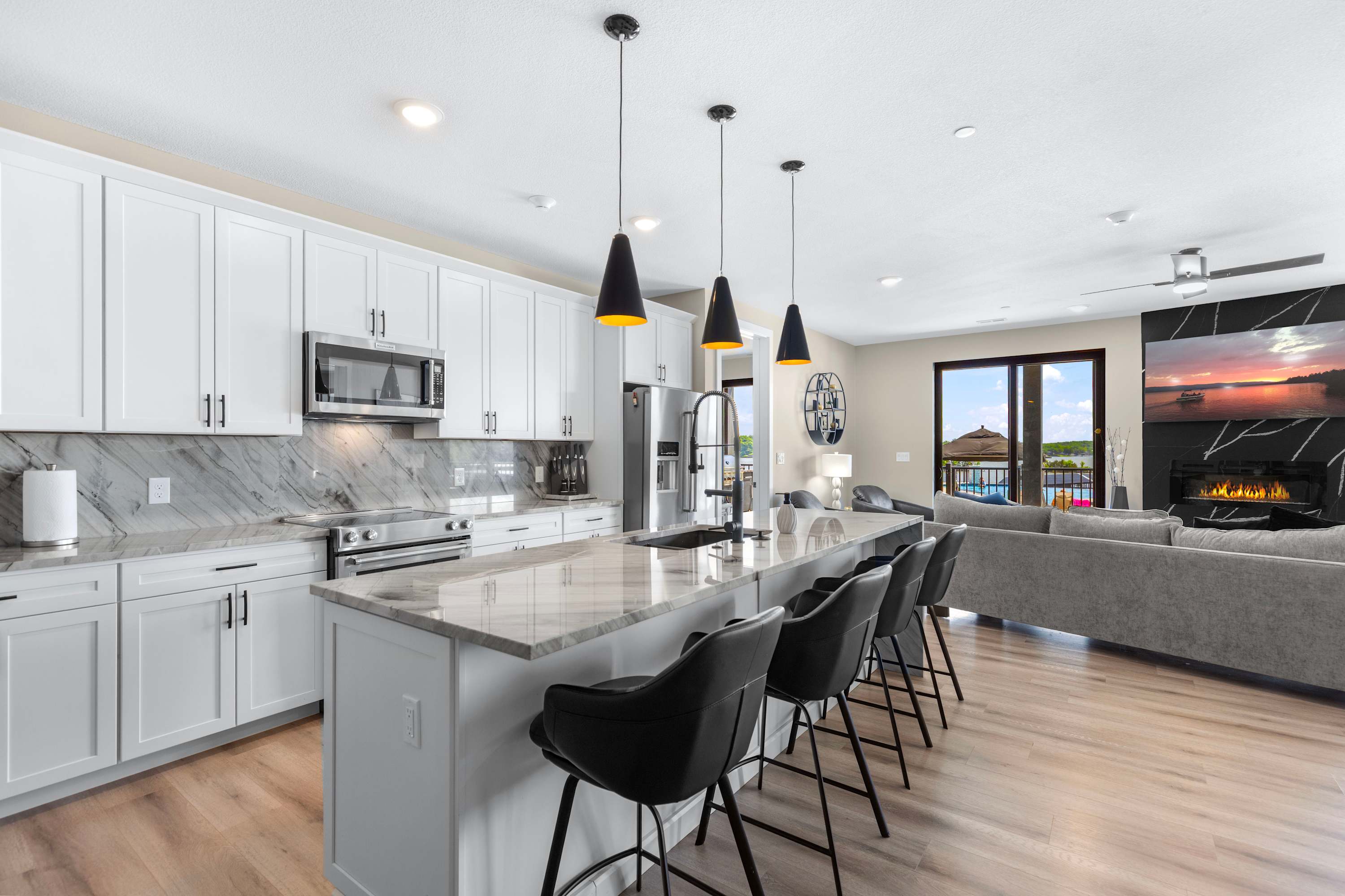 Step into your beautifully designed home and be immediately drawn to the expansive kitchen—a true showstopper. Outfitted with sleek white cabinetry, stone countertops, and top-tier stainless steel appliances, it’s both stylish and functional. Start your mornings with your choice of drip or single-cup Ninja coffee from the dual coffee station, then settle in at one of the two spacious counters, offering seating for eight. Just beyond, the open-concept living room invites you to relax by the fireplace, with lake views visible through sliding glass doors. Sink into the plush couch or one of three cozy armchairs and enjoy a movie on the smart TV—or step outside for something even better.