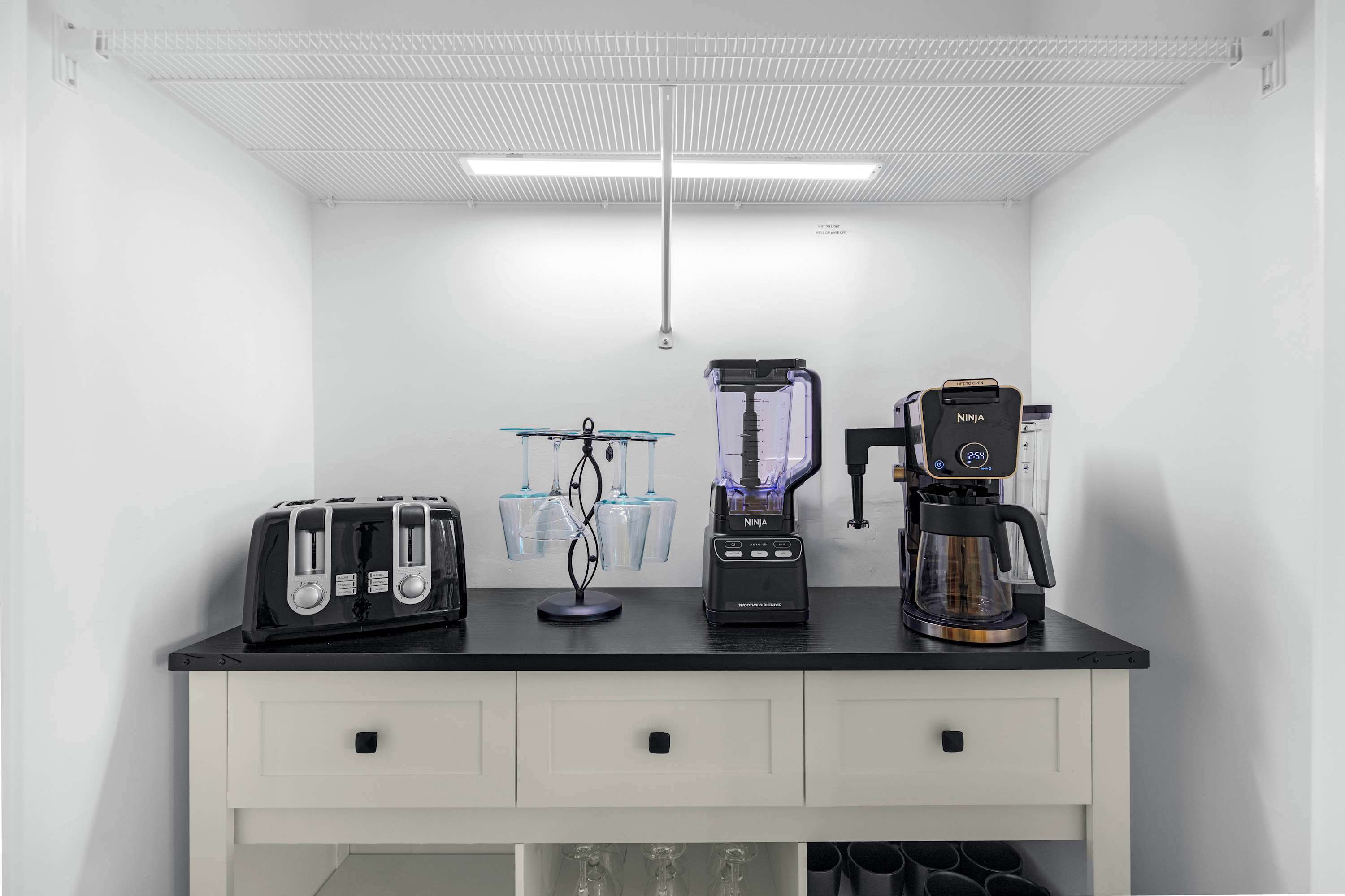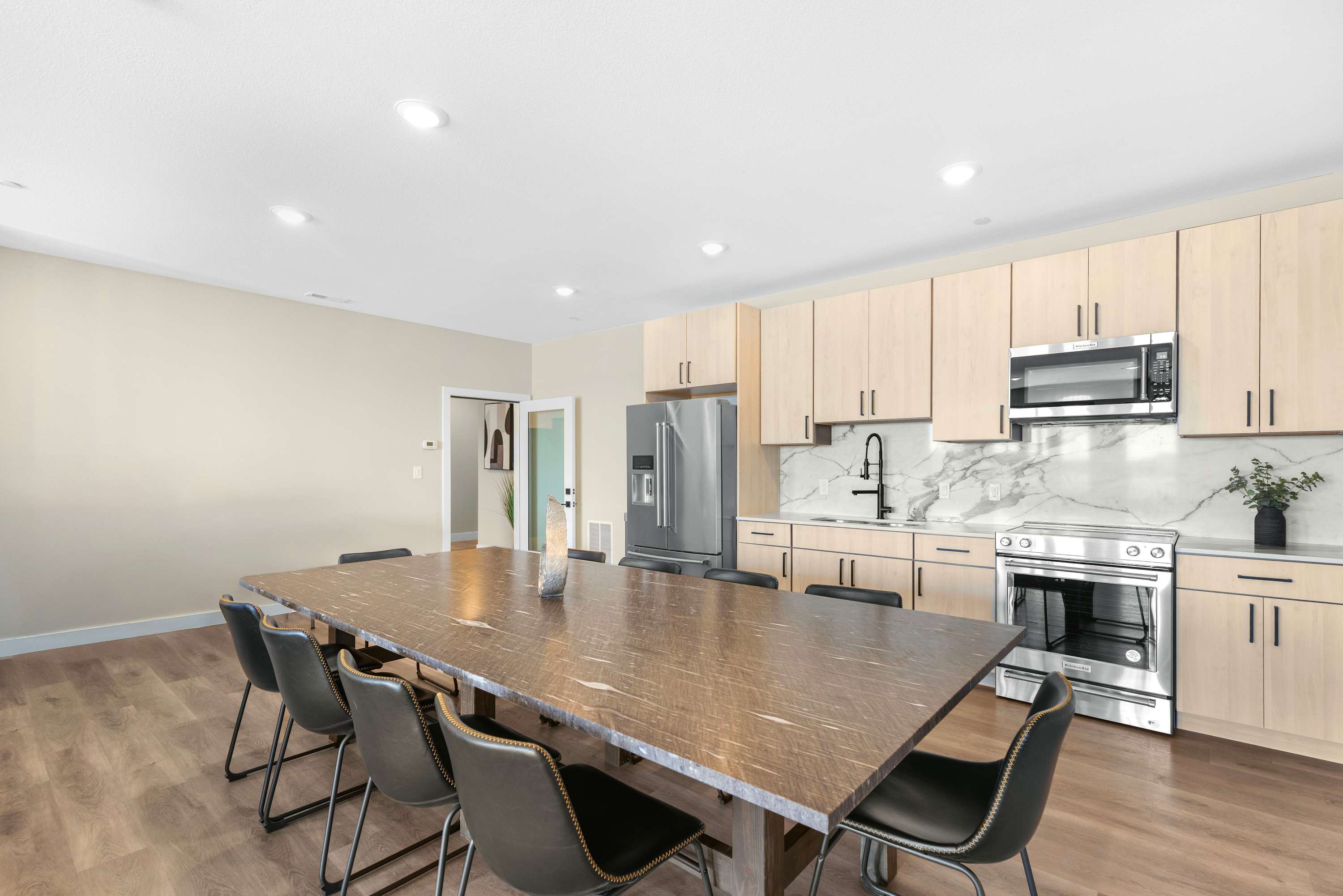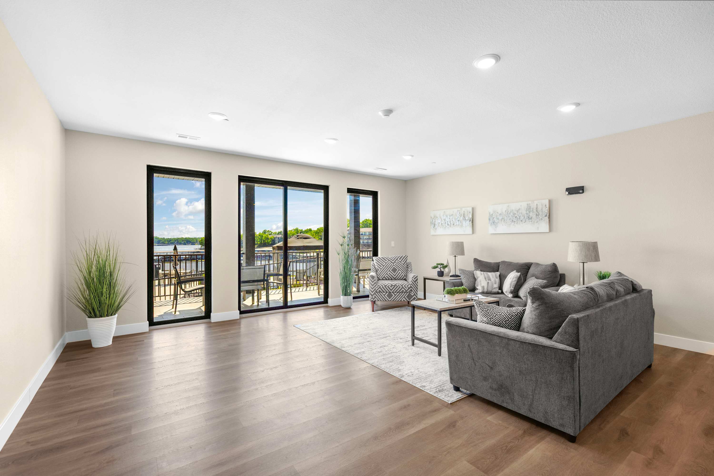 Step into your beautifully designed home and be immediately drawn to the expansive kitchen—a true showstopper. Outfitted with sleek white cabinetry, stone countertops, and top-tier stainless steel appliances, it’s both stylish and functional. Start your mornings with your choice of drip or single-cup Ninja coffee from the dual coffee station, then settle in at one of the two spacious counters, offering seating for eight. Just beyond, the open-concept living room invites you to relax by the fireplace, with lake views visible through sliding glass doors. Sink into the plush couch or one of three cozy armchairs and enjoy a movie on the smart TV—or step outside for something even better.