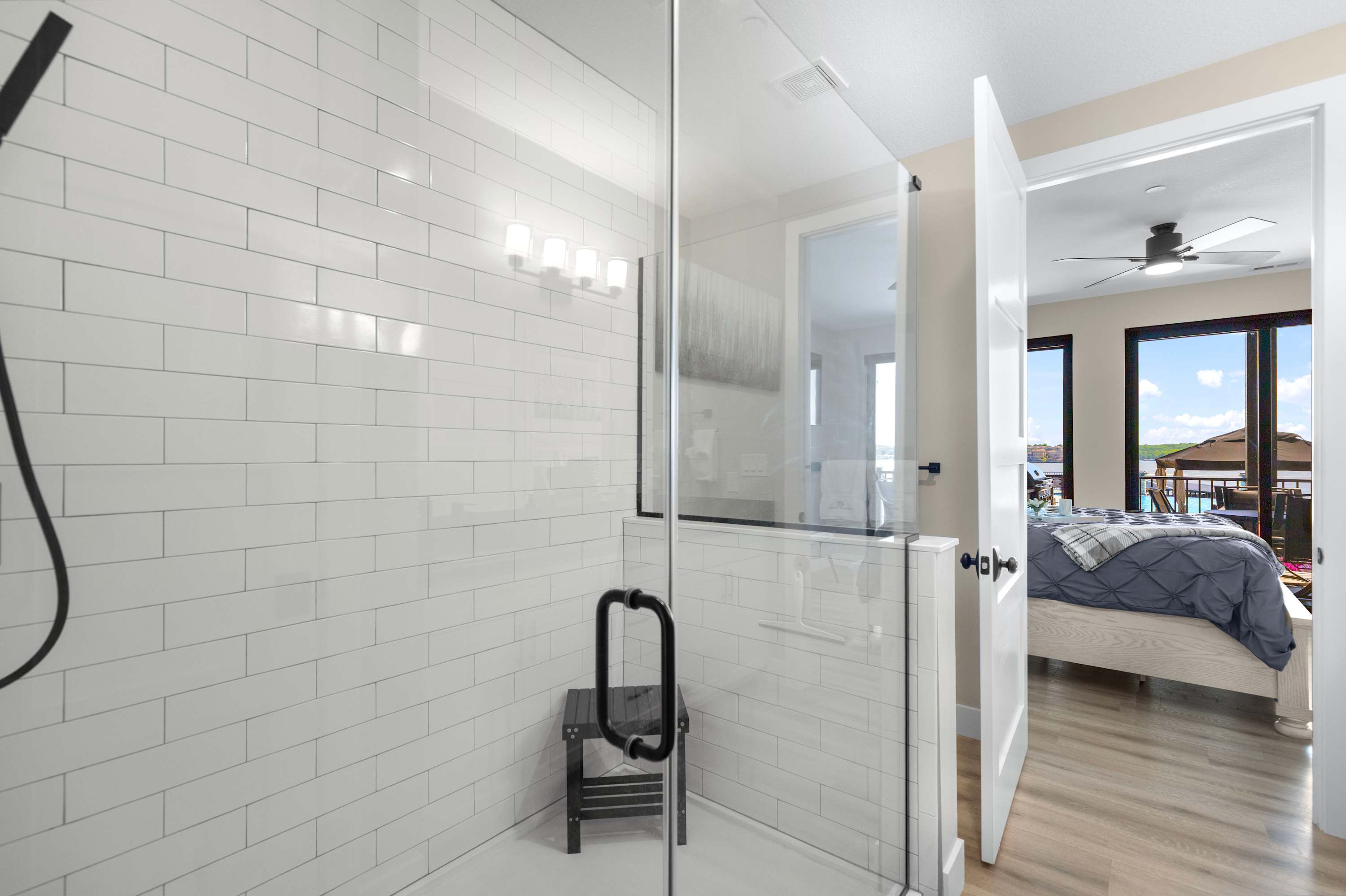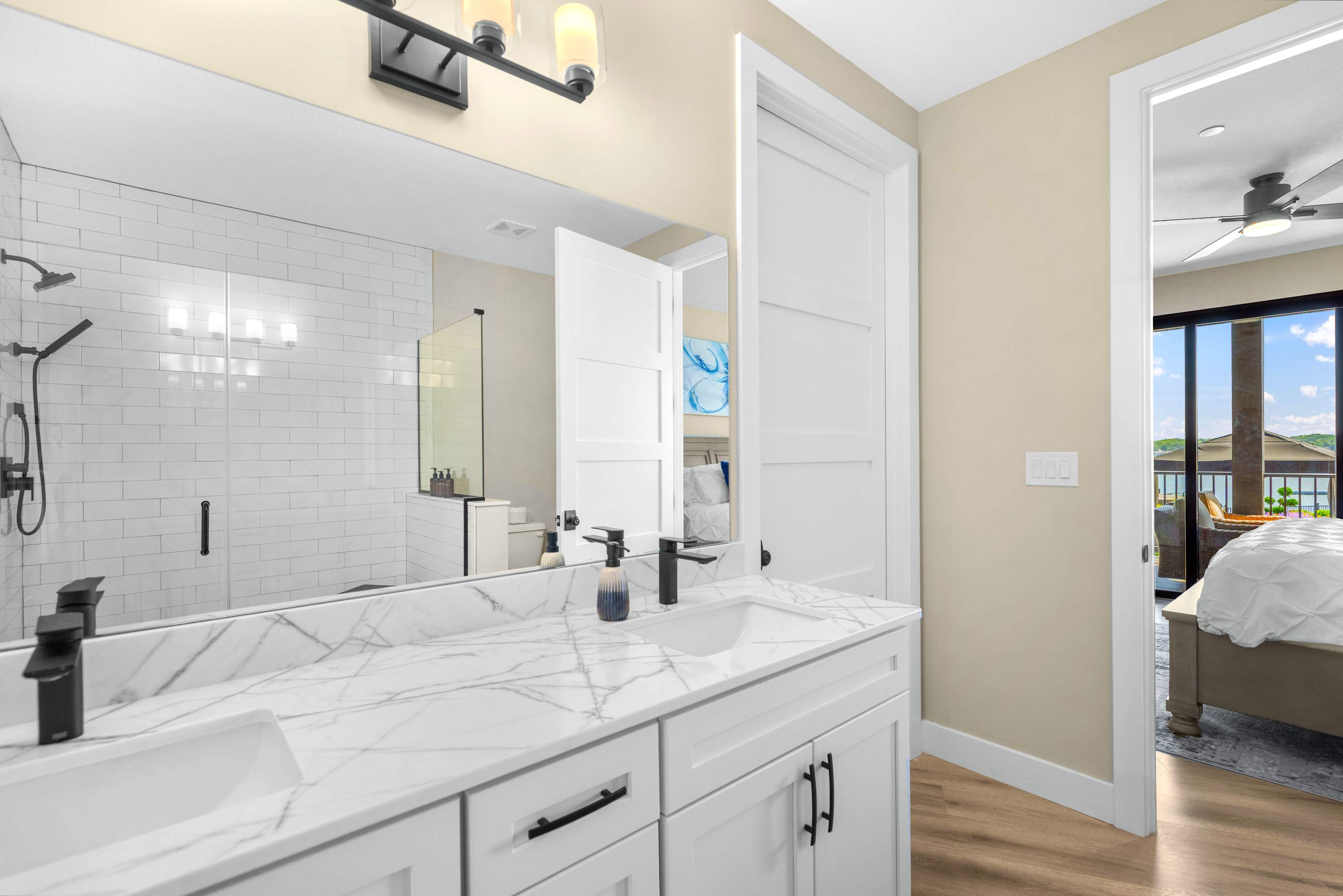 Bedroom #3 includes a king size bed, a smart TV, ceiling fan, patio access, and an ensuite bathroom with a dual vanity and a walk-in shower.