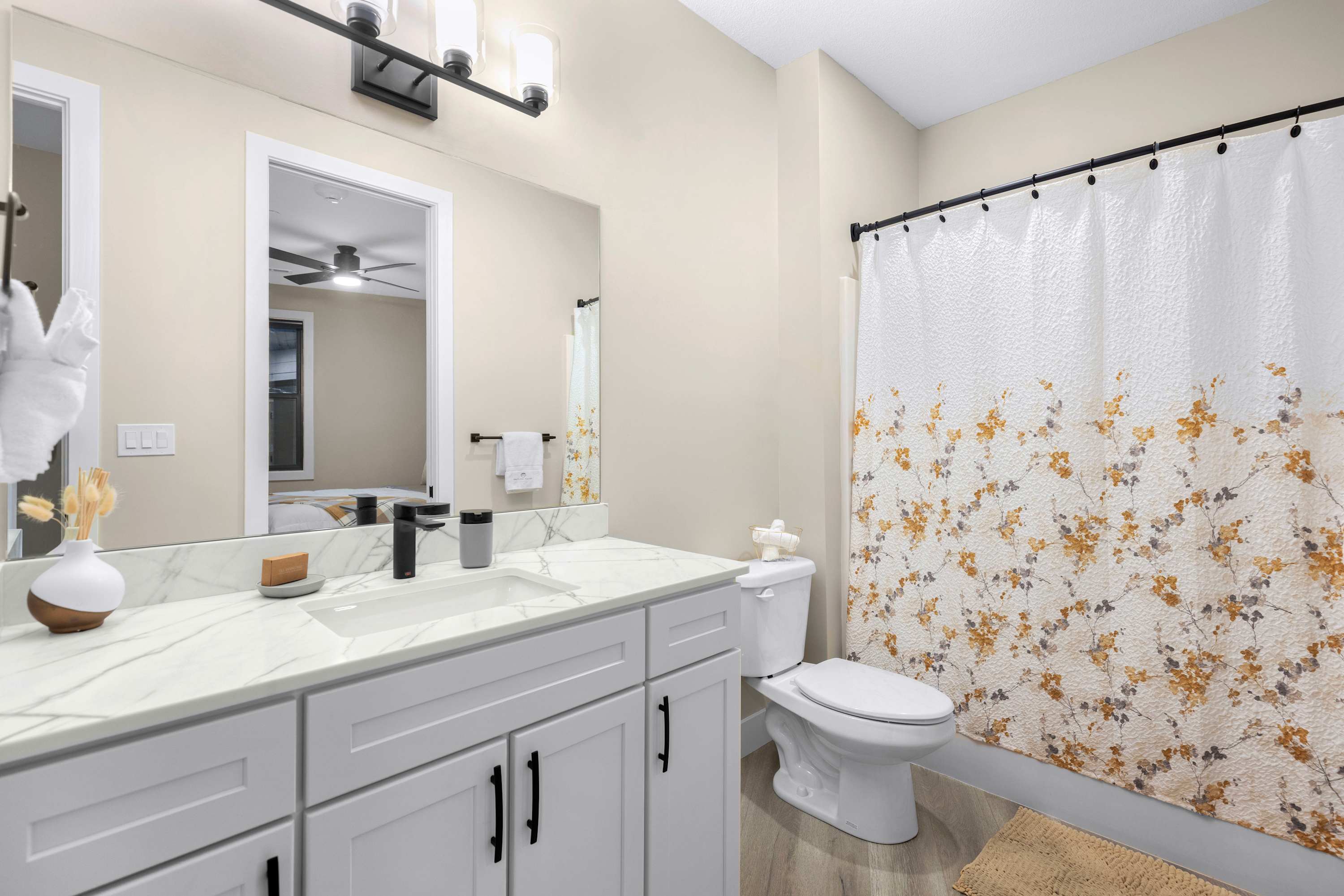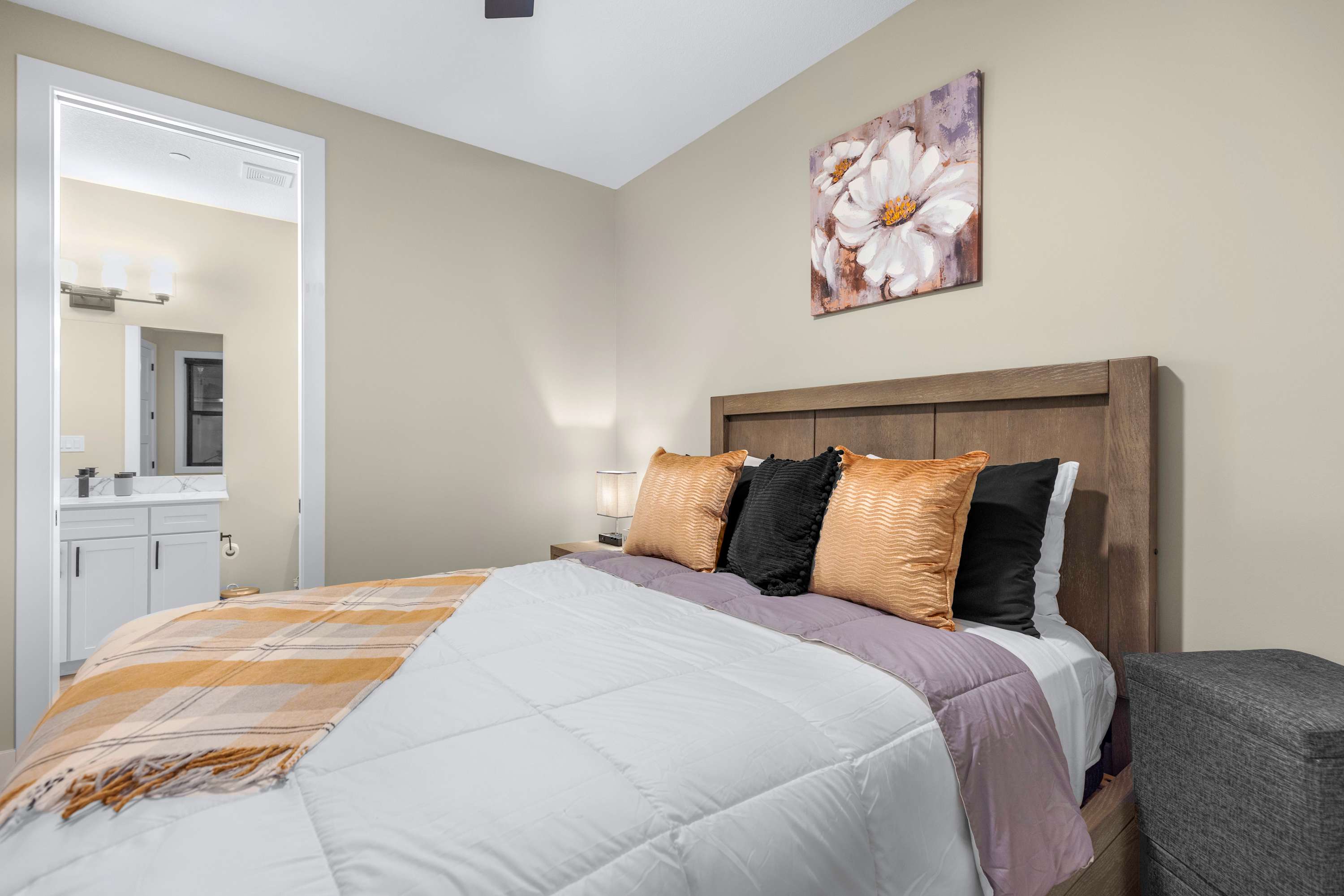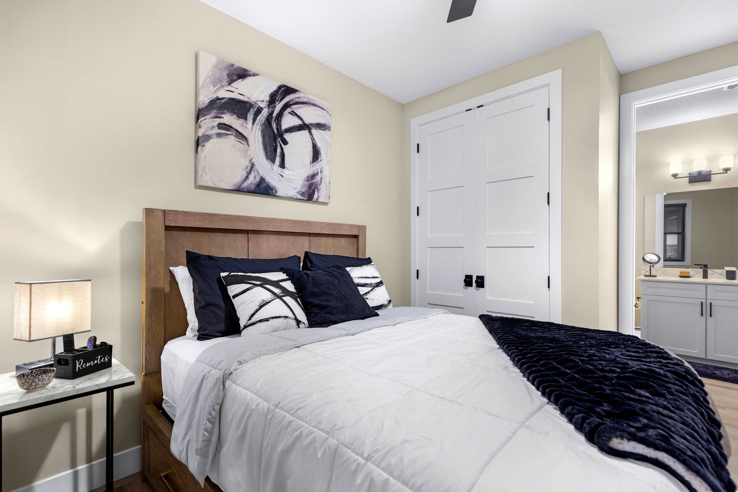 Bedroom #1 includes a queen size bed, a smart TV, ceiling fan, and an ensuite bathroom with a single vanity and a shower/tub combo.