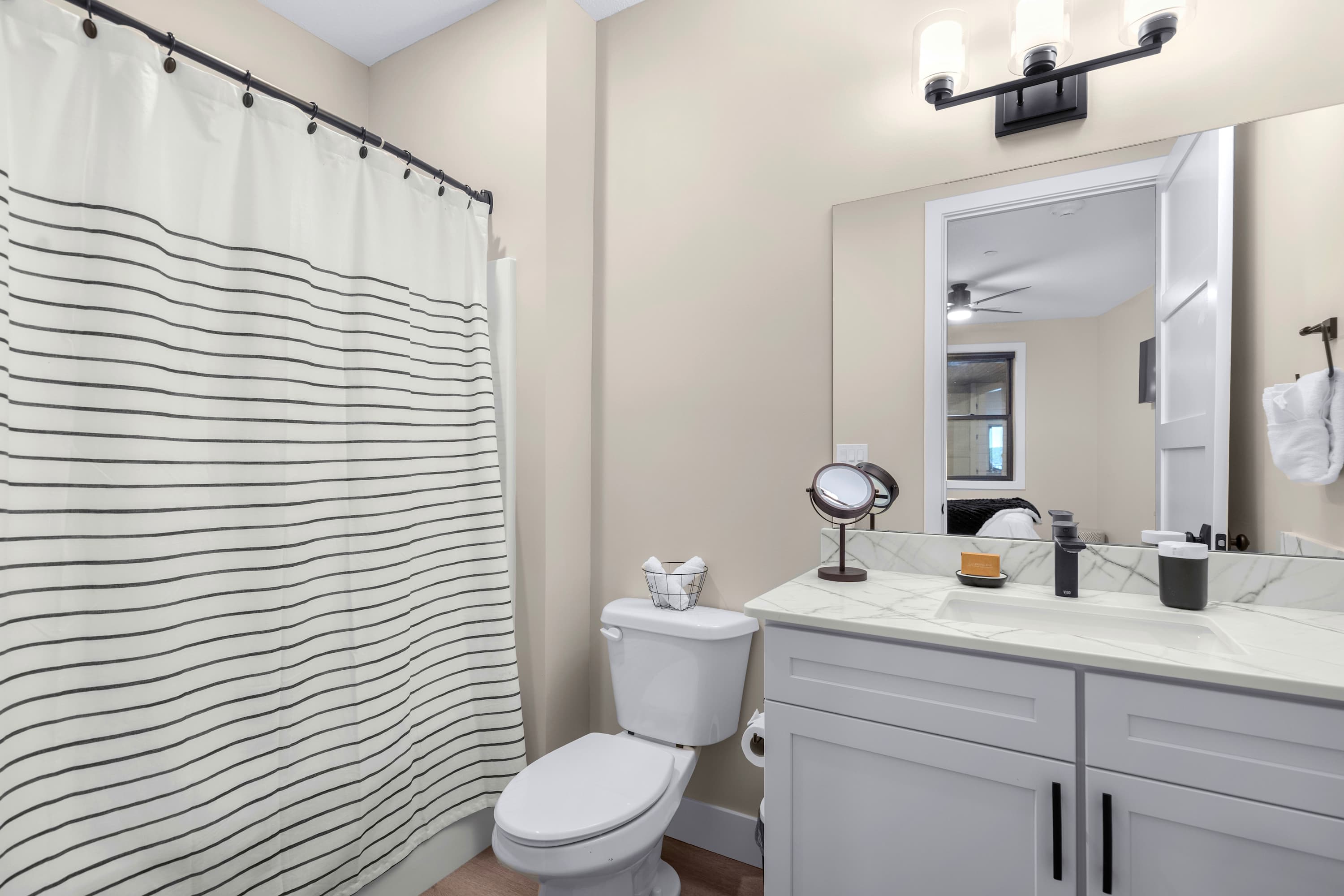 Bedroom #2 includes a queen size bed, a smart TV, ceiling fan, and an ensuite bathroom with a single vanity and a shower/tub combo.