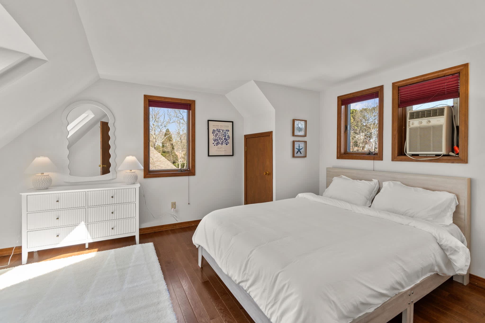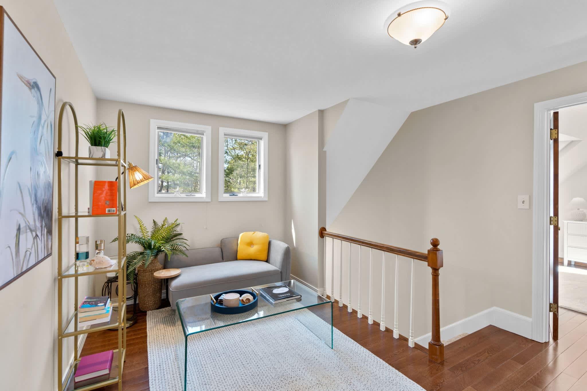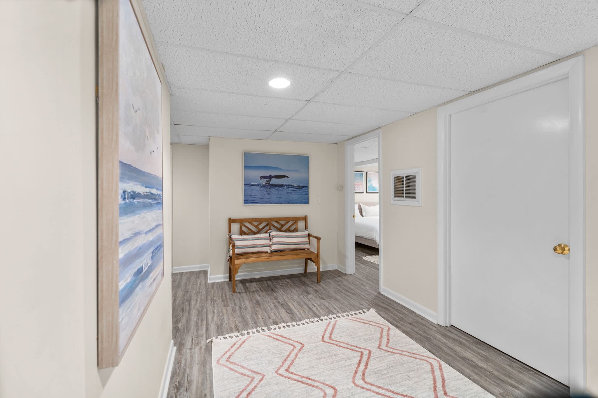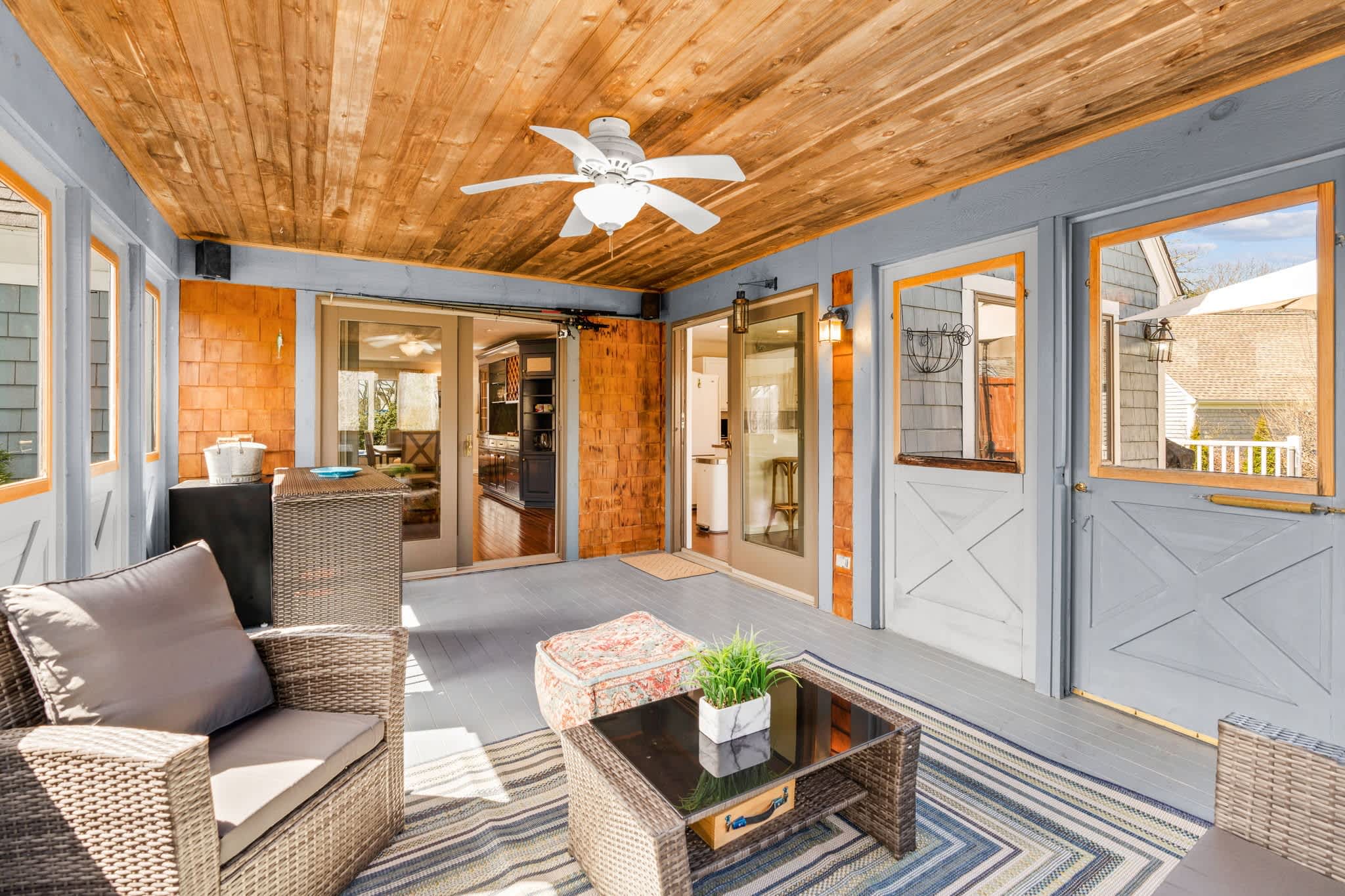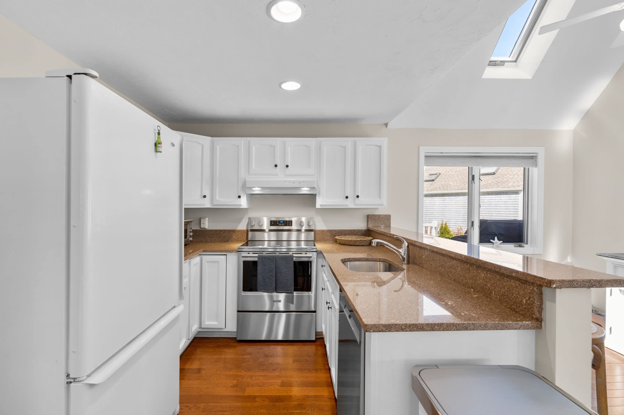 The living room welcomes you with warm tones, two plush couches, two comfy armchairs, a smart TV, and a fireplace for cool Cape evenings. Just off the main living area, discover a sunroom with soft seating—an ideal place for a quiet afternoon nap or late-night card game. Upstairs, a landing nook with seating gives you another tucked-away escape to unwind.
