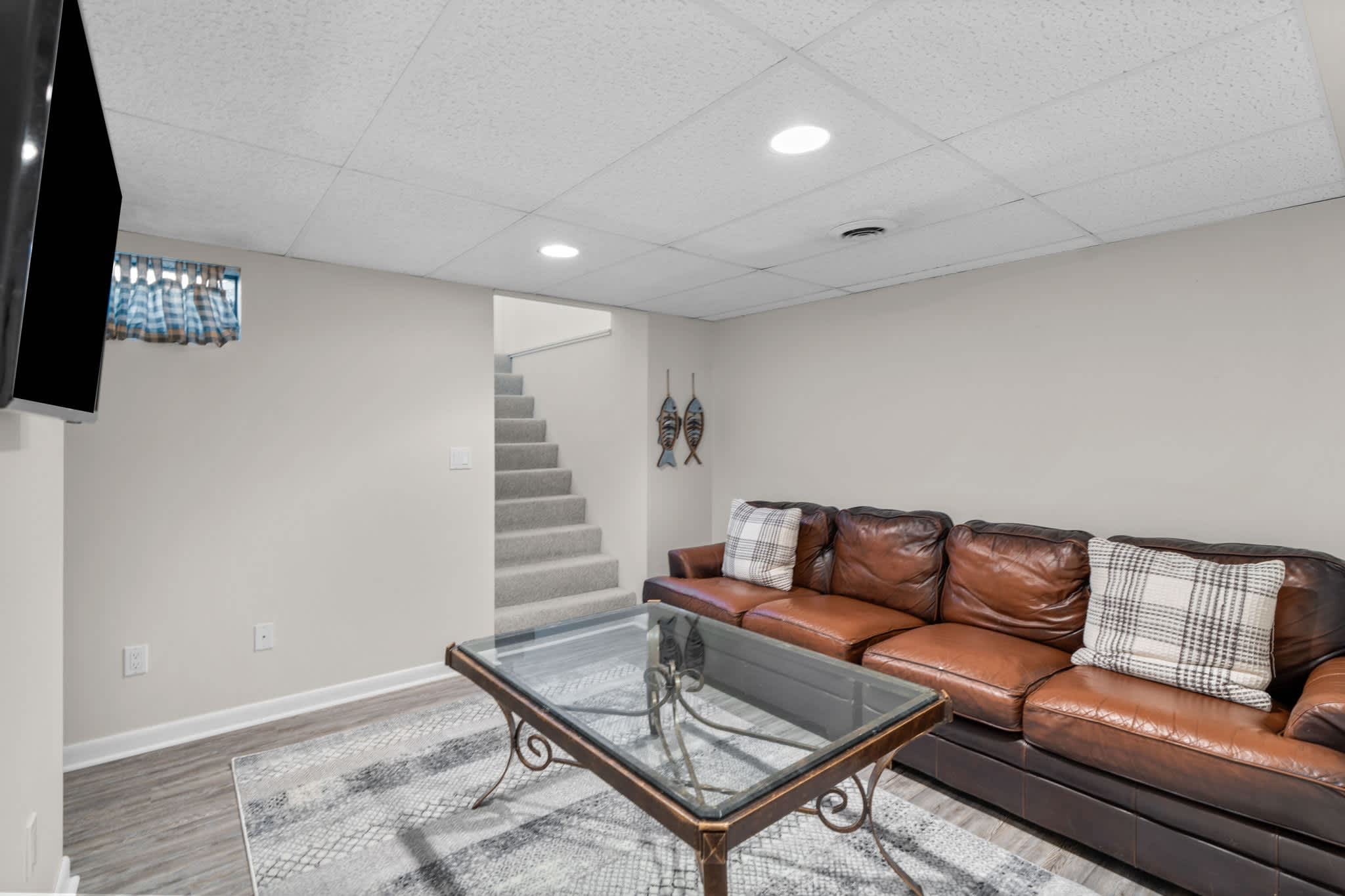 Outside, Cape Cod charm meets outdoor comfort. Dine al fresco at the deck’s table for six under the shade of an umbrella, fire up the grill for seafood feasts, or rinse off beach sand in the outdoor shower before gathering around the firepit for s’mores and stargazing. For rainy days or laid-back nights, head down to the basement game room, where you’ll find a couch, smart TV, and a collection of board games for family fun.
