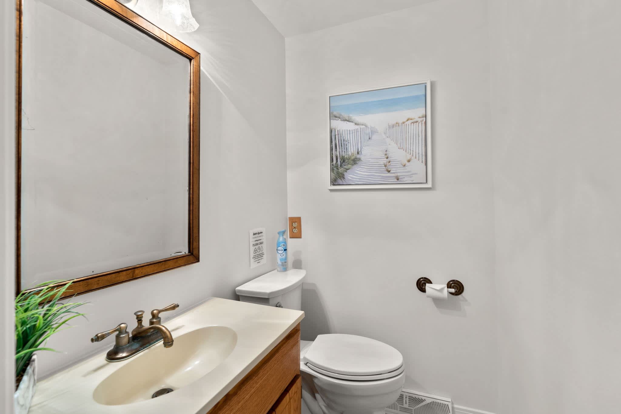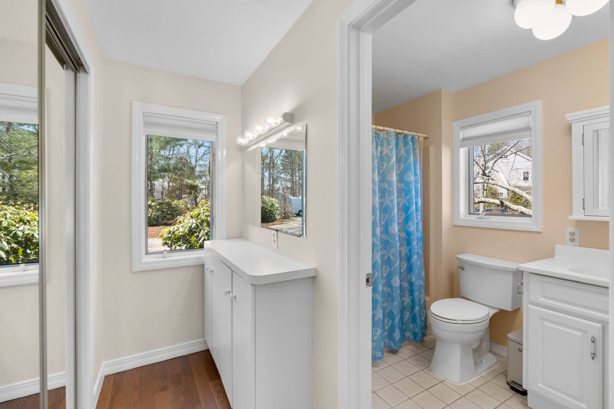 This home also includes a half bathroom and 2 additional full bathrooms, one with a single vanity and a shower/tub combo and another with a single vanity and a walk-in shower.