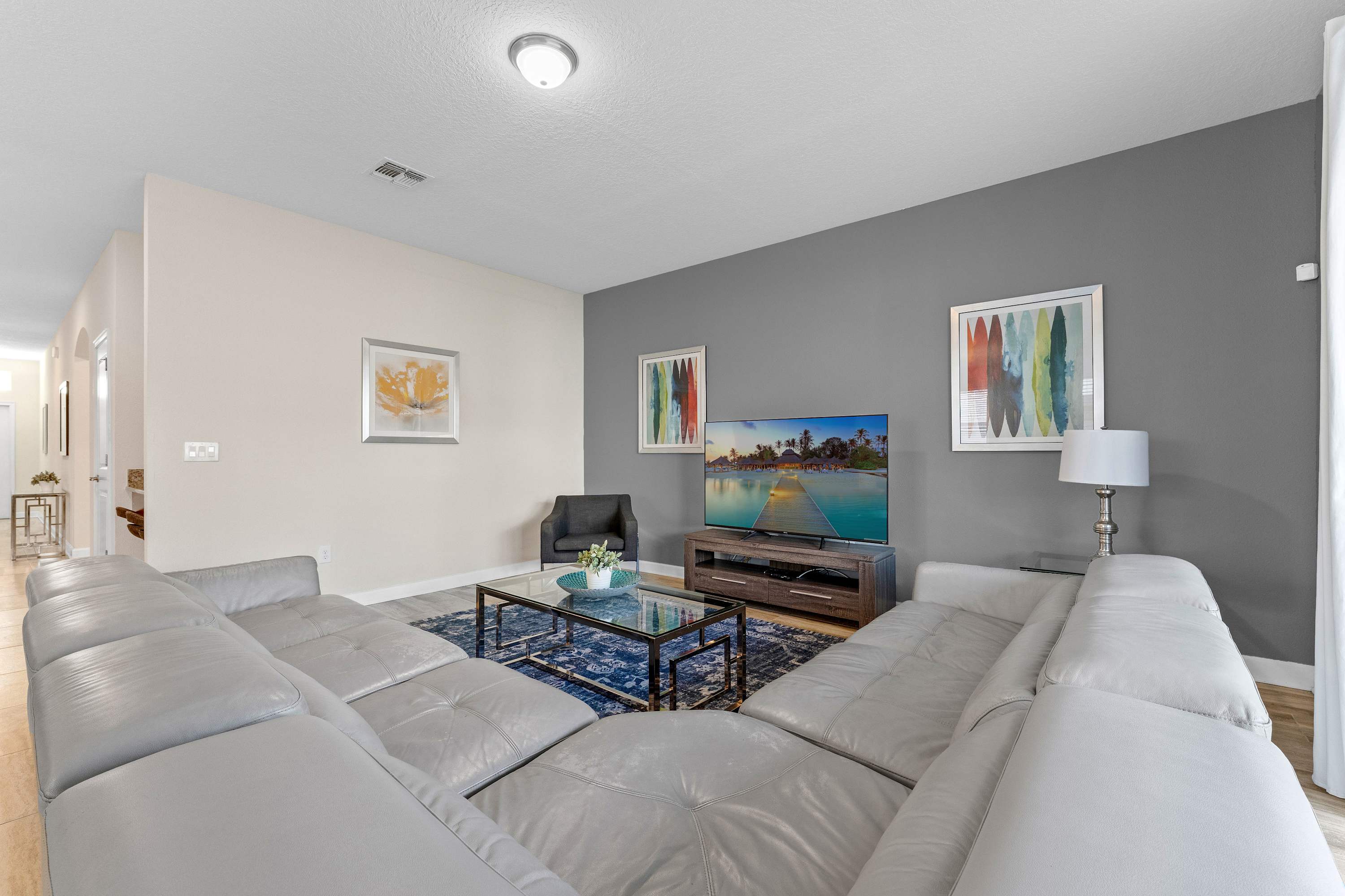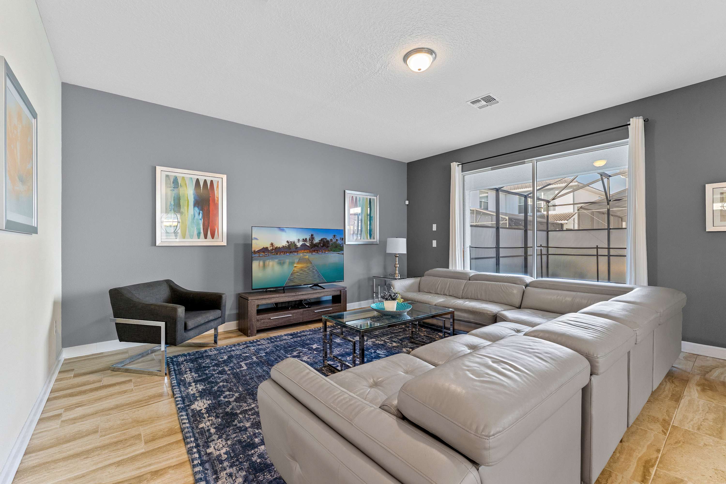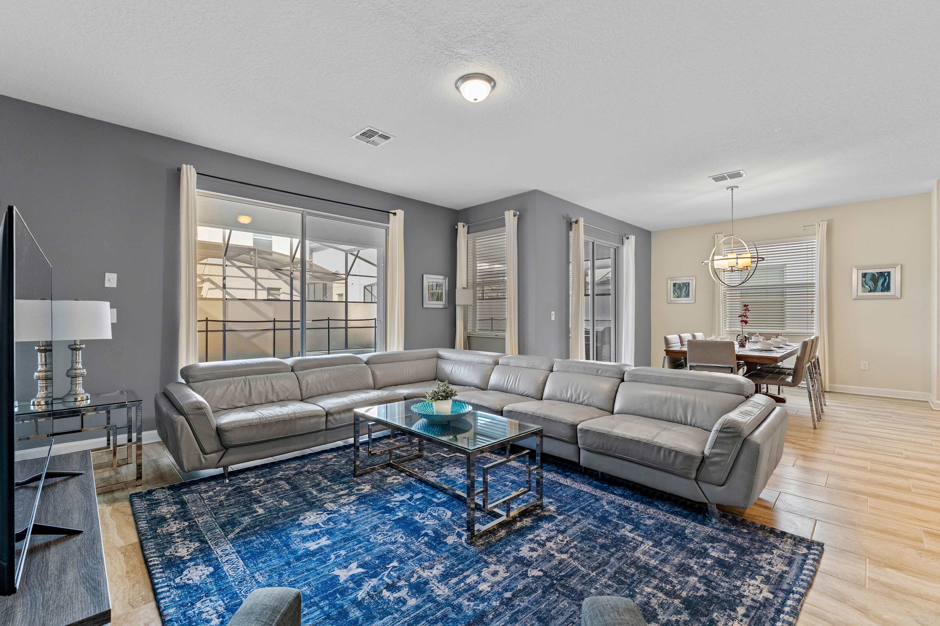 Step into your private sanctuary starting with the screened-in lanai, where a tranquil outdoor haven awaits. A dining table for six sits beneath the covered patio—perfect for alfresco meals. Beyond it, the sparkling inground pool and bubbling hot tub invite you to relax in the Florida sunshine, while safety gates around the pool ensure peace of mind for families with little ones. Lounge chairs provide a quiet corner to soak up the sun, and when you're ready to head inside, the space flows beautifully through sliding glass doors into a cozy, upscale living room. Here, a leather sectional wraps around a large smart TV, creating a plush gathering space for movie nights or morning coffee.