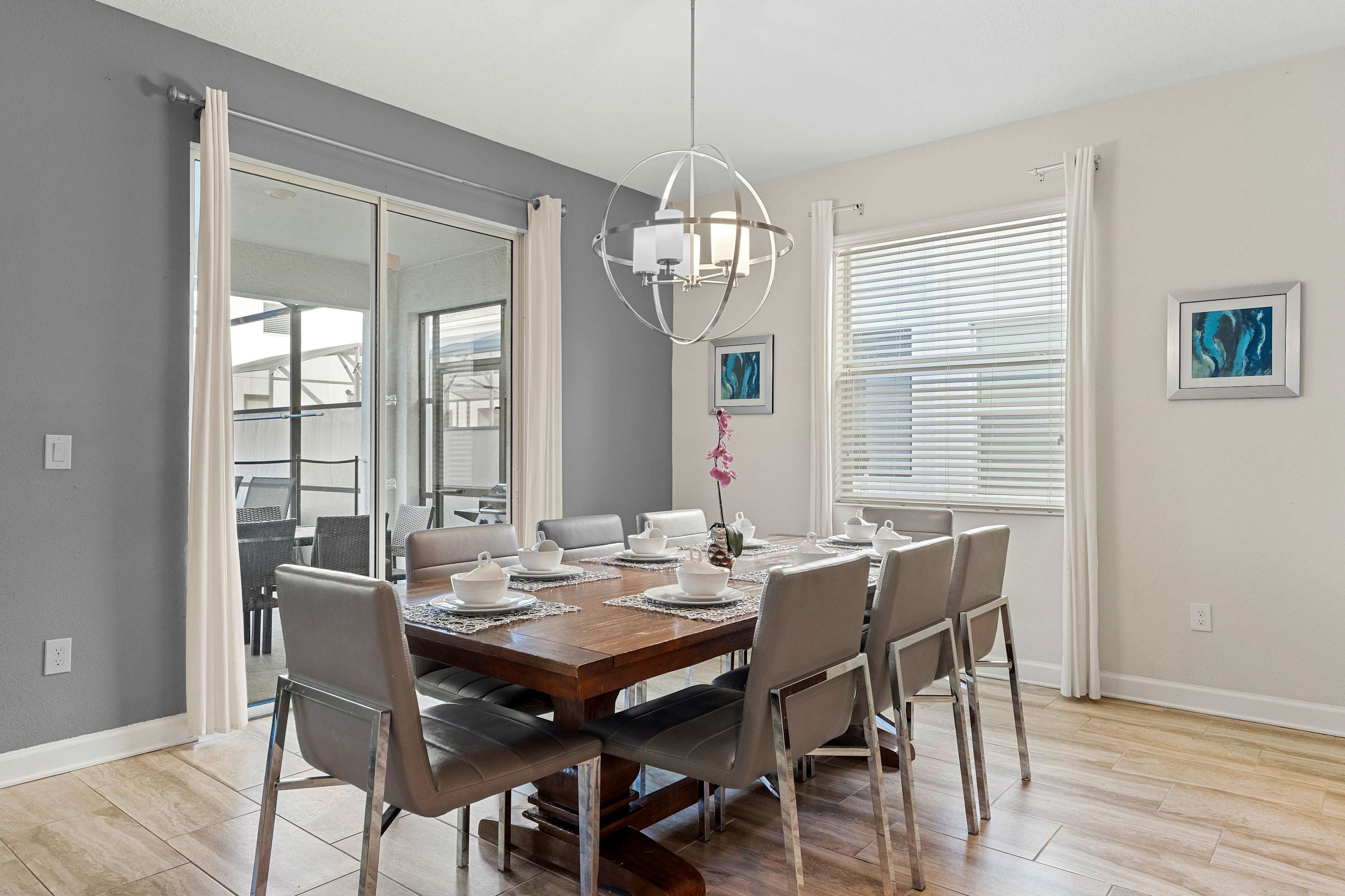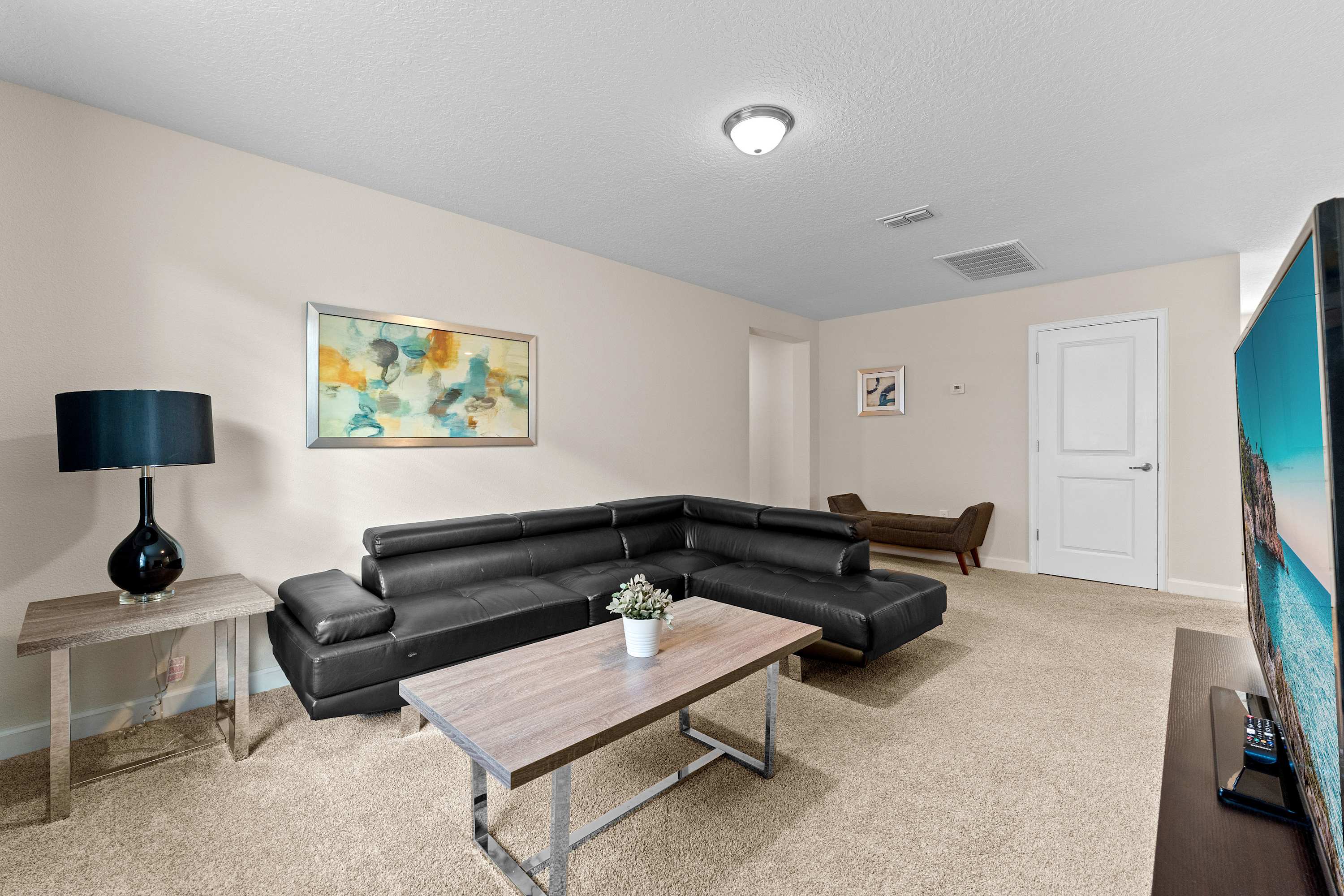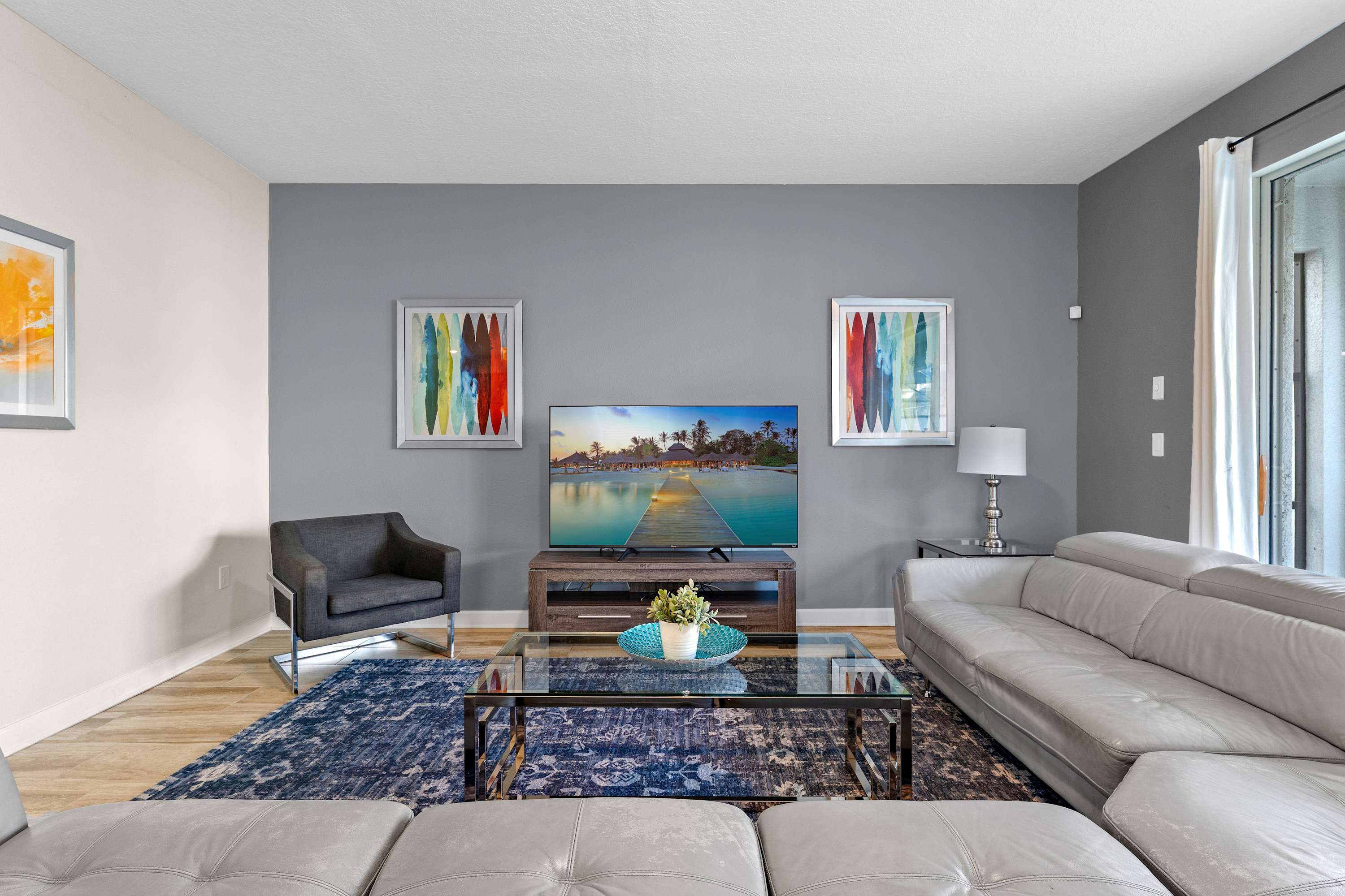 Step into your private sanctuary starting with the screened-in lanai, where a tranquil outdoor haven awaits. A dining table for six sits beneath the covered patio—perfect for alfresco meals. Beyond it, the sparkling inground pool and bubbling hot tub invite you to relax in the Florida sunshine, while safety gates around the pool ensure peace of mind for families with little ones. Lounge chairs provide a quiet corner to soak up the sun, and when you're ready to head inside, the space flows beautifully through sliding glass doors into a cozy, upscale living room. Here, a leather sectional wraps around a large smart TV, creating a plush gathering space for movie nights or morning coffee.