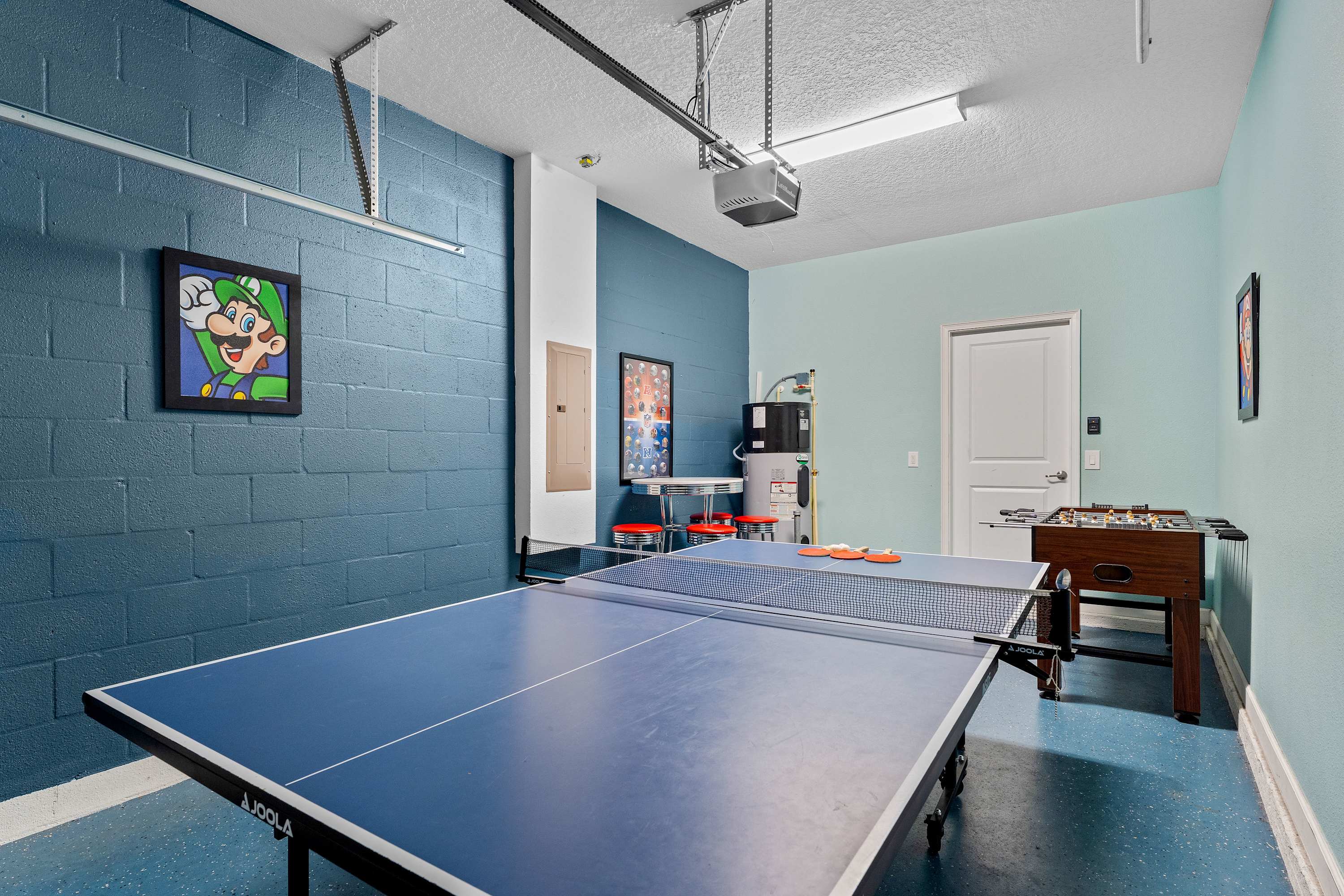 Outfitted with rich redwood cabinetry, brown granite countertops, and sleek stainless steel appliances, the kitchen is as functional as it is beautiful. Pull up a stool at the breakfast bar for a casual bite, or enjoy a more formal meal at the dining table that seats eight and opens right up to the pool area through sliding glass doors. For a bit of indoor fun, head to the game room, decked out with a ping pong table, foosball, and Mario-themed décor that brings a nostalgic touch to your stay. A high-top café table makes it the perfect hangout space for both kids and adults. Upstairs, a spacious loft offers another spot to unwind, with a sectional, daybed, and TV—ideal for gaming, reading, or simply kicking back after a full day of adventure.