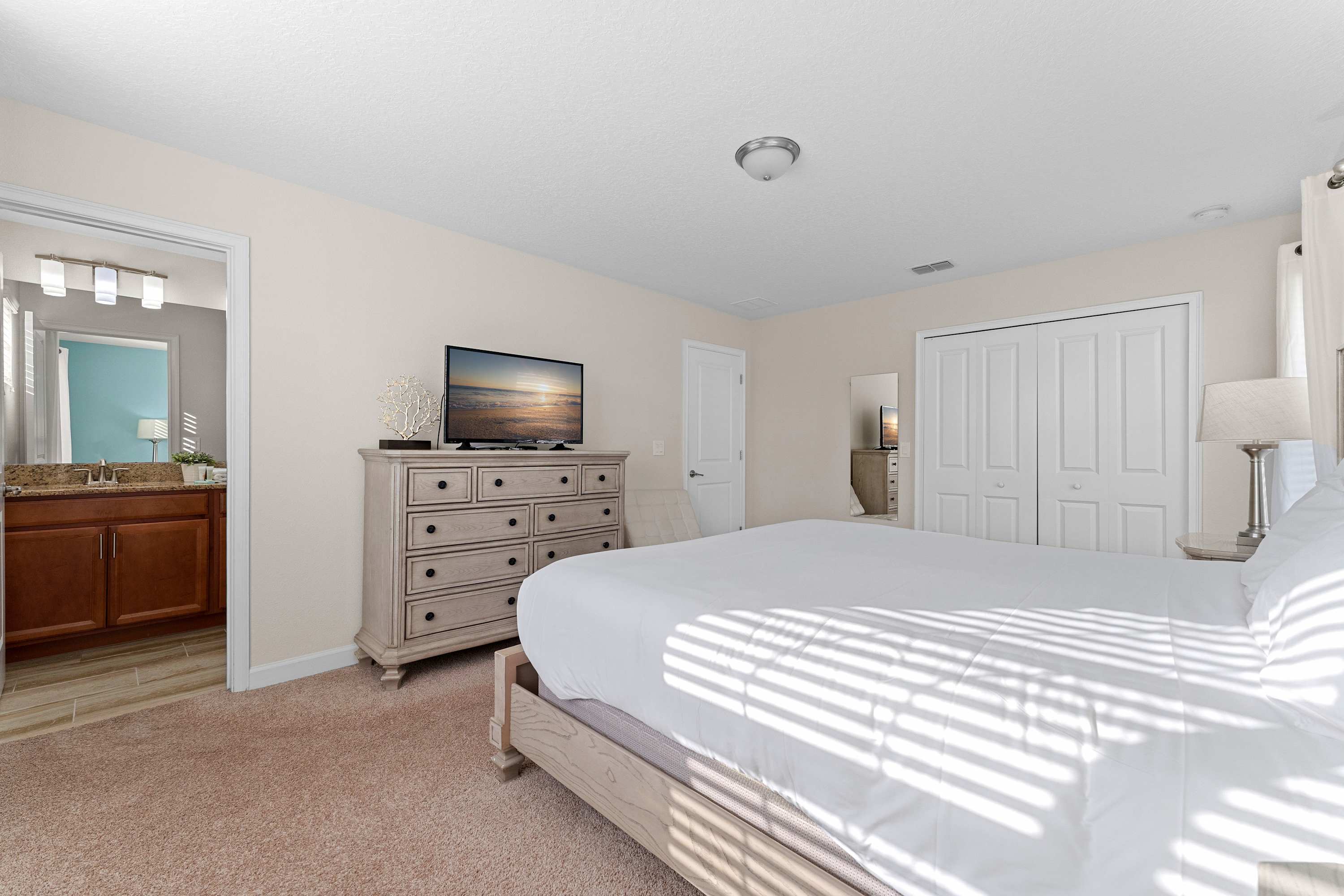 Bedroom #4 includes a king size bed, a TV, and an ensuite bathroom with a dual vanity, a soaking tub, and a walk-in shower.