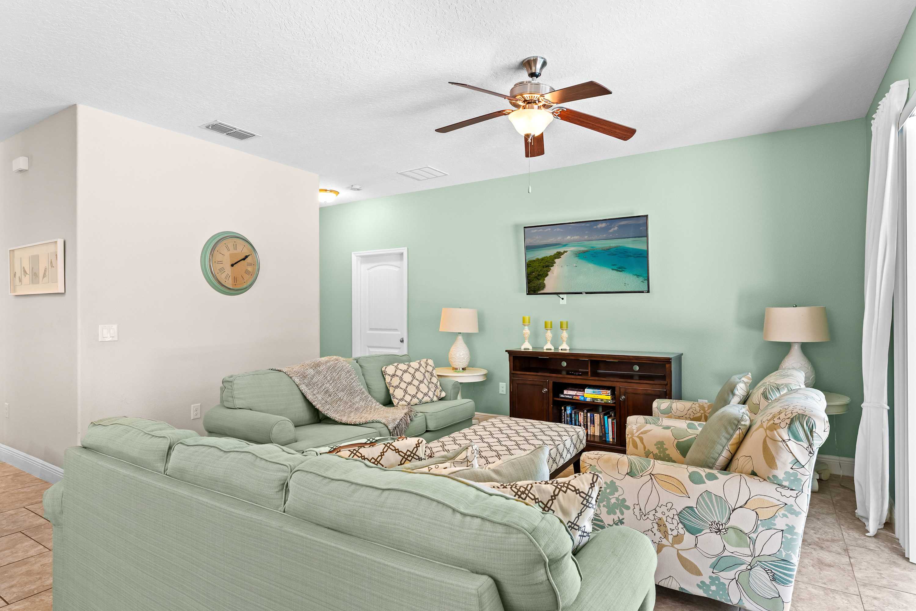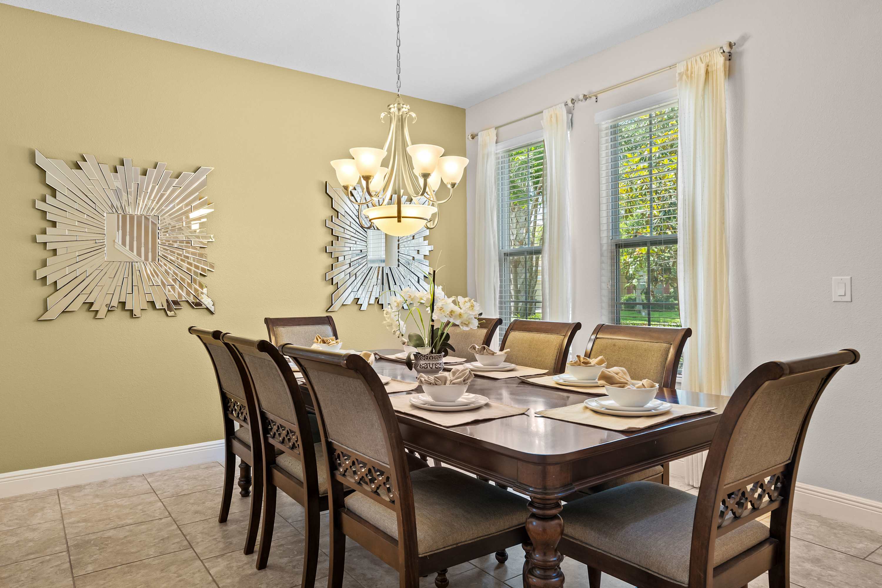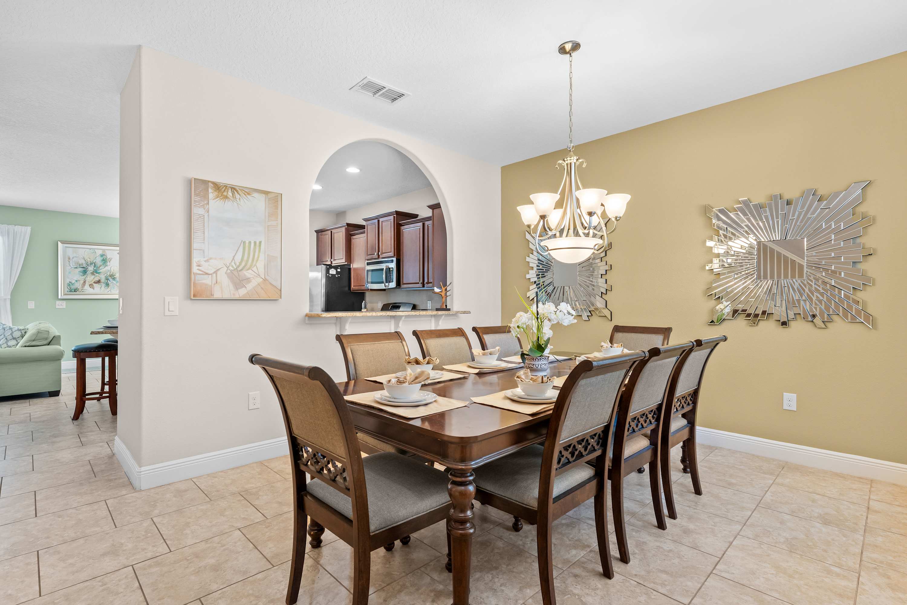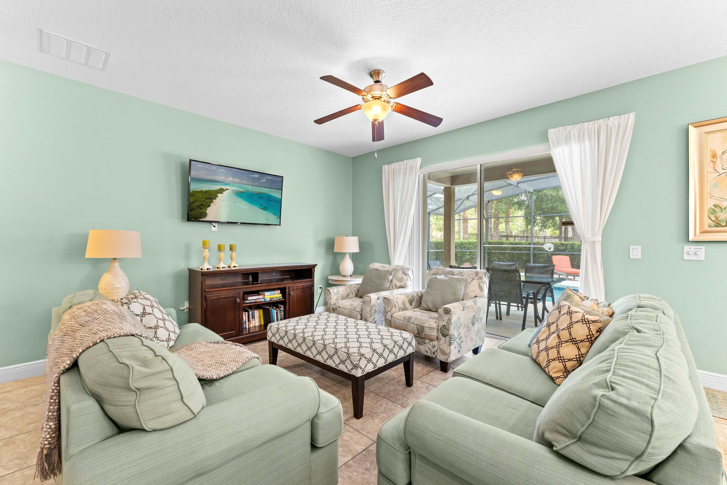 The home itself is an experience all its own, designed to make every guest feel both pampered and at ease. Start your day outside in the spacious screened-in lanai, where the private pool glistens beneath the morning sun. Sip coffee at the outdoor dining table that seats eight, soak in the bubbling hot tub, or recline in one of the inviting lounge chairs as palm trees sway in the background. Inside, the open-concept living room welcomes you with two cozy couches, floral accent chairs, and a large smart TV—ideal for movie nights or lazy afternoons. The space flows effortlessly into the formal dining room, with a large table for eight, perfect for shared meals or celebrations.