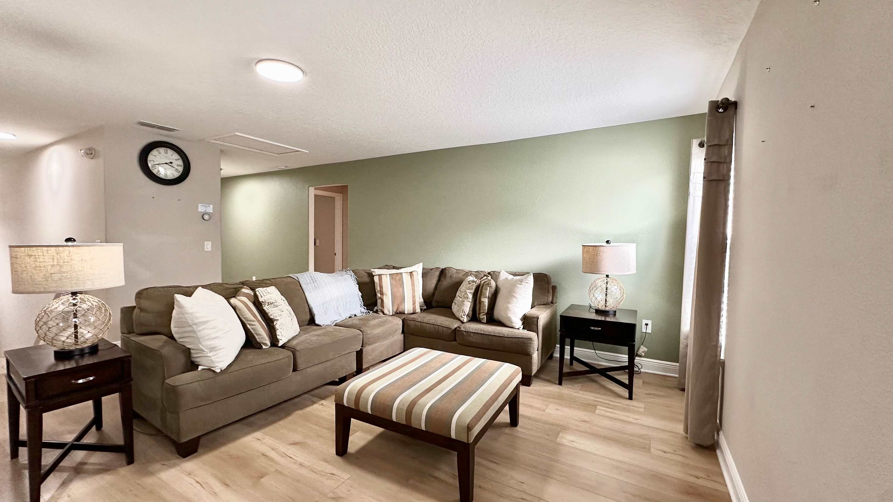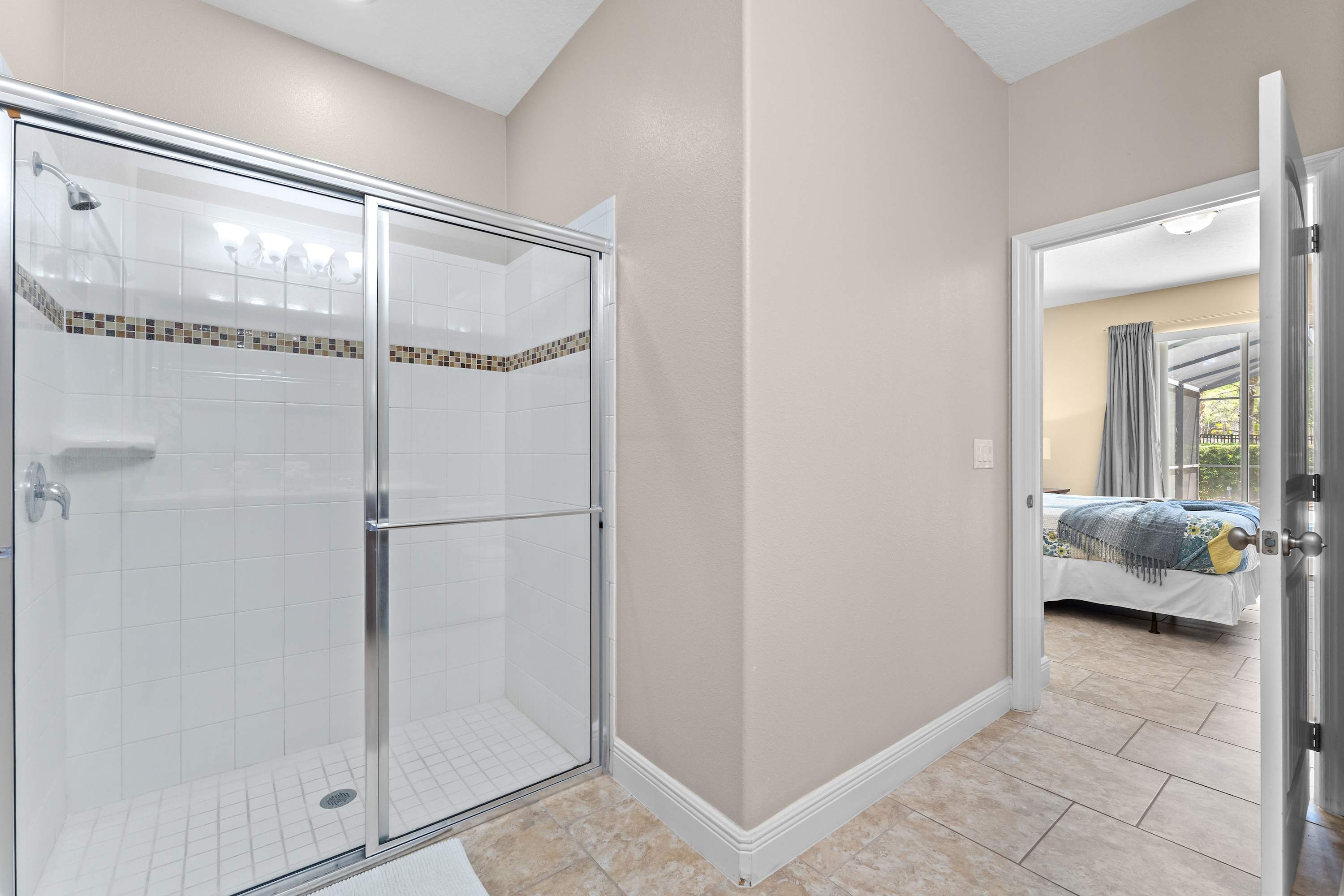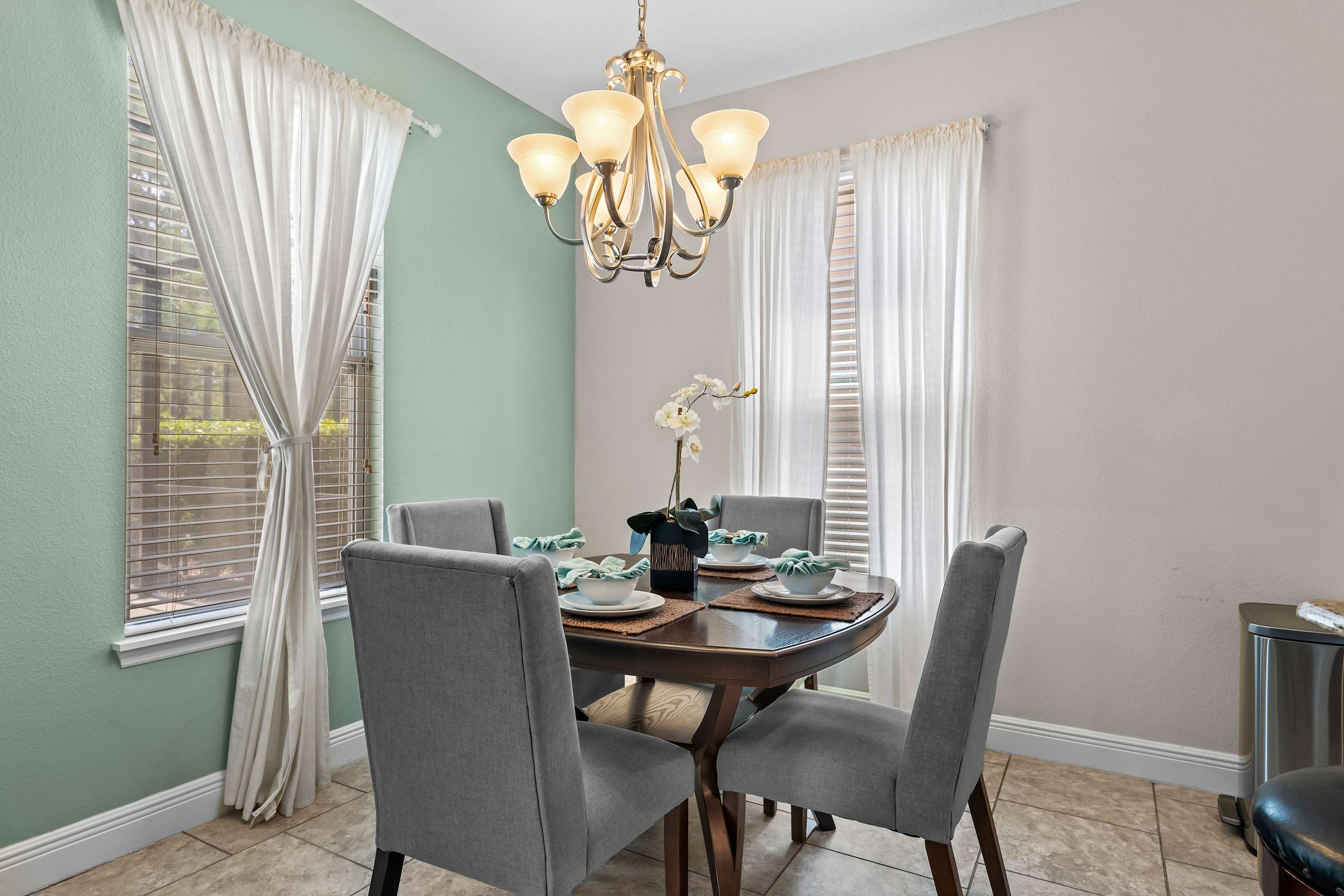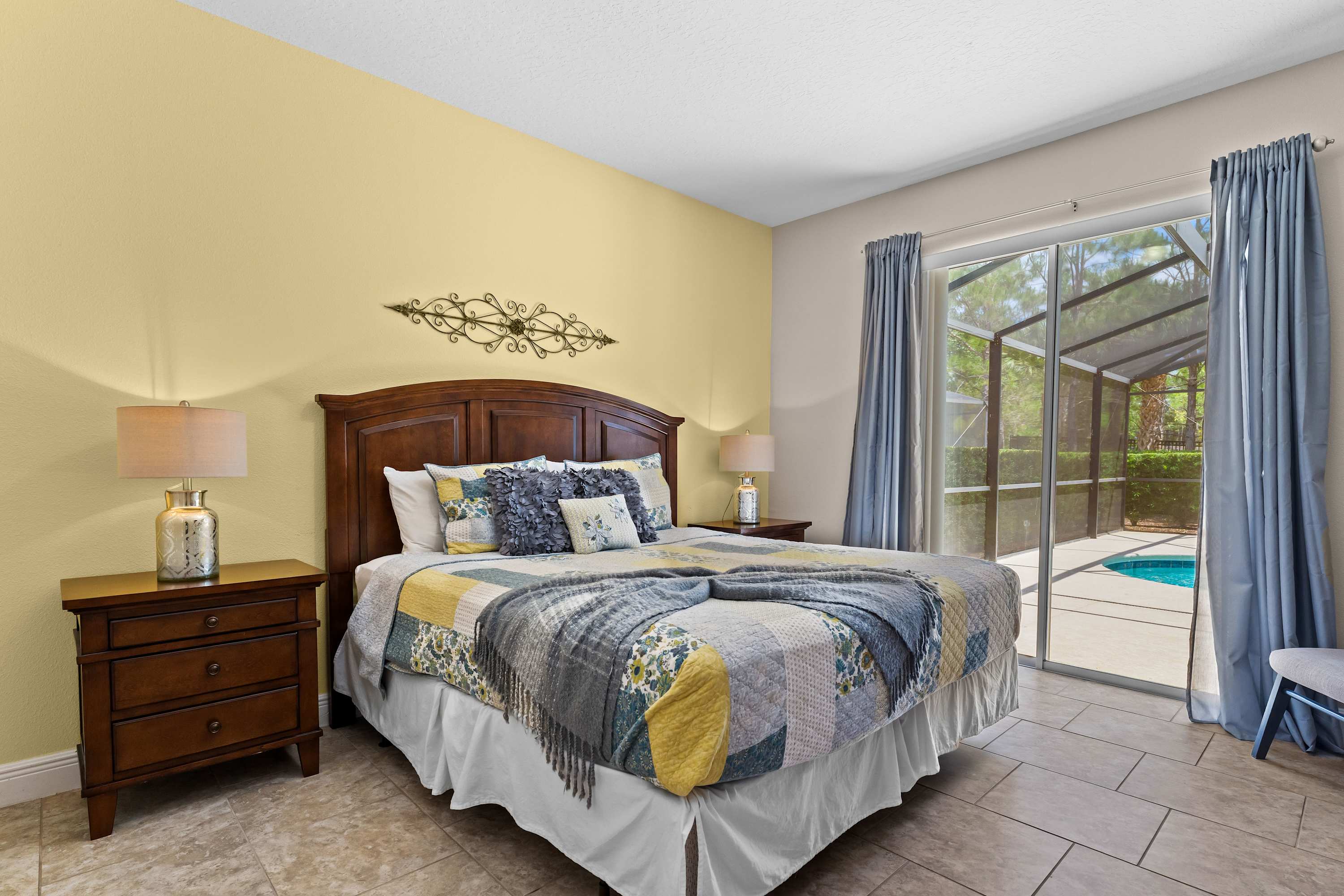 The home itself is an experience all its own, designed to make every guest feel both pampered and at ease. Start your day outside in the spacious screened-in lanai, where the private pool glistens beneath the morning sun. Sip coffee at the outdoor dining table that seats eight, soak in the bubbling hot tub, or recline in one of the inviting lounge chairs as palm trees sway in the background. Inside, the open-concept living room welcomes you with two cozy couches, floral accent chairs, and a large smart TV—ideal for movie nights or lazy afternoons. The space flows effortlessly into the formal dining room, with a large table for eight, perfect for shared meals or celebrations.